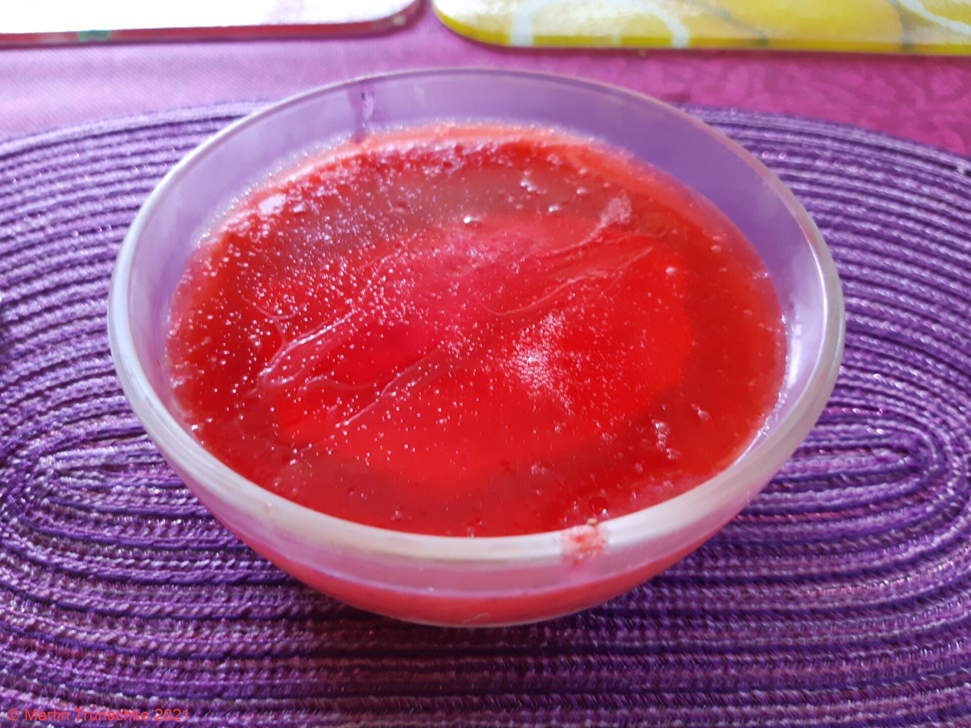 | Als Nachtisch gab es vom Vortag übrig gebliebenen Pudding mit Erdbeermark und Kuchenglasur.