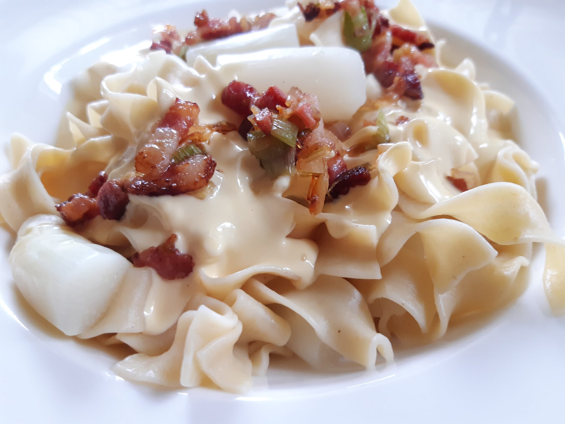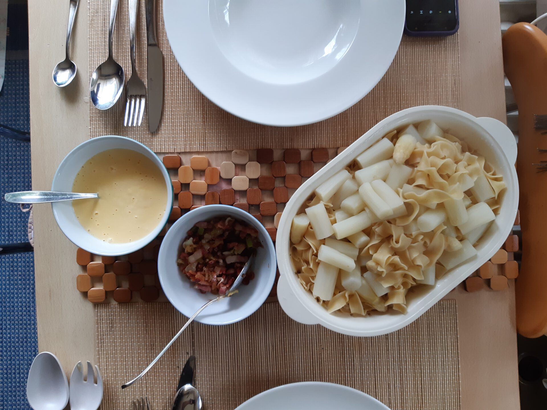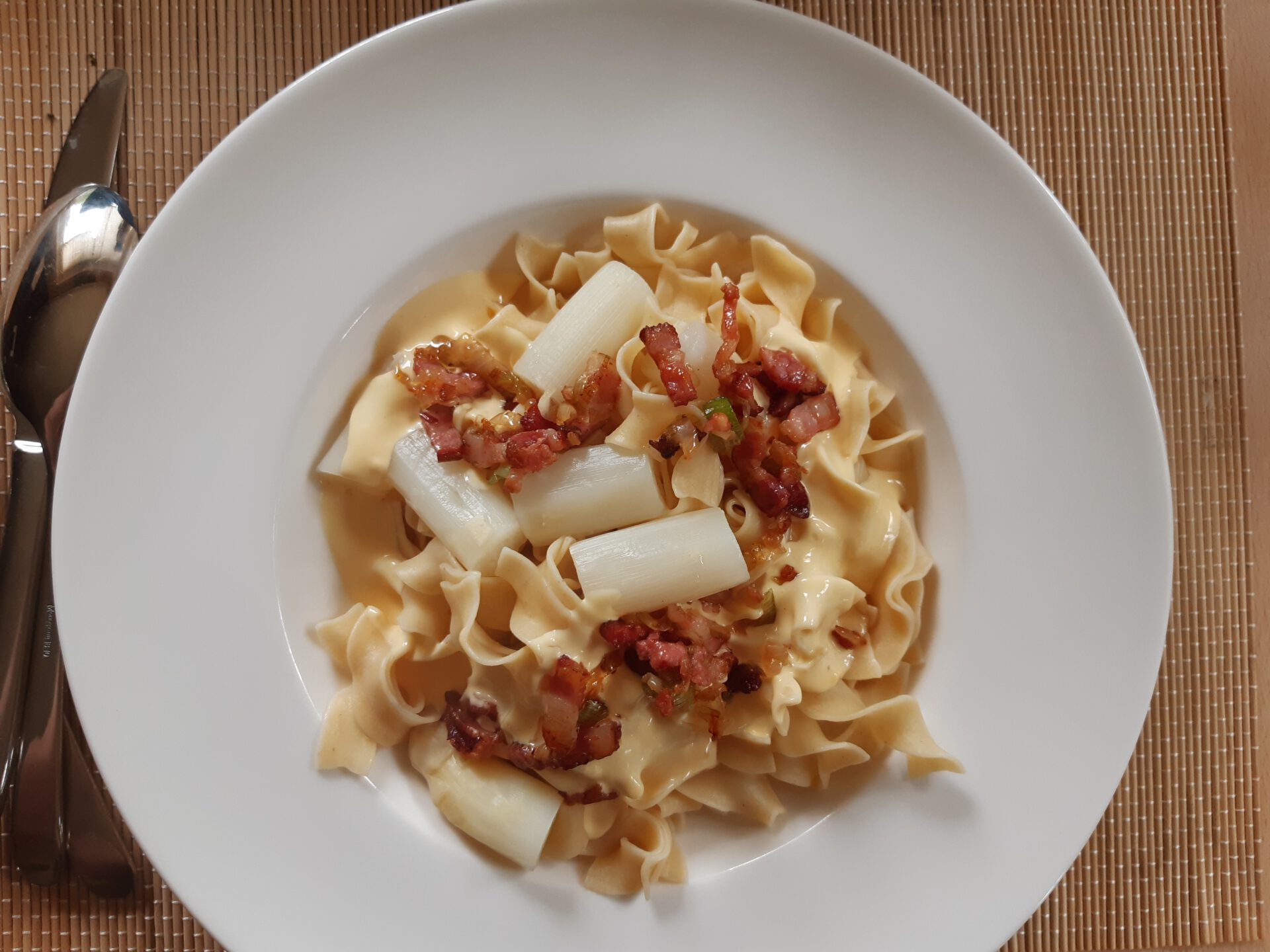 2. Alles schön auf einem warmen Teller anrichten und es sich schmecken lassen. Es macht sehr satt.Spargel