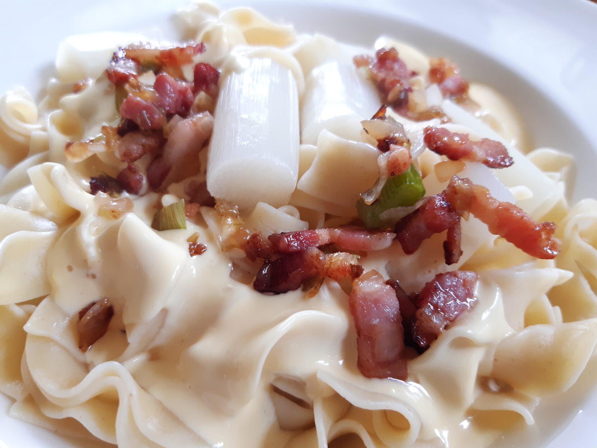 1. Bauchspeck würfeln und im Butterschmalz anbraten. Die Frühlingzwiebeln würfeln und zu dem Speck geben und glasig braten.