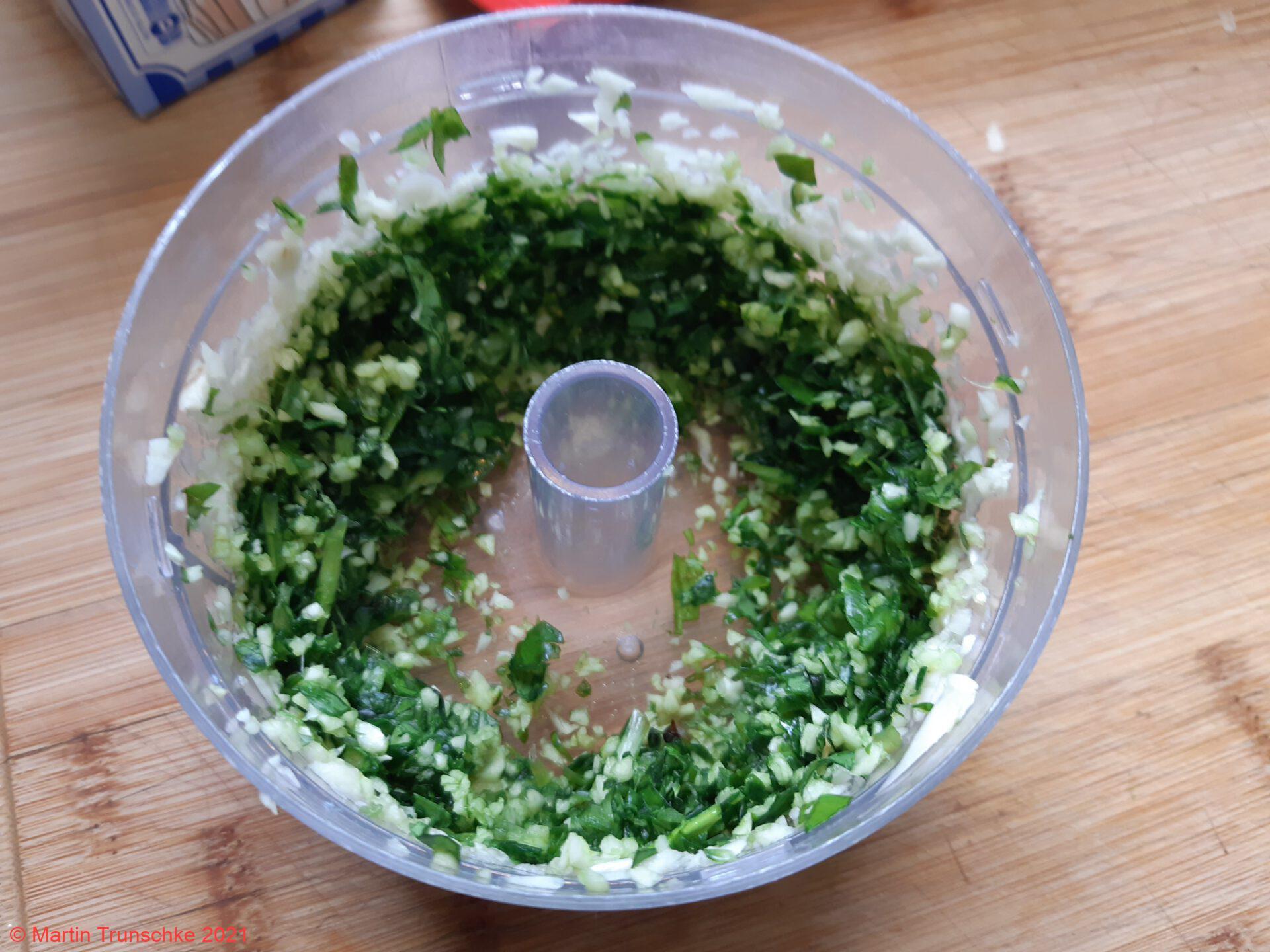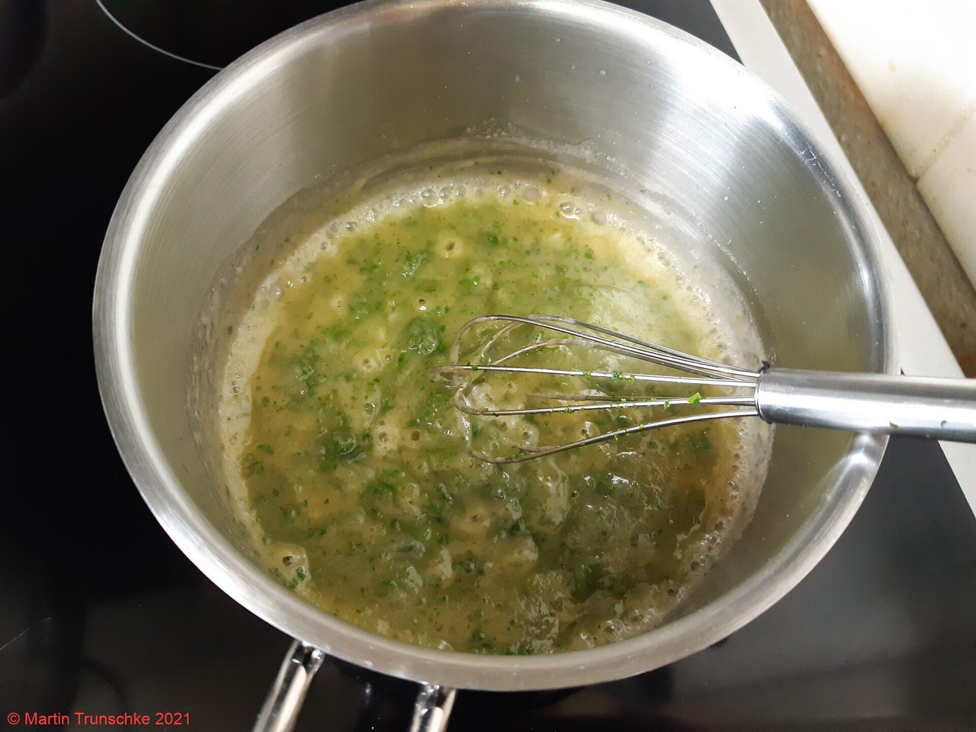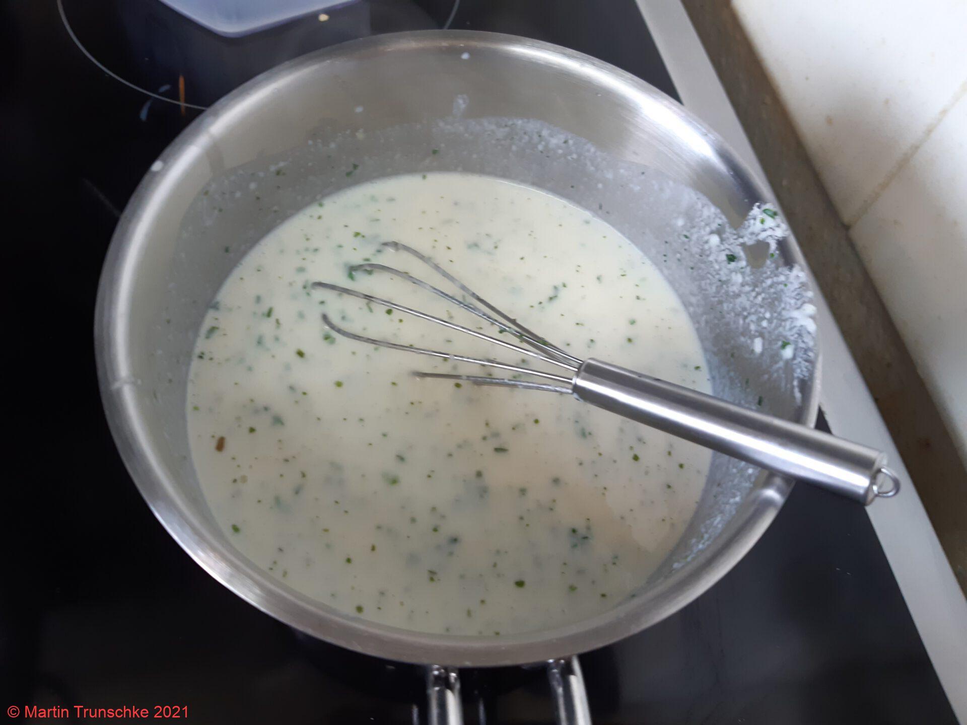 - Die Butter in einer Kasserolle schmelzen und heiß werden lassen. Dann das Mehl einstreuen und wie wild mit einem kleinen Schneebesen rühren. Die Kräuter einstreuen und weiterrühren, bis die Mischung kurz vor dem bräunen ist. Nun die Milch nach und nach angießen...rühren...rühren...rühren. Kurz aufkochen, weiter rühren. evt. Milch dazu geben bis ihr die gewünschte Konsistenz habt.