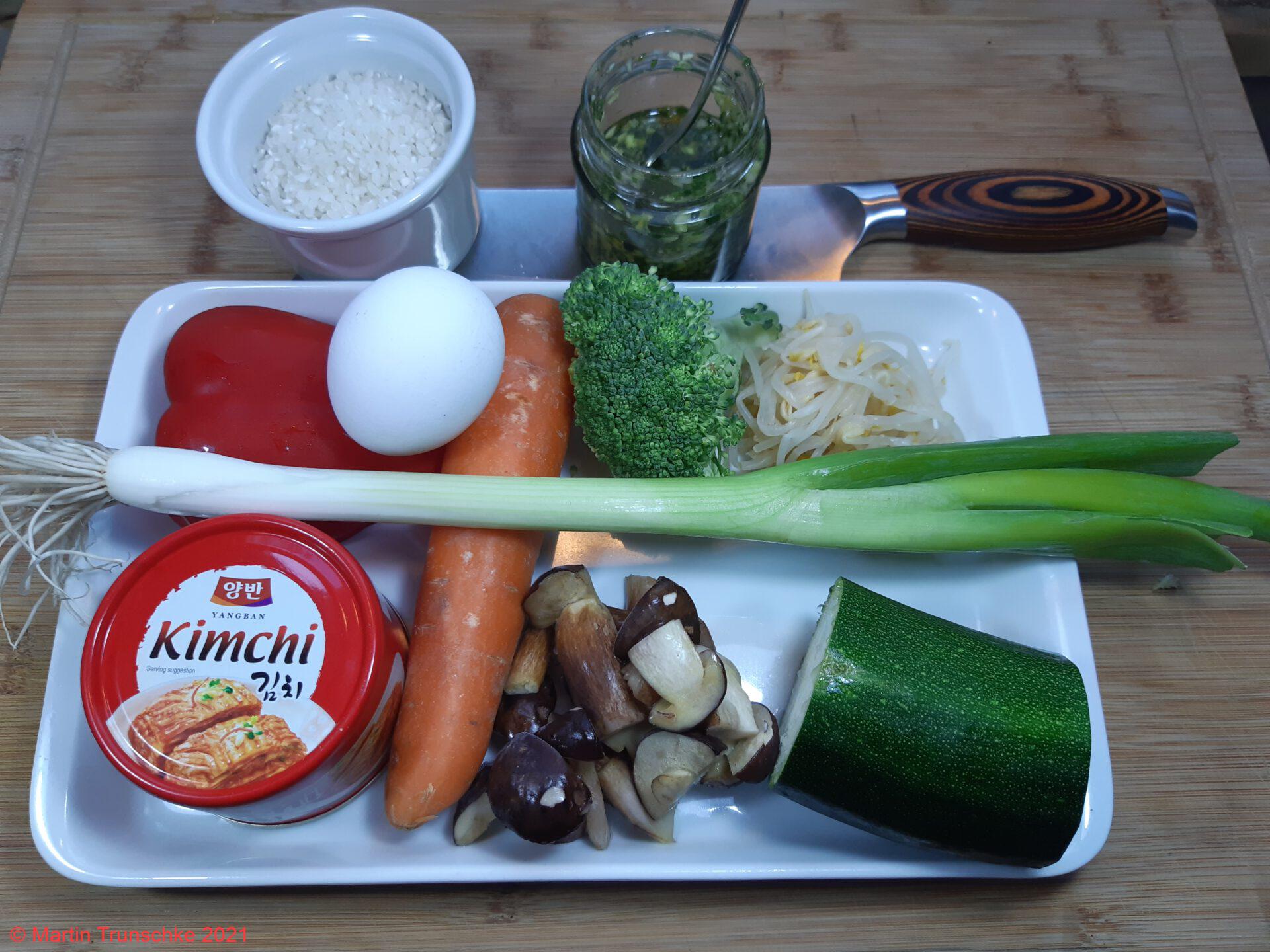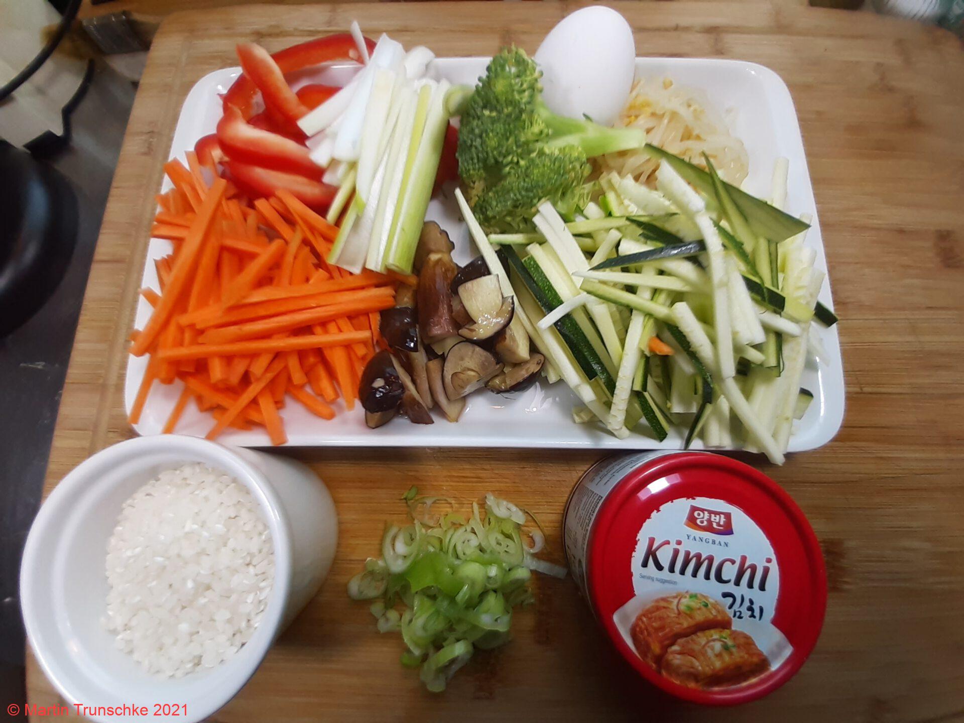 - Frühlingszwiebeln, Möhre, Paprika, Pilze und Zucchini in Julienne schneiden und mit dem Kimchi und Mungbohnensprossen auf einer Platte bereit stellen.