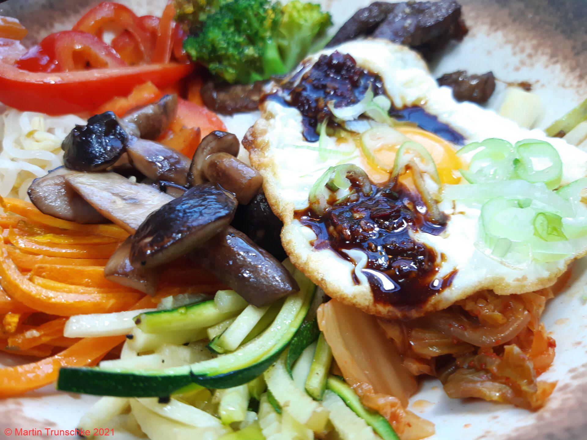 - Den Reis nach Packungsanweisung kochen. Währenddessen das Gemüse und so nacheinander in einem Wok in Sonnenblumenöl 1-2 Minuten bissfest braten und bei 75°C im Backofen auf einer Platte warm halten. Sprossen und Kimchi ebenfalls im Backofen erwärmen. Das Fleisch (samt Marinade) ebenfalls (nur seeehr kurz) anbraten und warm halten.