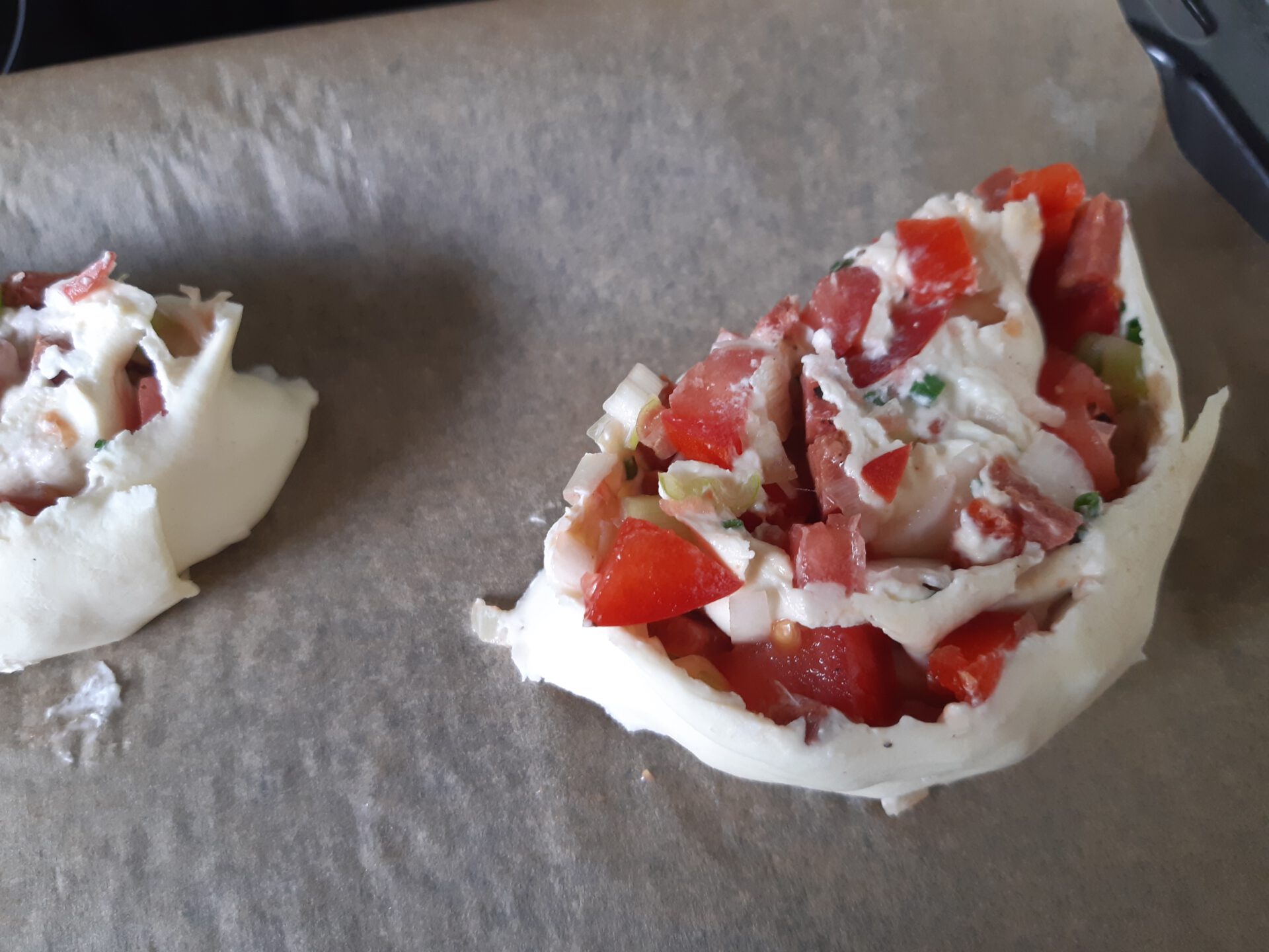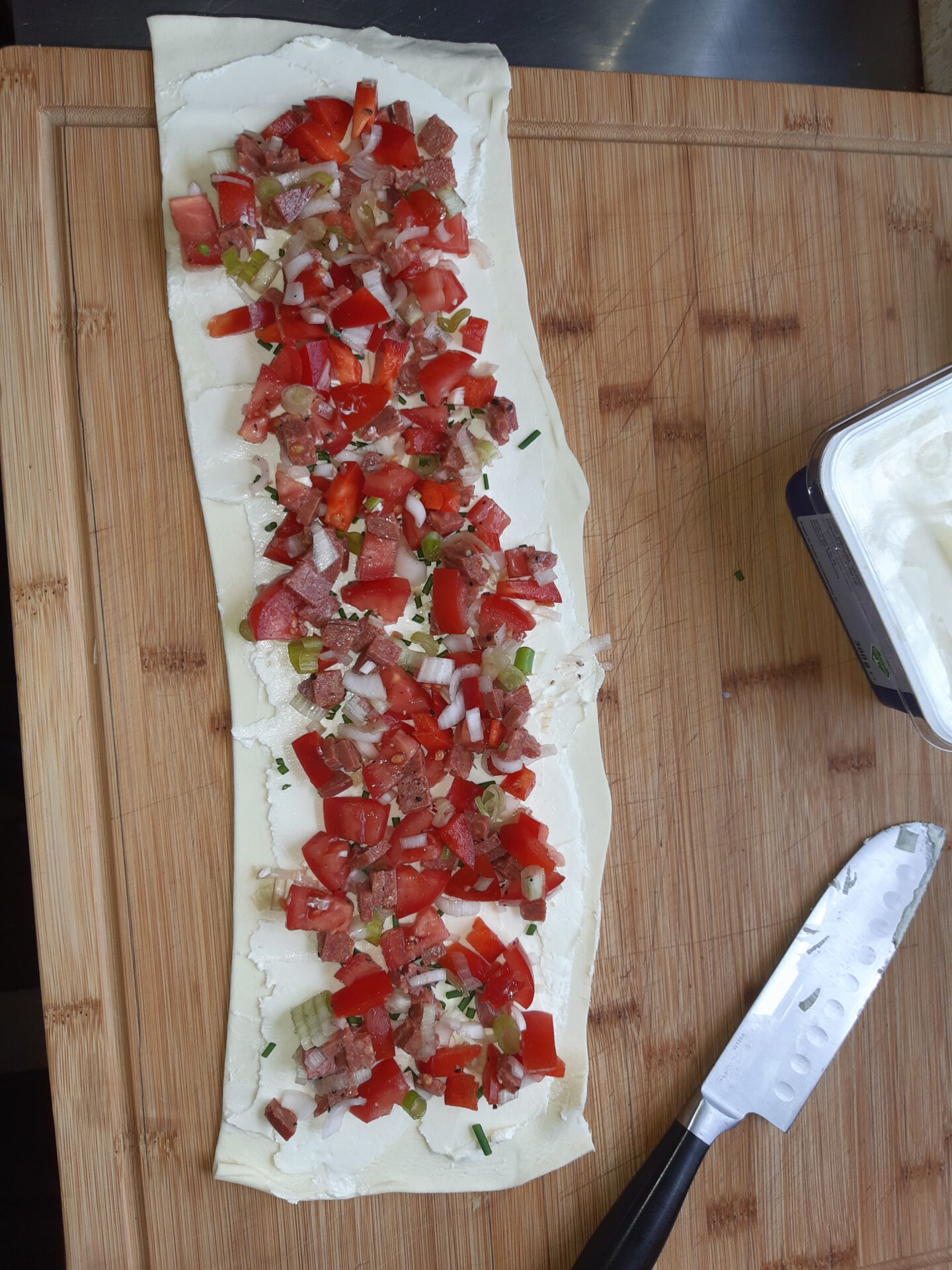 …mit Frischkäse, Tomaten, Knoblauch, Zwiebeln und Suzuk.