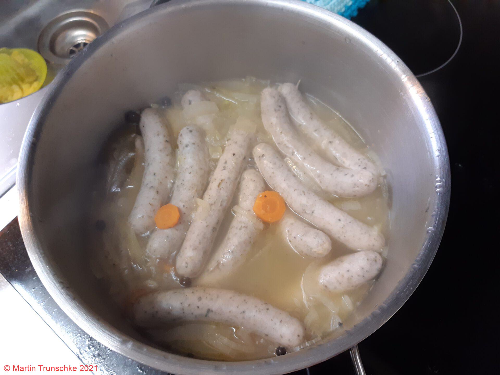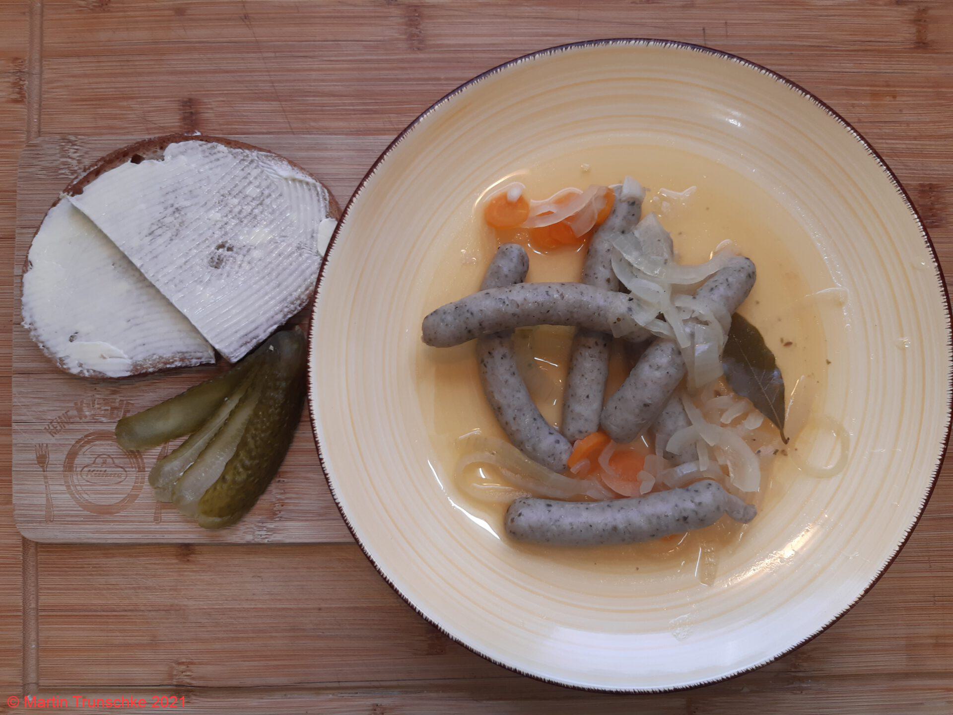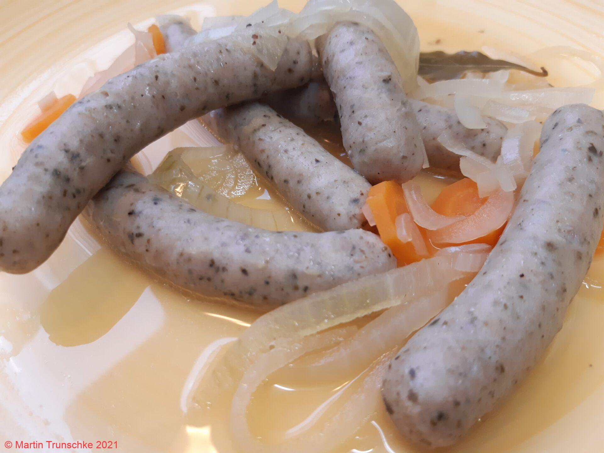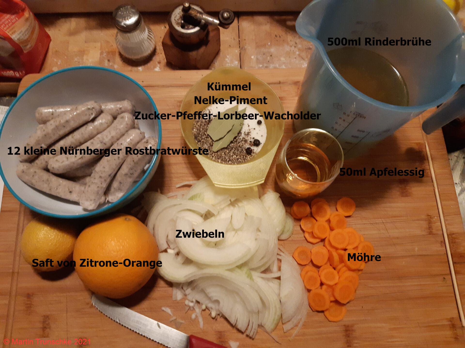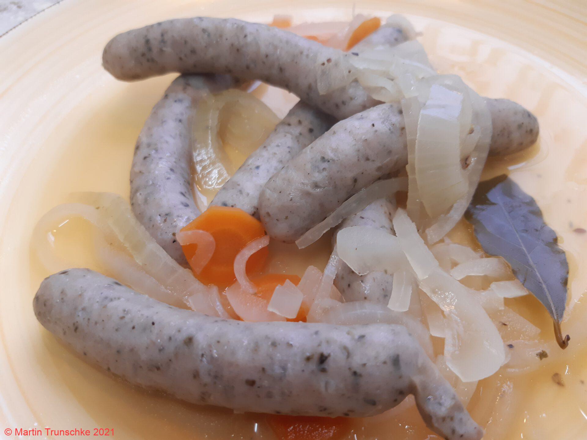- Die Hühnerbrühe aufkochen lassen, Apfelessig, Saft und alle Gewürze dazu geben. Die Zwiebeln schälen, halbieren und in dünne Scheiben schneiden, dazu geben und alles ca. 15 Minuten sieden lassen. Nun die Nürnberger Rostbratwürstchen dazu geben und 10 Minuten im Sud ziehen lassen. In tiefe Teller oder kleine Terrinen geben und etwas von dem Sud samt Zwiebeln darüber schöpfen. Dazu passt eine Stulle mit Butter und Salz.
