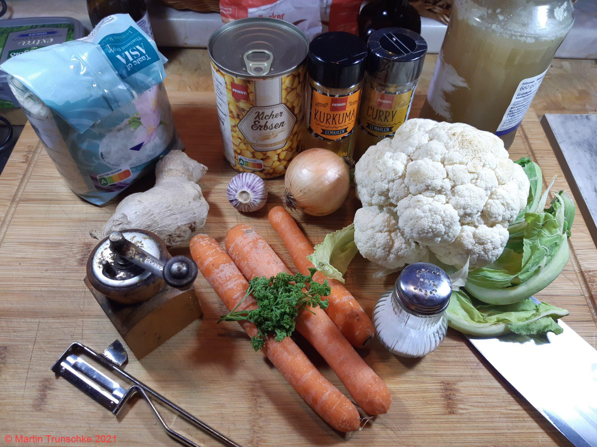 - Möhren schälen und in Scheiben schneiden, den Blumenkohl in mundgerechte Röschen teilen, die Zwiebeln, ein Stück Ingwer und den Knoblauch würfeln. Zwiebeln und Knoblauch im Öl anbraten. Dann das Gemüse und den Ingwer dazu geben und kurz anschwitzen. Curry, Kurkuma und die Cillipaste dazu geben und mit der Brühe angießen. Alles ca. 15 Minuten köcheln lassen, so das der Blumenkohl noch Biss hat. Zum abbinden den kalten Frischkäse unterrühren. Dazu habe ich diesesmal Reis gemacht, schmeckt aber auch mit Mi Nudeln oder Kartoffeln.