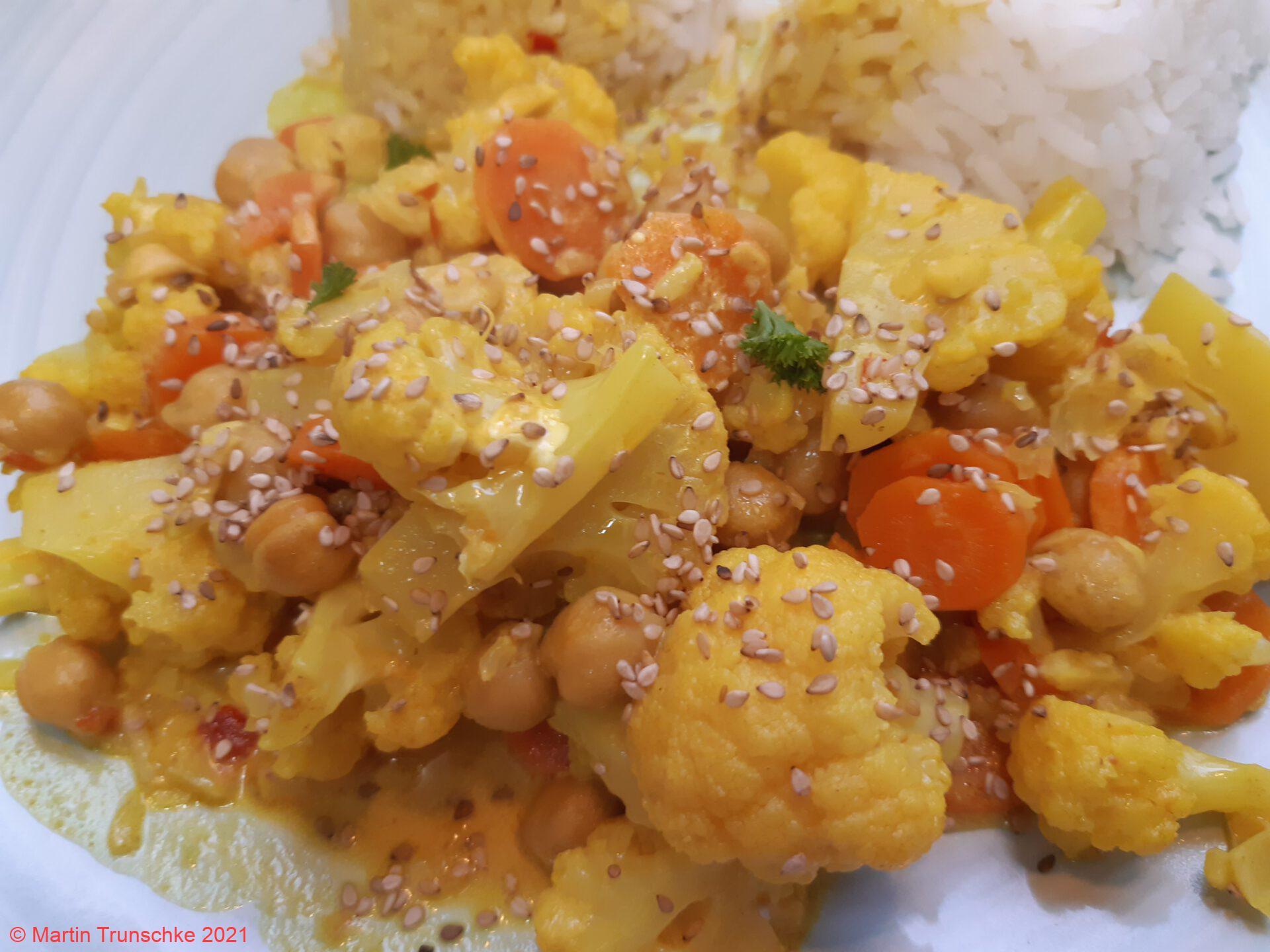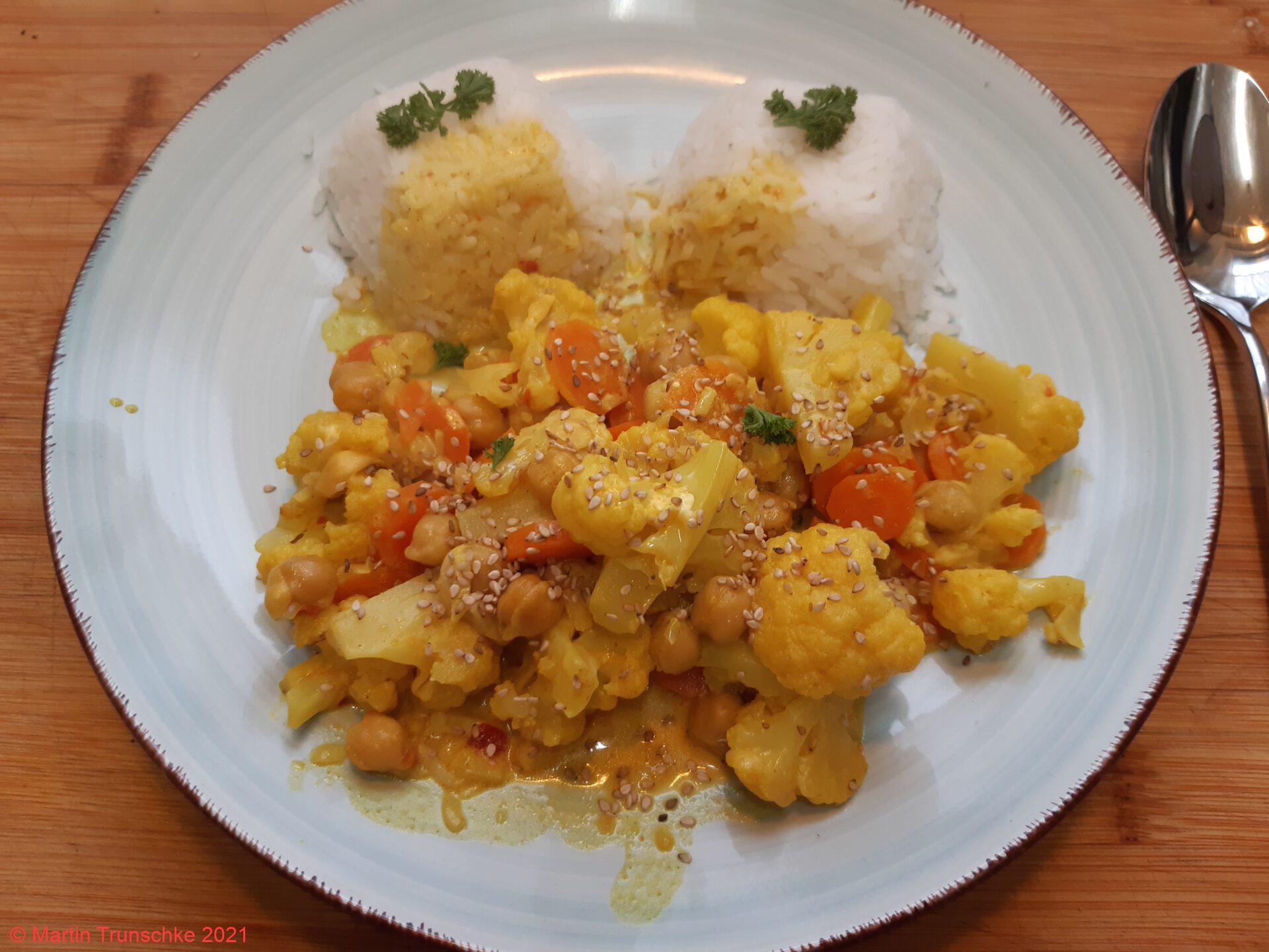 Blumenkohl – Möhren – Kichererbsen Curry mit Reis |