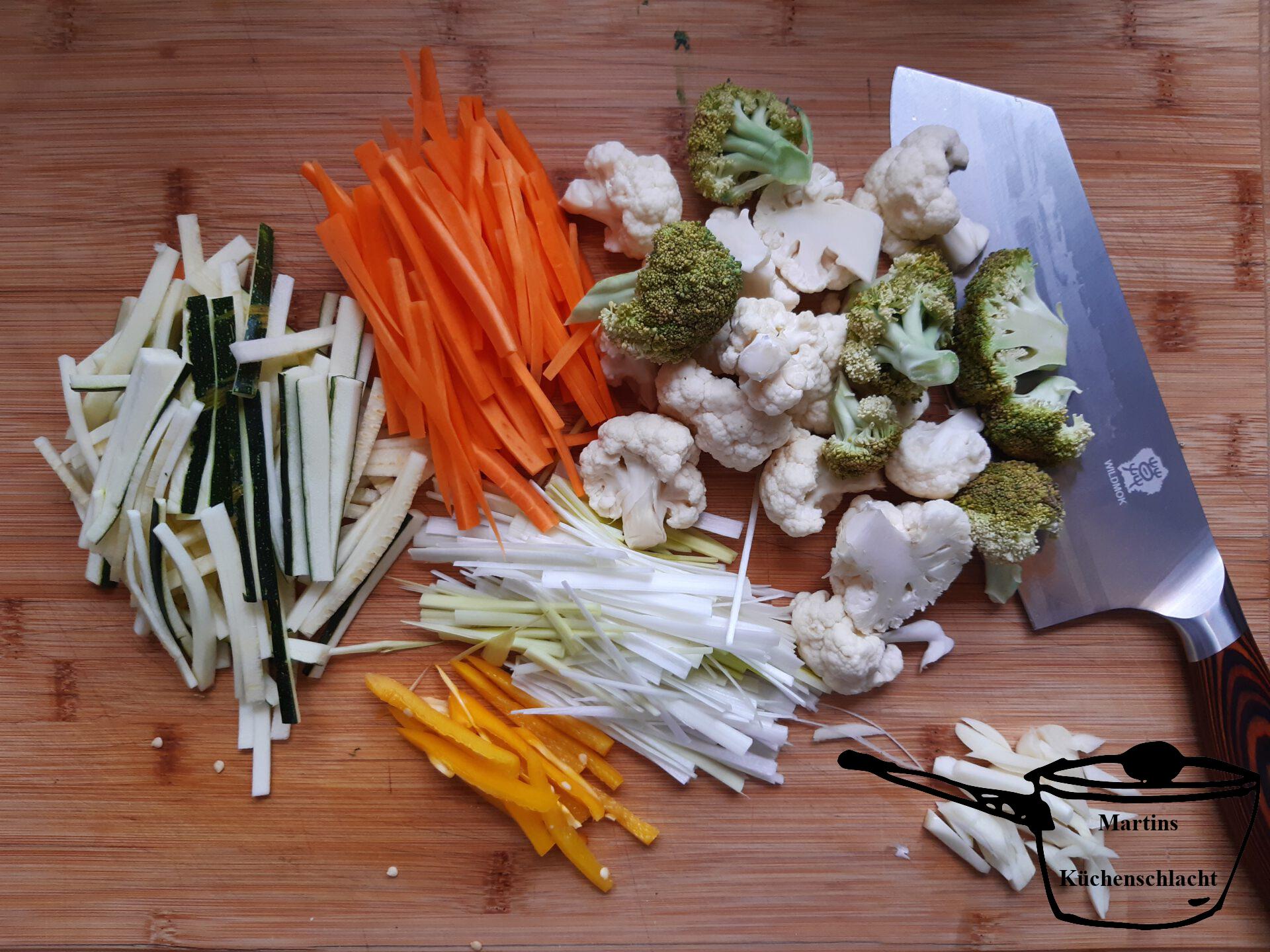 - Das andere Gemüse, was ihr so da habt, in Julienne schneiden.