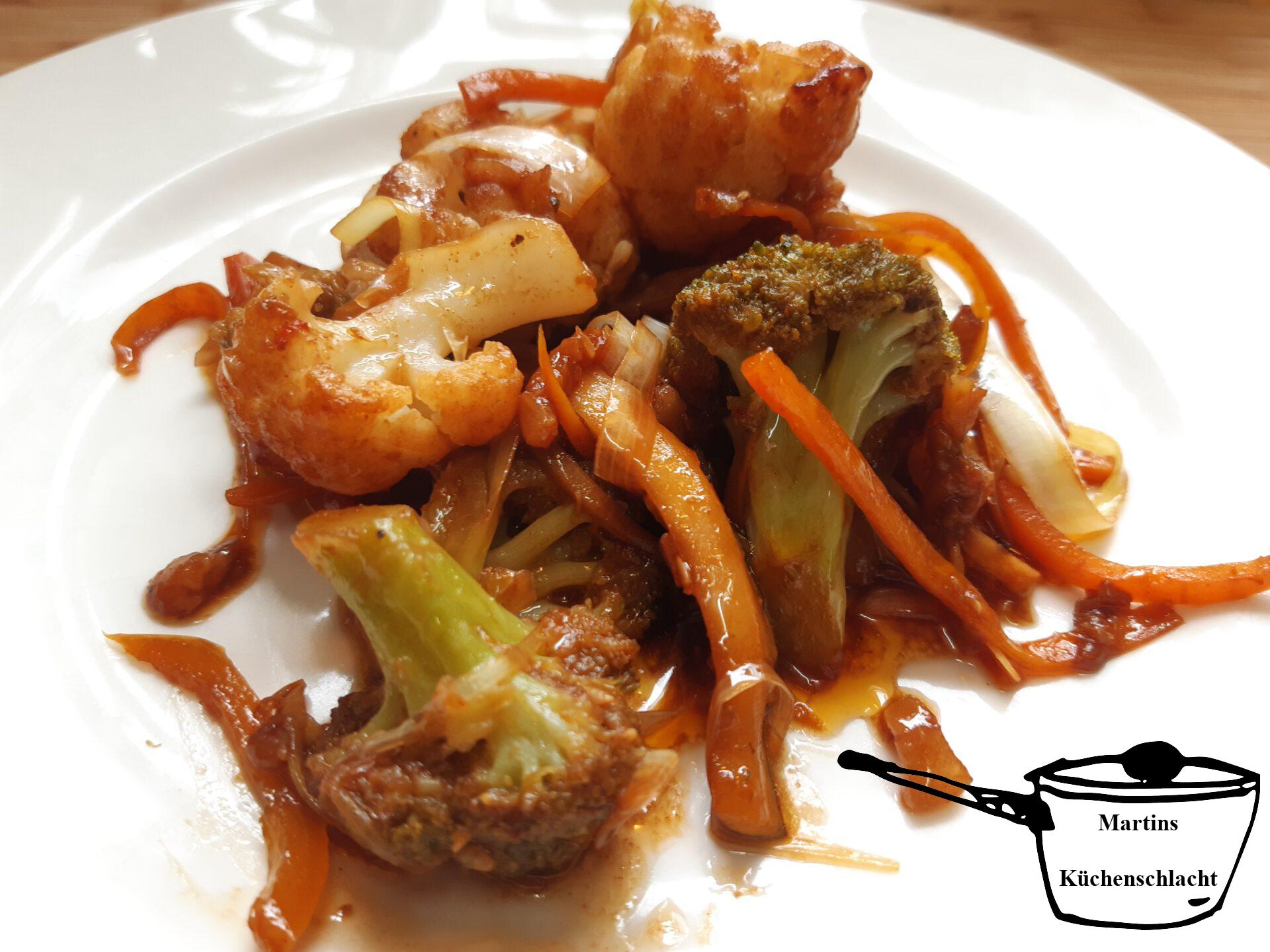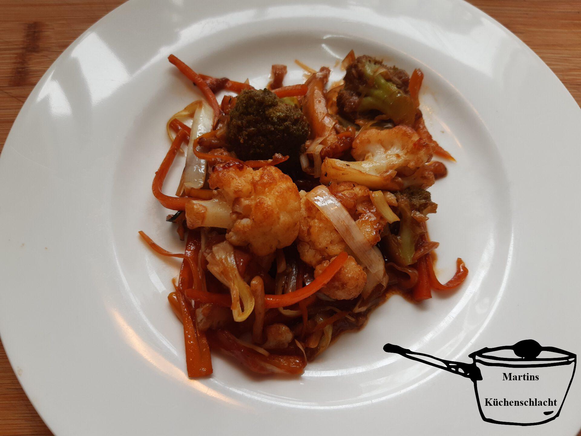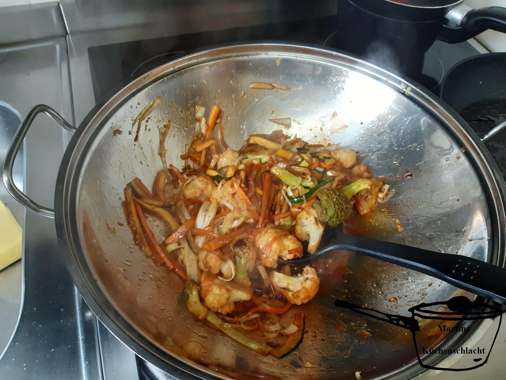 - In einem Wok das Sesamöl heiß werden lassen und das Gemüse (nach Härtegrad) hinein geben. Immer schön um schaufeln. Sojasoße und Chilisoße dazu geben. Immer gut rühren, damit nix anbrennt. Dann mit den Gewürzen abschmecken, bis der gewünschte Schärfegrad erreicht ist.