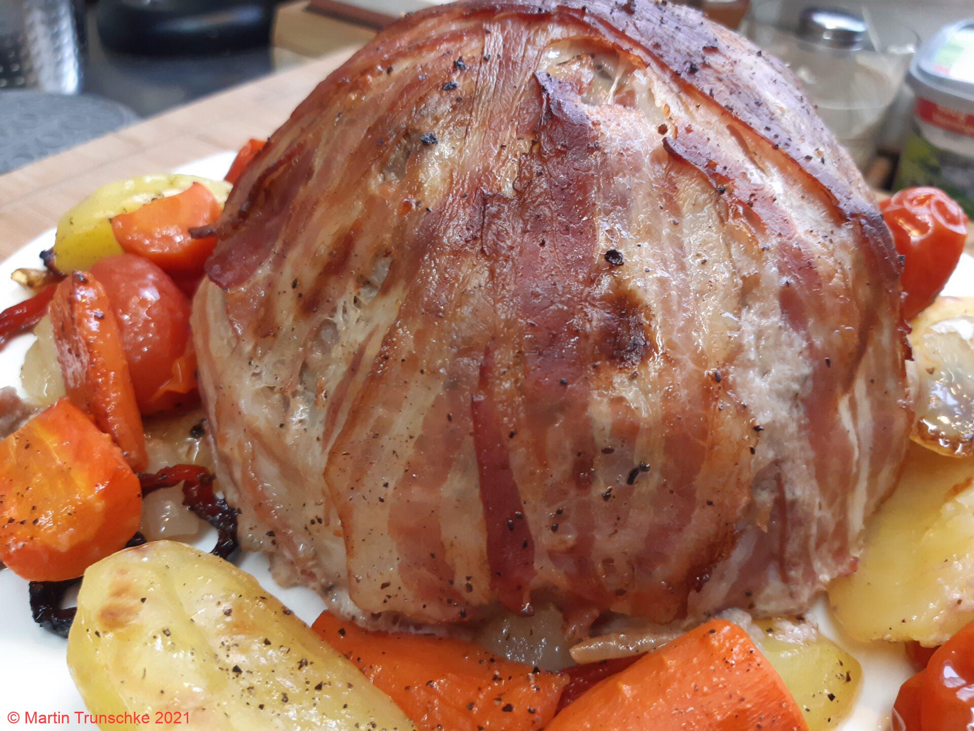 - ...und mit den Speckscheiben einpacken. Nun auf ein Backblech setzen und das Gemüse darum verteilen. Mit der Pfeffermühle etwas pfeffern, salzen, mit etwas Olivenöl betreufeln und für 45-50 Minuten in den auf 180°C vorgeheizten Backofen schieben.