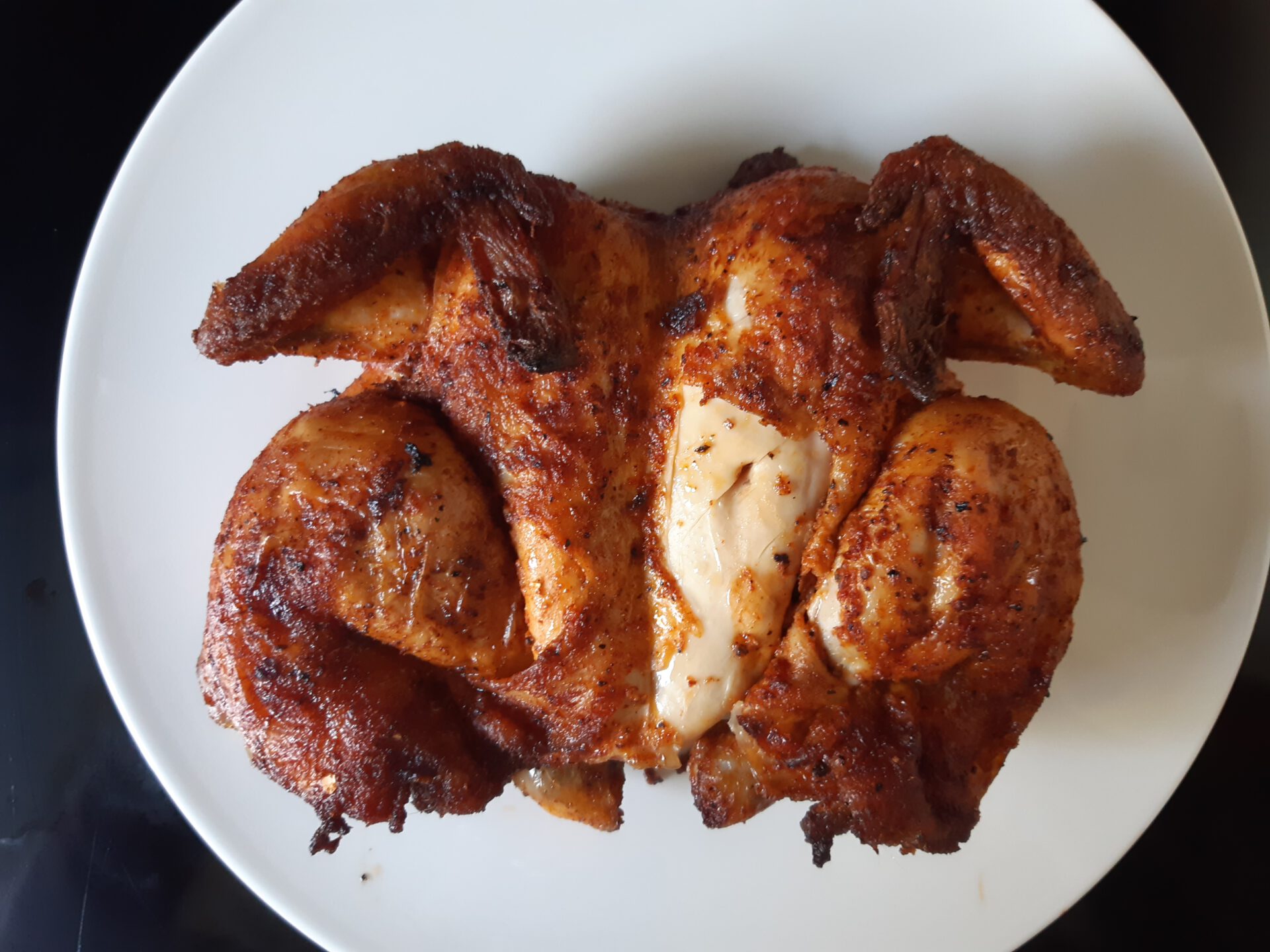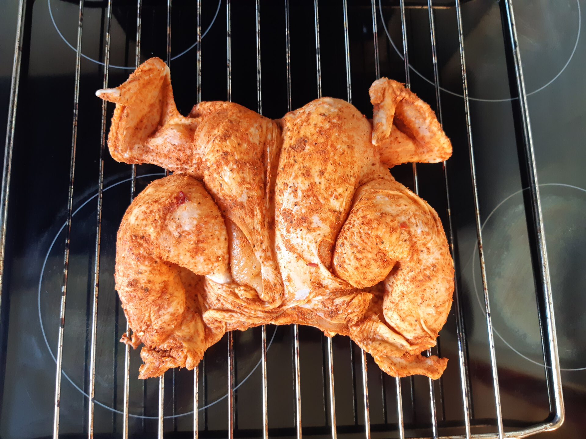 - Vom Hähnchen das Rückgrat entfernen. Ringsherum kräftig mit der "Trockenmarinade" würzen und in Frischhaltefolie gewickelt für ein paar Stunden wieder in den Kühlschrank legen. Anschließend wieder herausnehmen und Zimmertemperatur annehmen lassen.