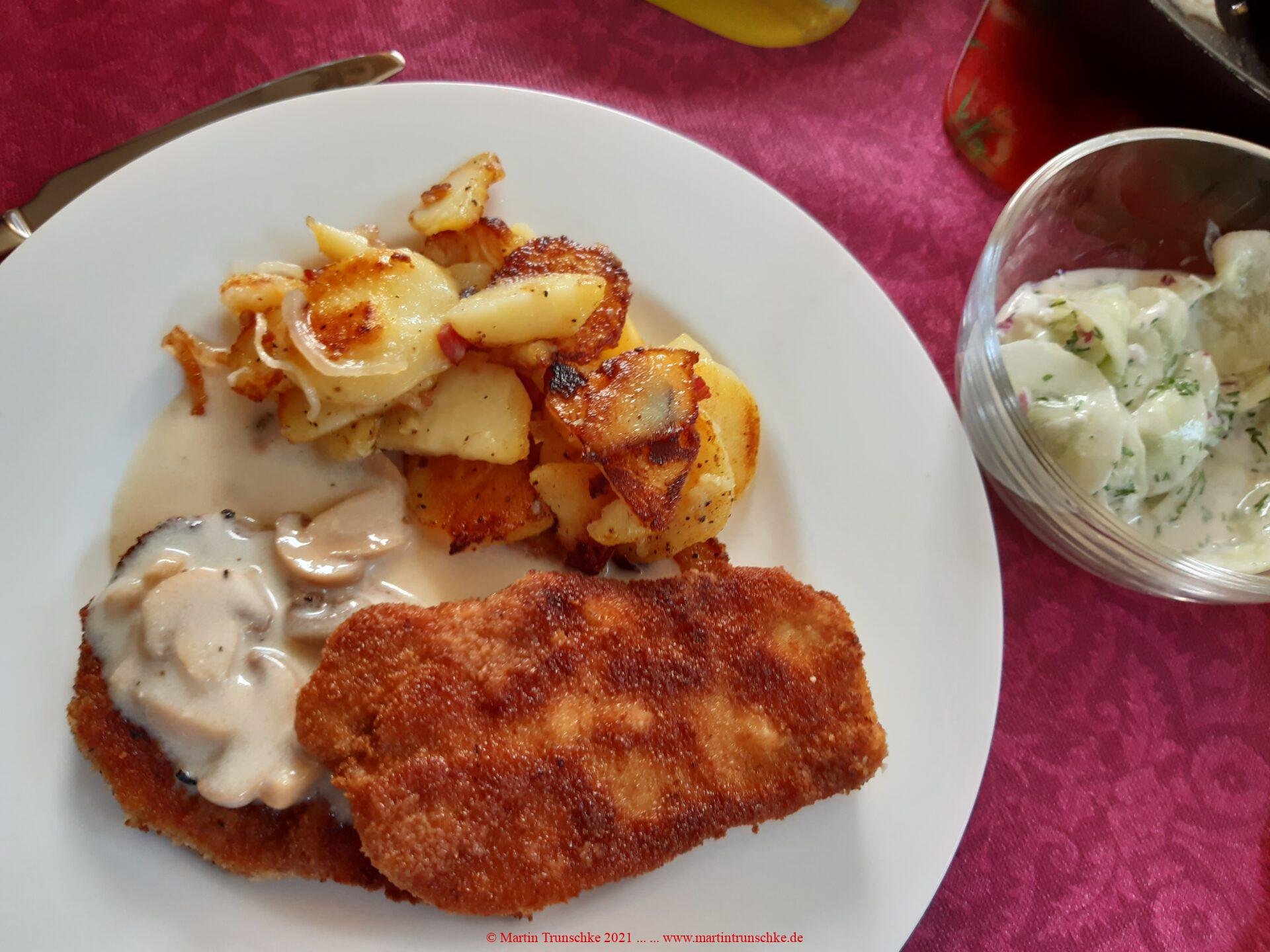 …Champignon/Sahnesoße und Gurkensalat.