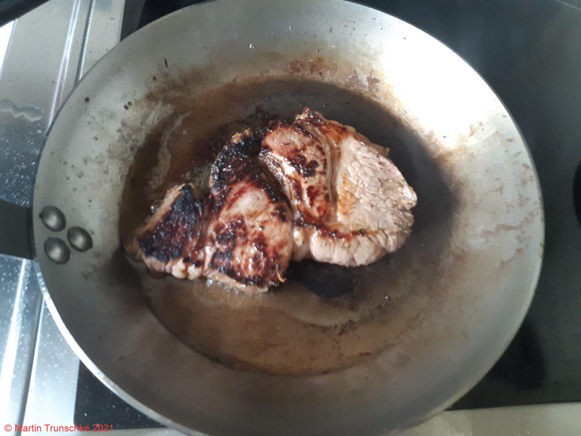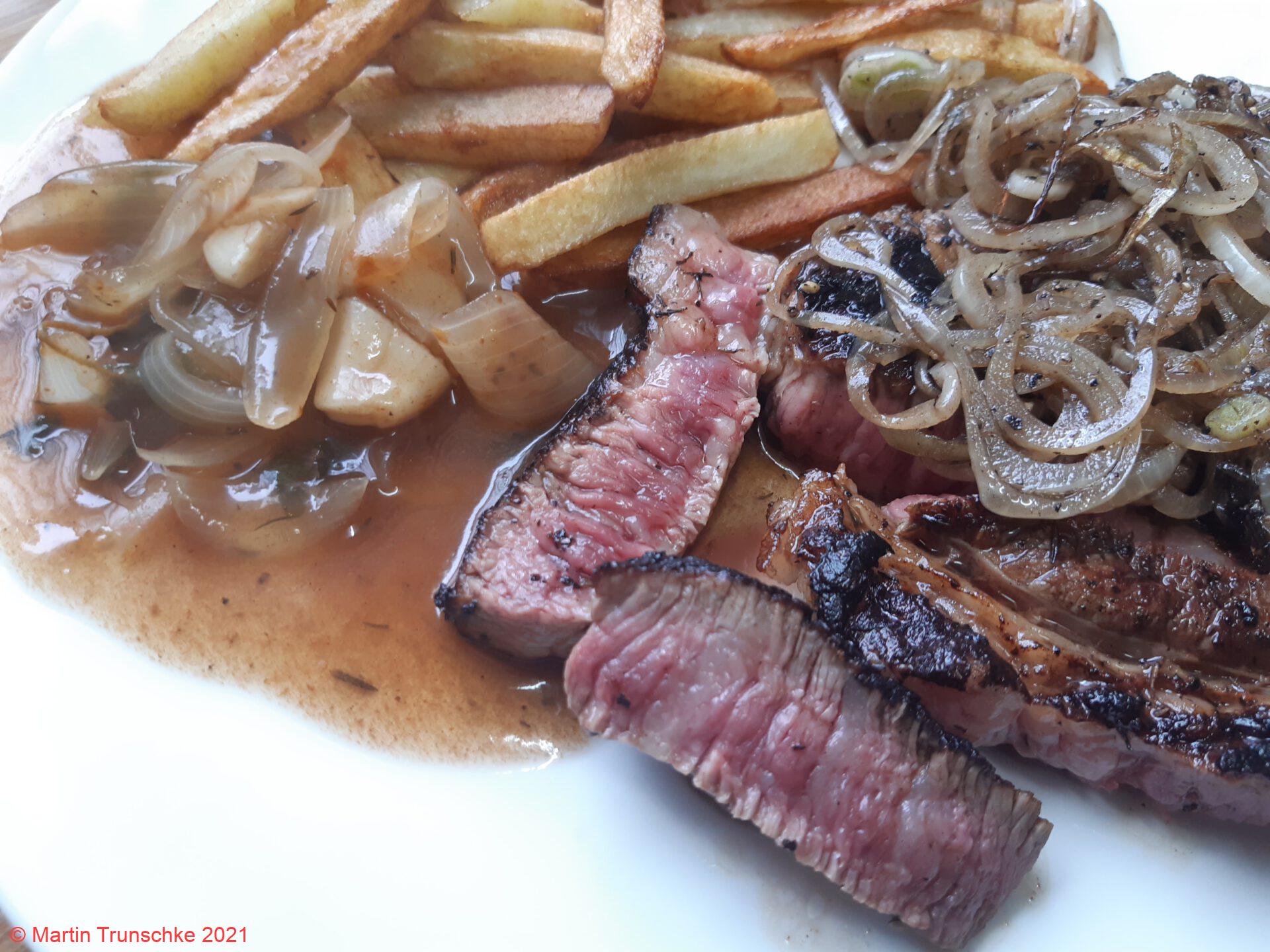 - Eine Eisenpfanne sehr heiß werden lassen und den Butterschmalz erhitzen. Nun das Steak von jeder Seite 2-3 Minuten (je nach Dicke) anbraten. Das Steak aus der Pfanne nehmen, auf eine Platte legen und bei 70° im Backofen 5-10 Minuten (je nachdem wie durch es soll, ich mach 55° Kerntemp.) nachziehen lassen. In der Zeit die Marinade in die Pfanne geben und einkochen lassen. Auch in der Zeit Zwiebelringe in Butter glasieren und mit Pfeffer und Zucker abschmecken.