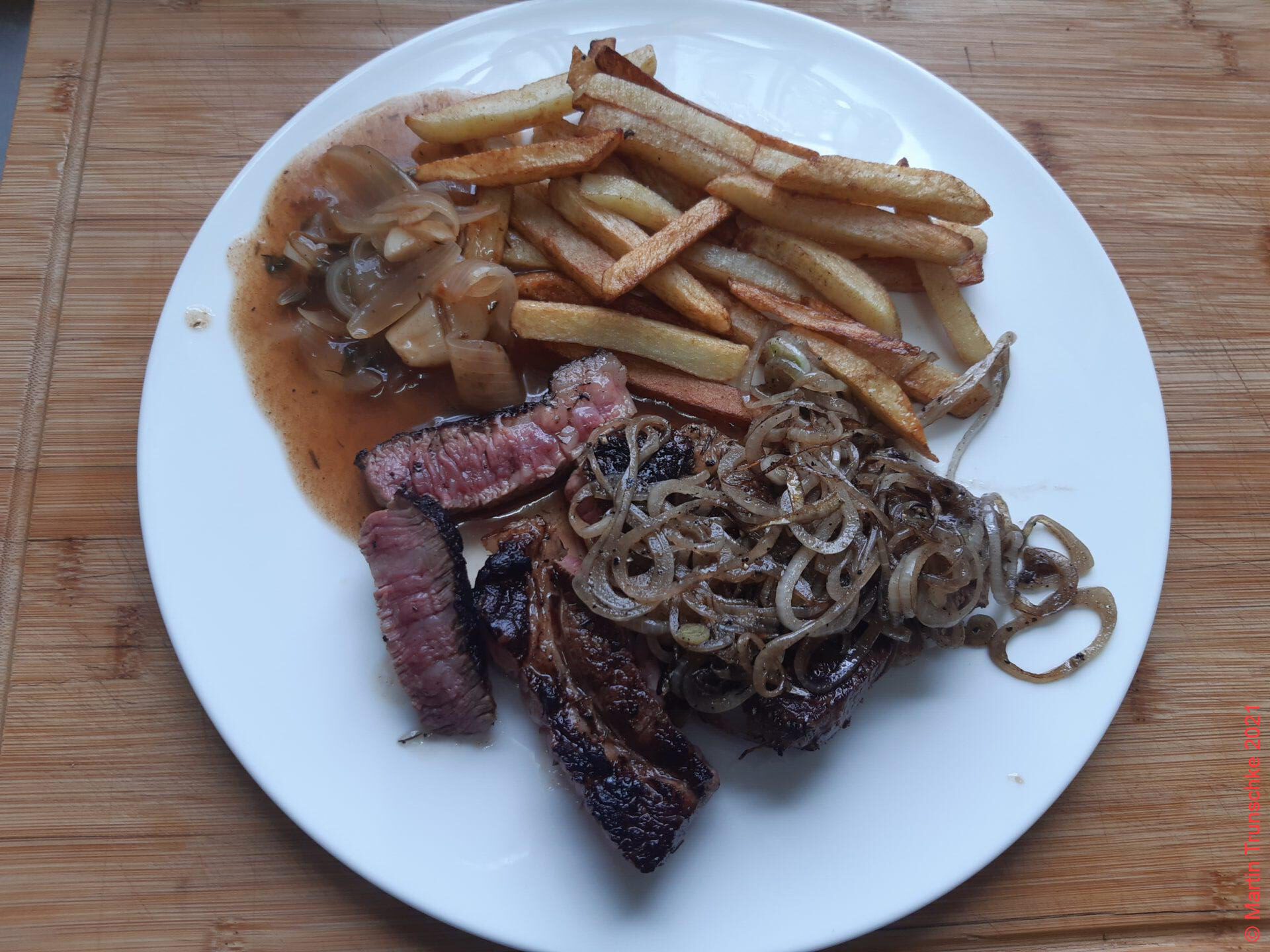 Chuck Eye Steak, mariniertmit glasierten Zwiebeln und Pommes. |