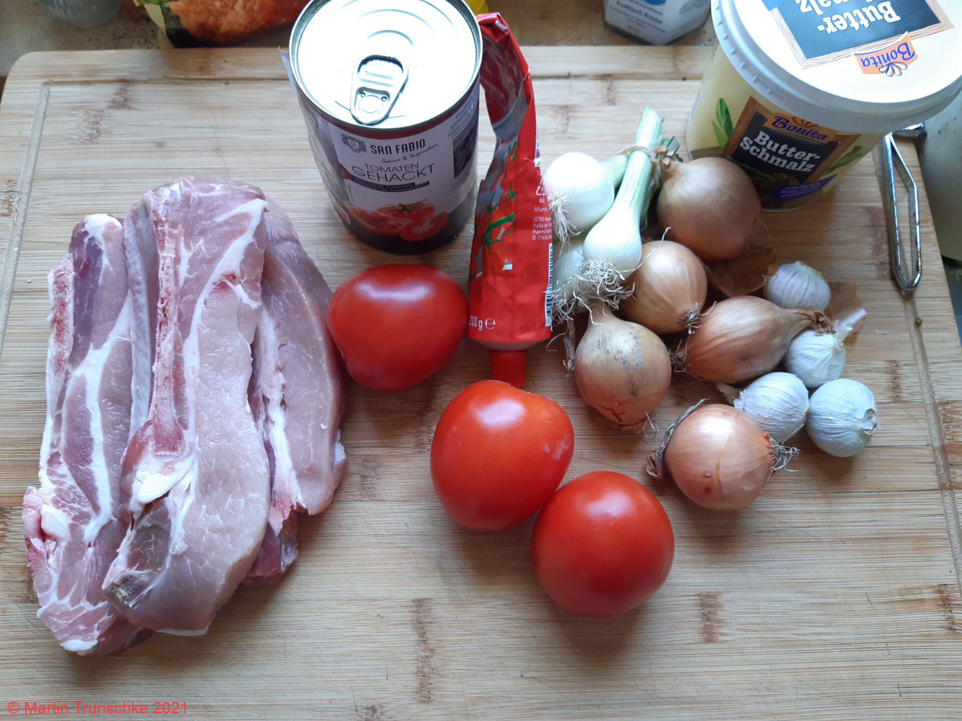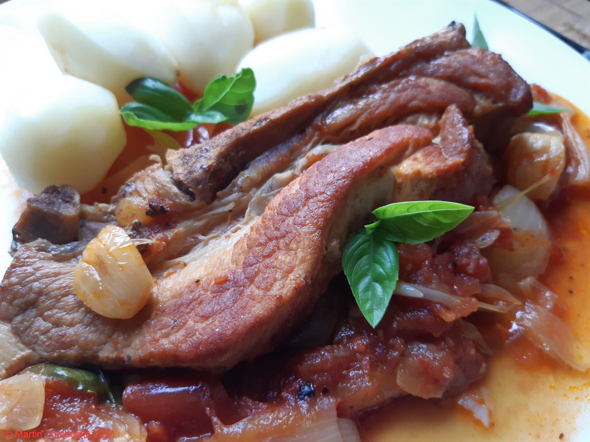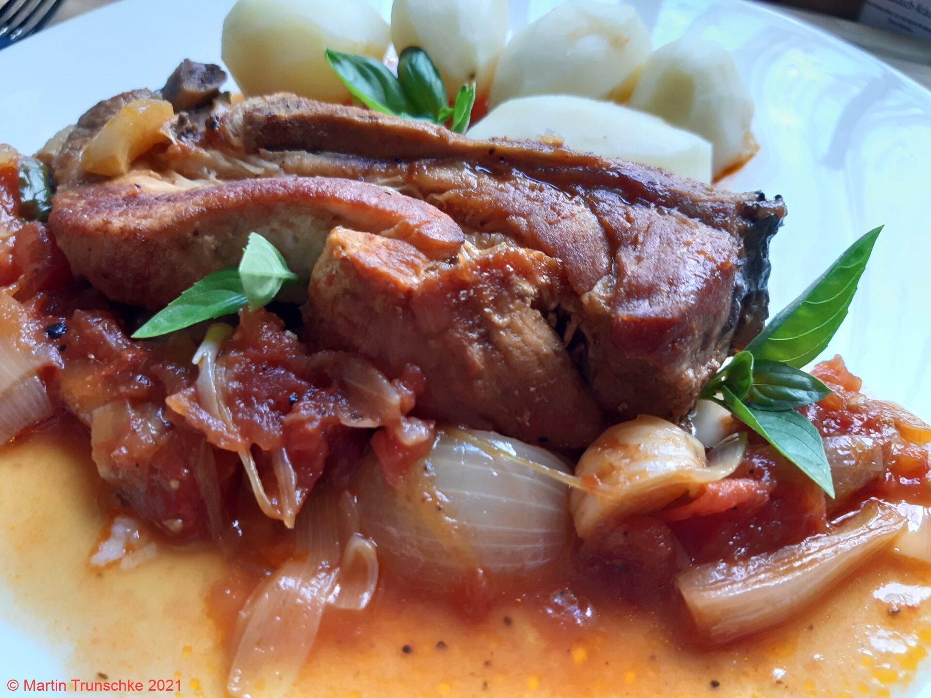 Dicke Rippe vom Schwein – geschmortmit Zwiebel-, Tomatengemüse |