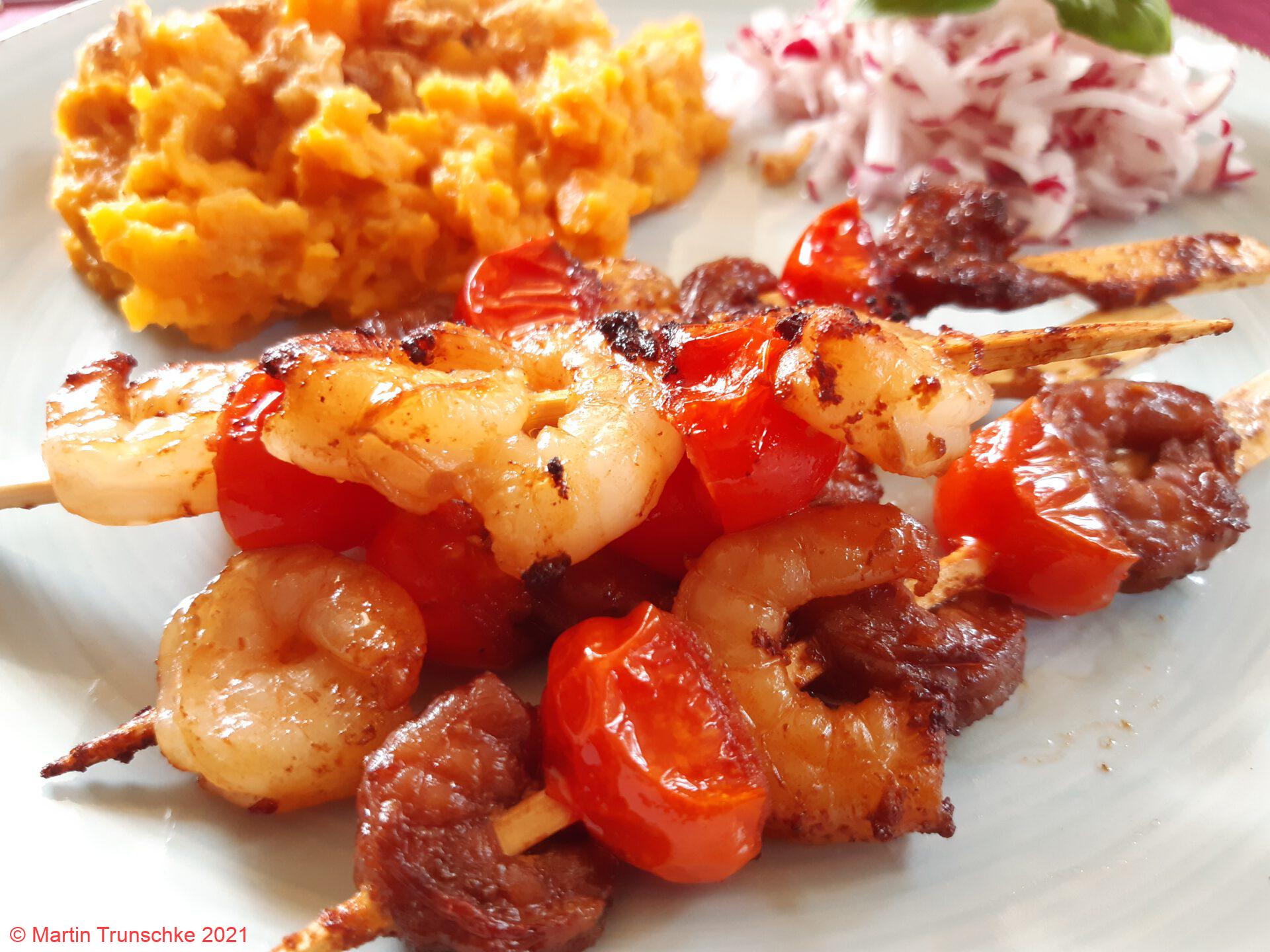 - Süßkartoffeln schälen und in kleine Stücke schneiden. In Salzwasser garen. In der Zeit die Garnelen und Tomaten auf Spieße stecken.