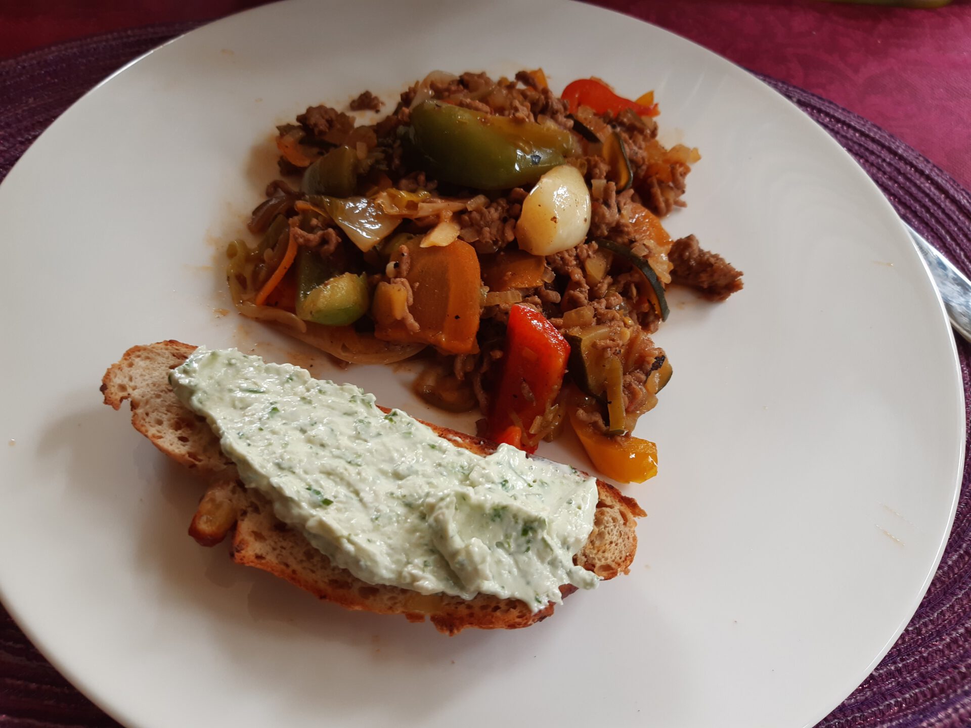 - Anrichten und mit einer gerösteten Kartoffel/Zwiebelbrot Scheibe mit Knoblauch/Kräuterquark genießen.