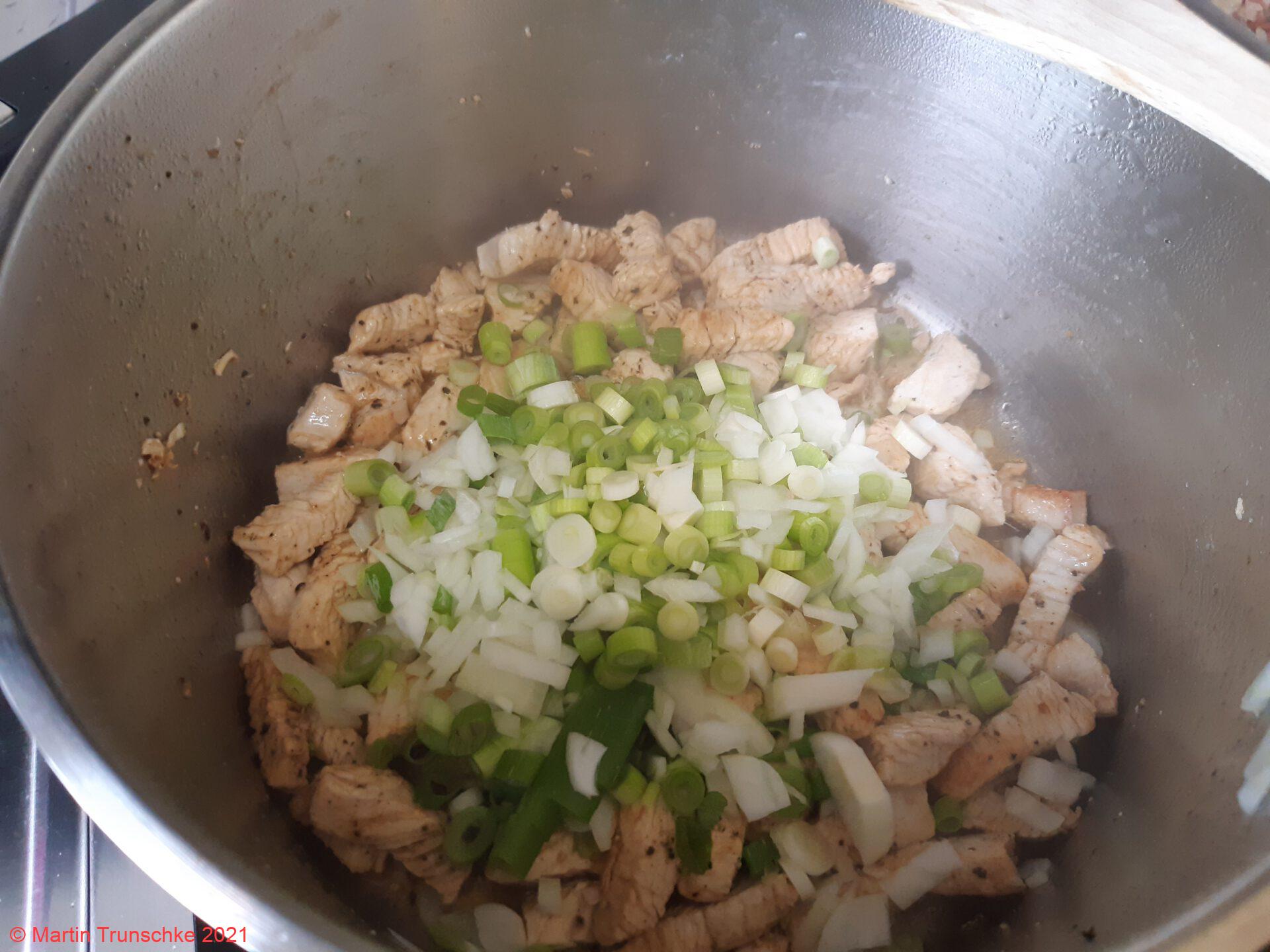 - Während dessen die Zwiebeln und das Gemüse würfeln und zu den Schnitzelstückchen geben und auch etwas anbraten.