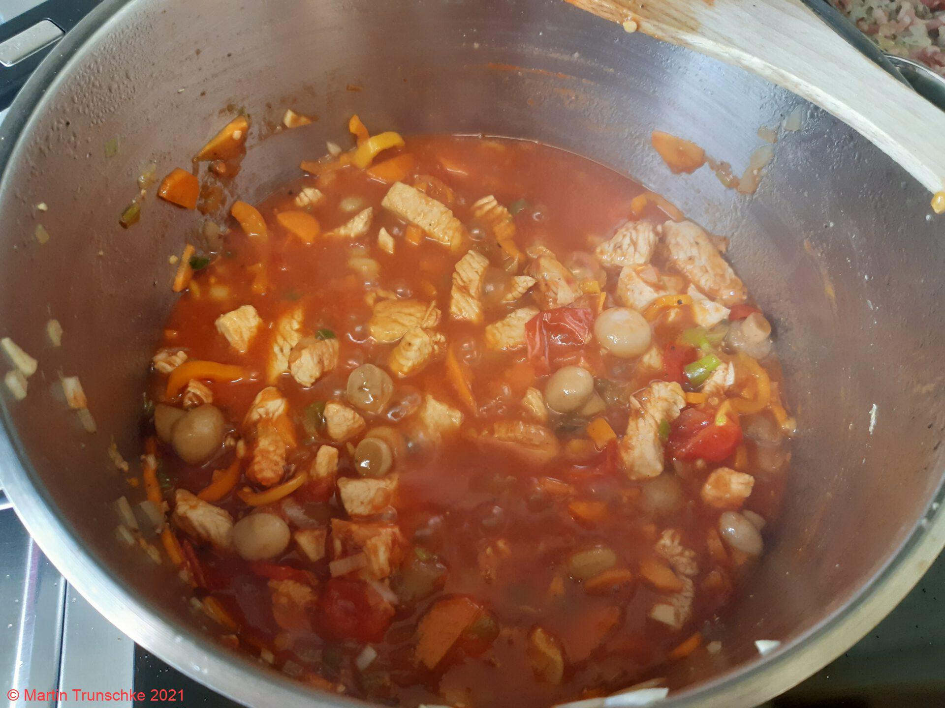 - Mit der Brühe angießen und etwas einkochen lassen. Sahne angießen und mit den Gewürzen abschmecken. Wieder etwas einkochen lassen...evt. mit Speisestärke binden.