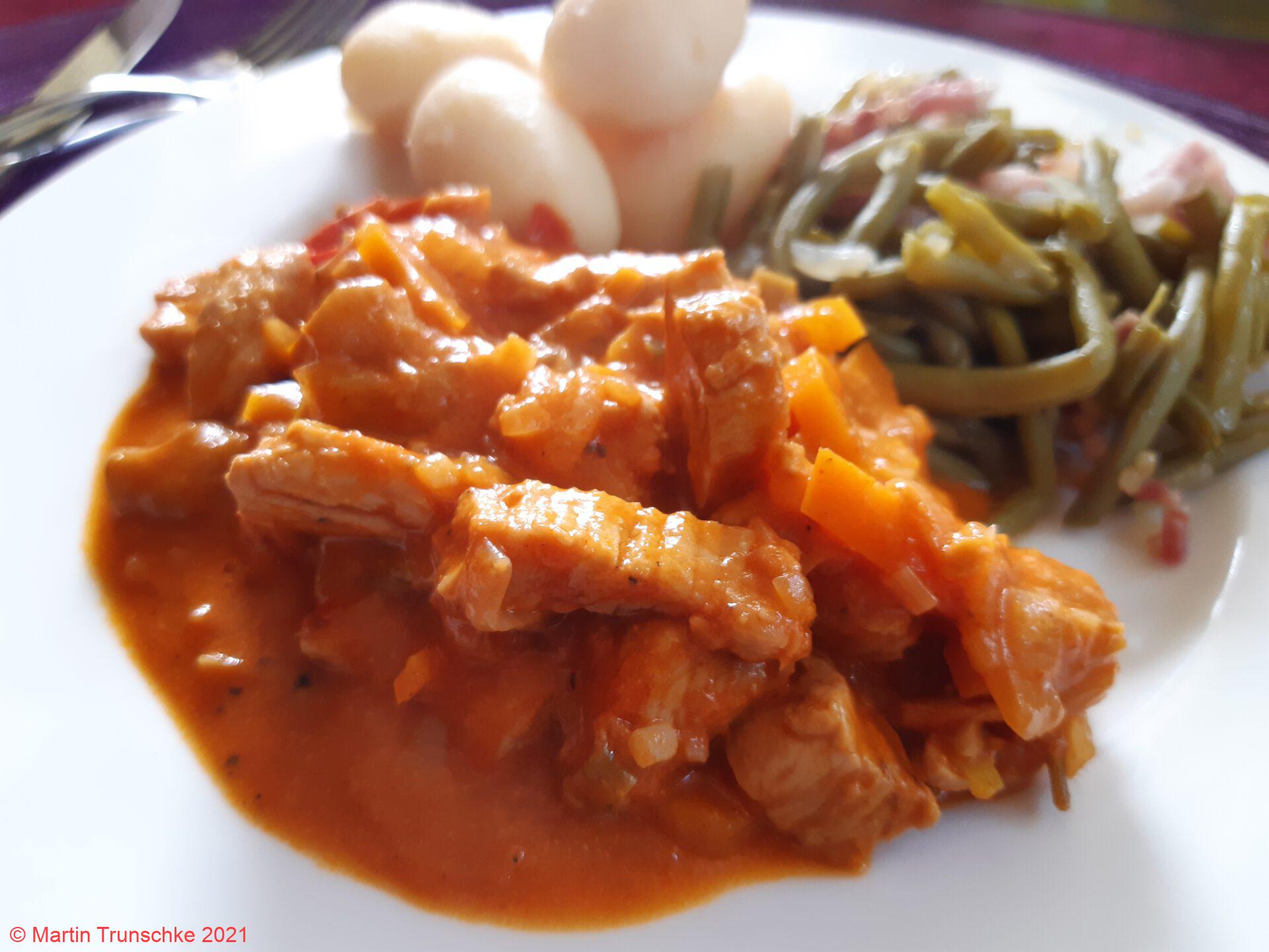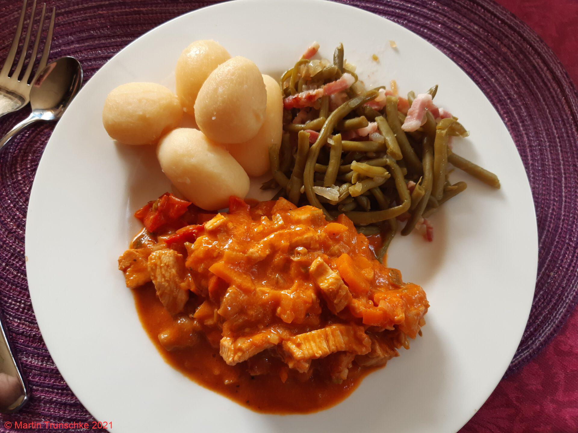 Geschnetzeltes in Sahnesoße und Speckbohnen