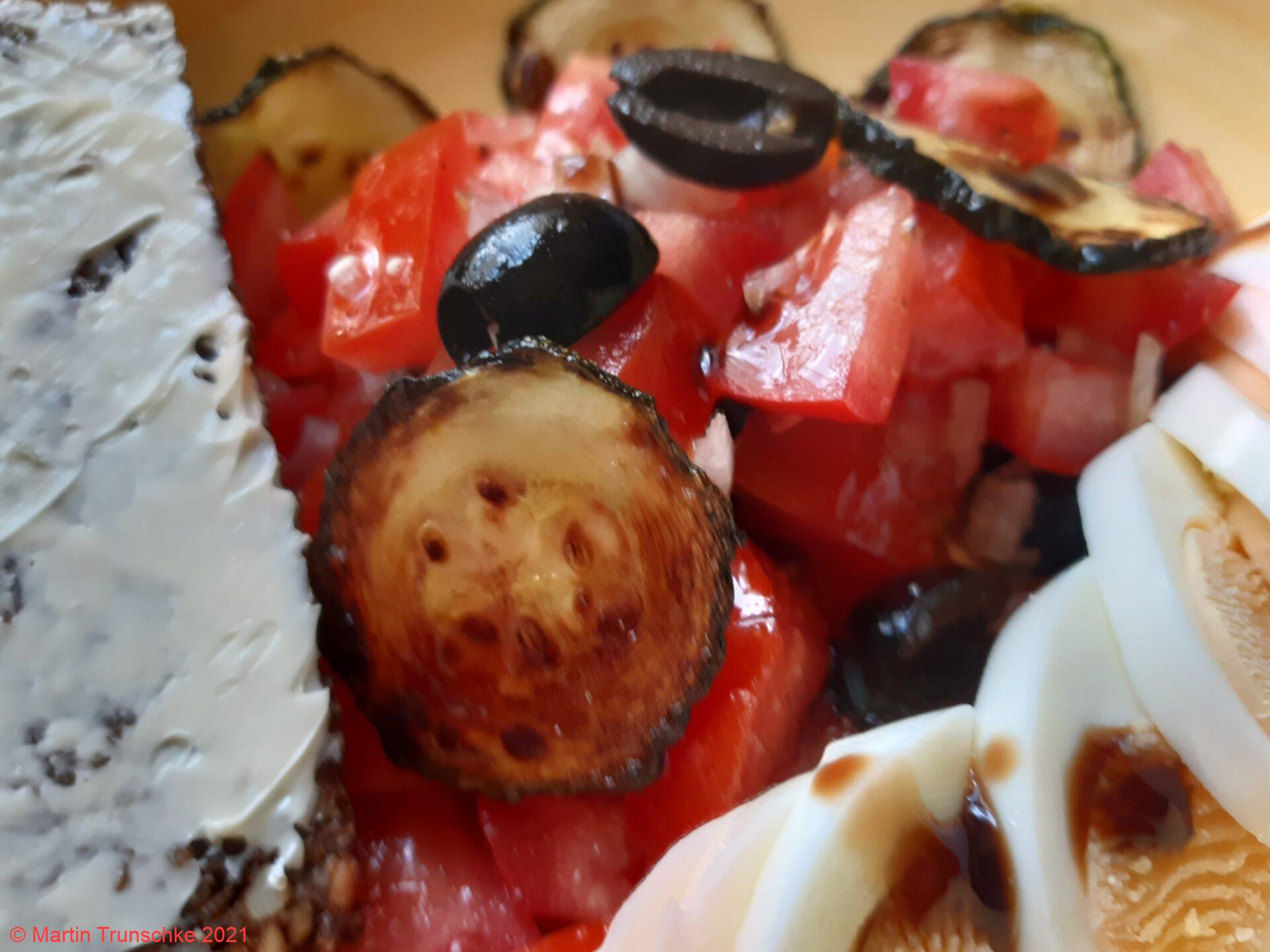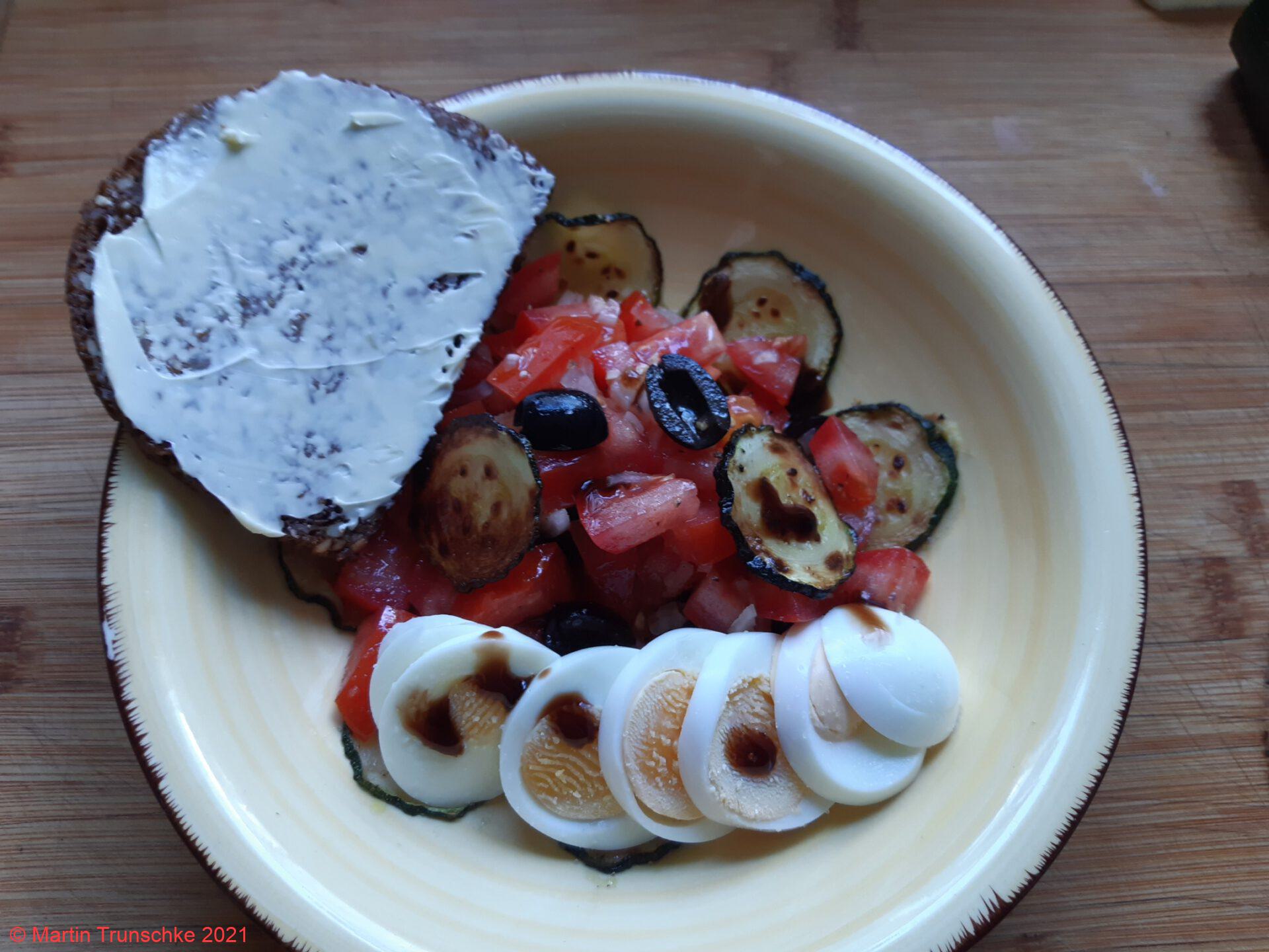 Tomaten-Zucchini Salatmit Ei und Körnerbrot |