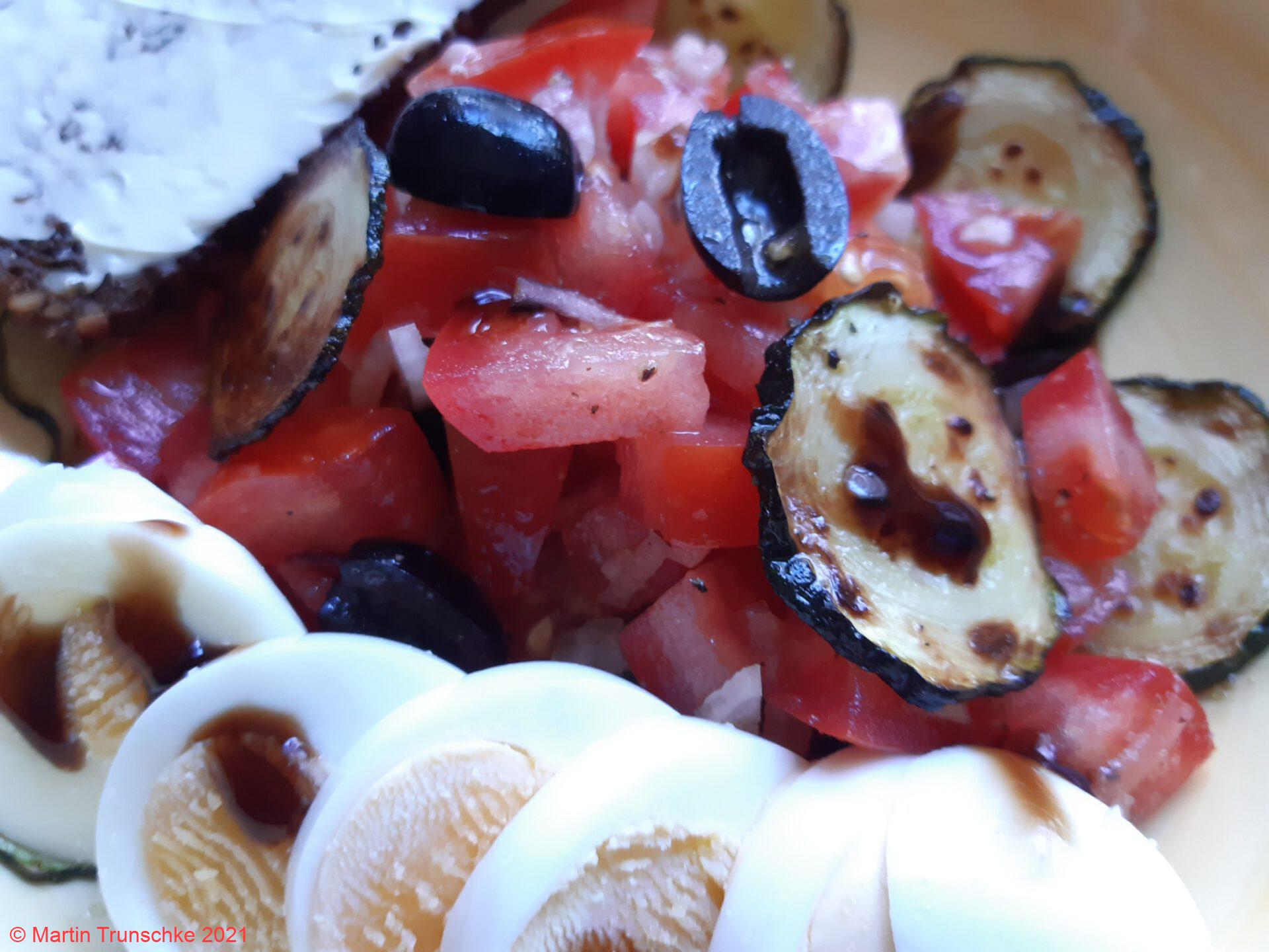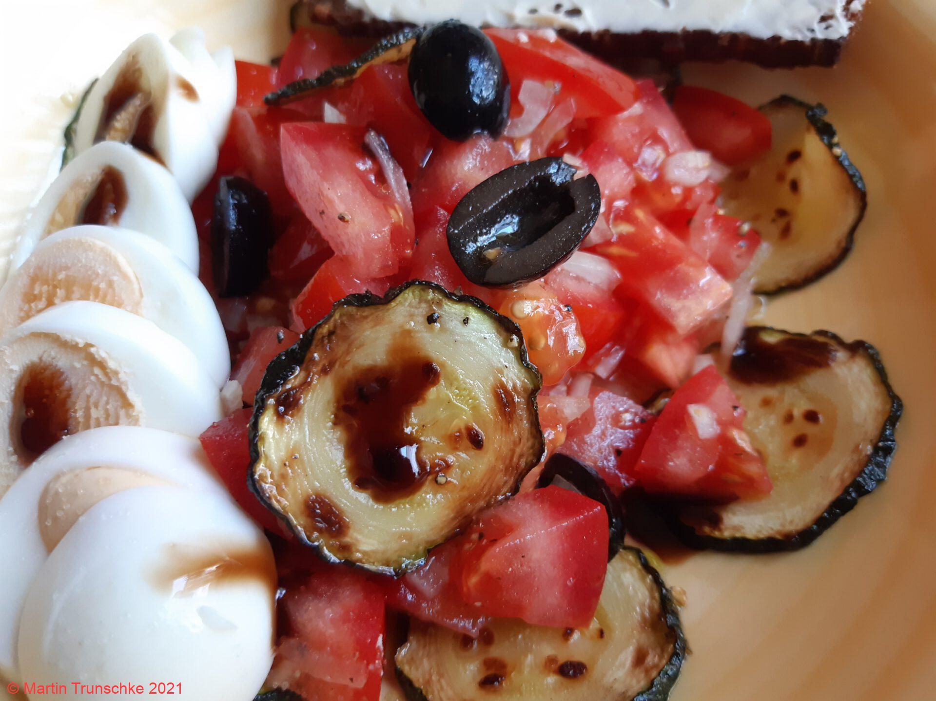 - Die Tomaten waschen und in Würfel schneiden. Zwiebeln fein hacken. Für das Dressing den Essig und das Öl verrühren. Mit Salz und Pfeffer abschmecken. Das Dressing über die Tomaten geben und kurz verrühren. Halbierte Oliven und Zwiebelwürfel untermischen. Dann zur Zucchini geben. Mit dem Ei garnieren und mit etwas Balsamicocreme beträufeln.
