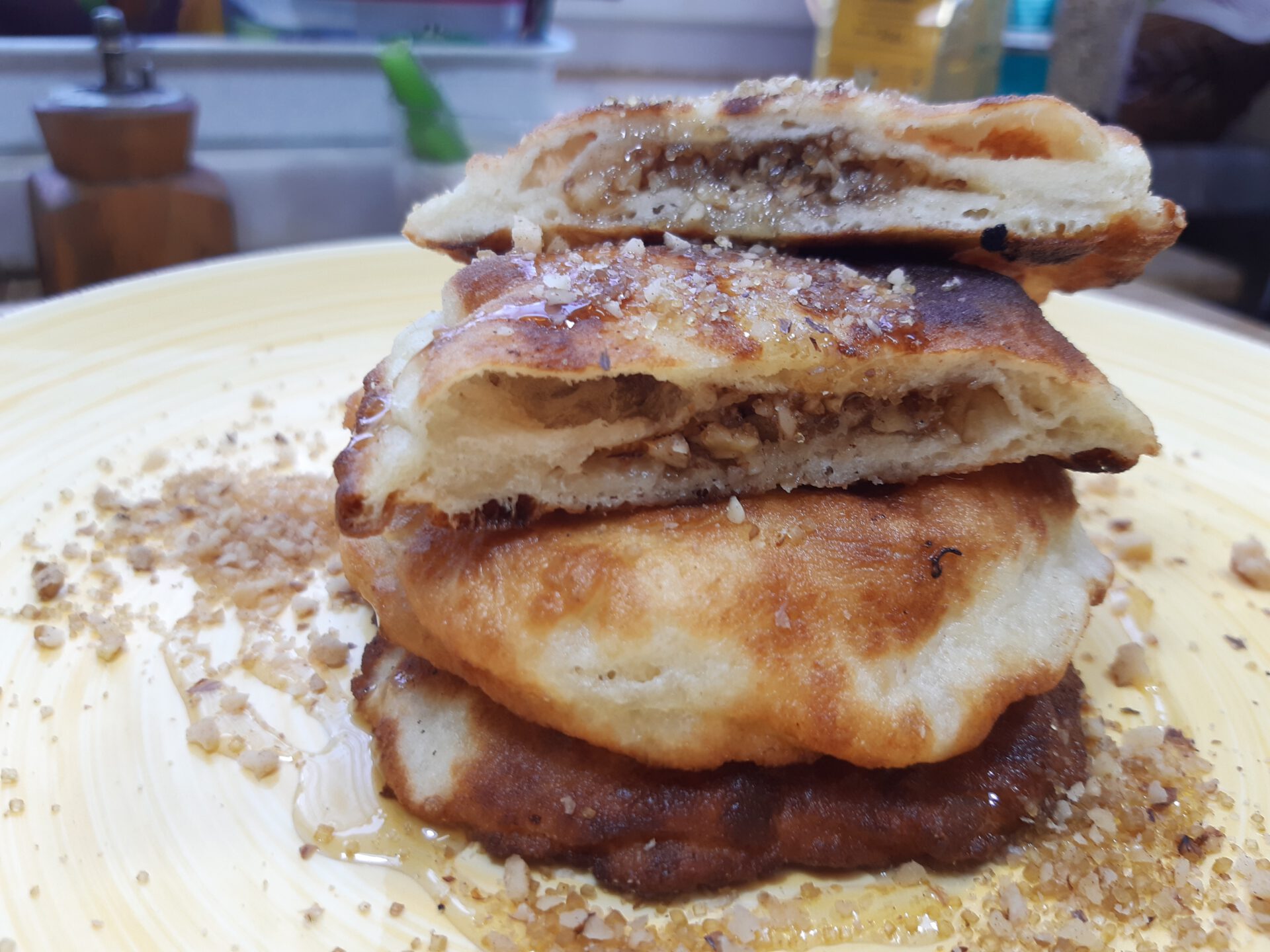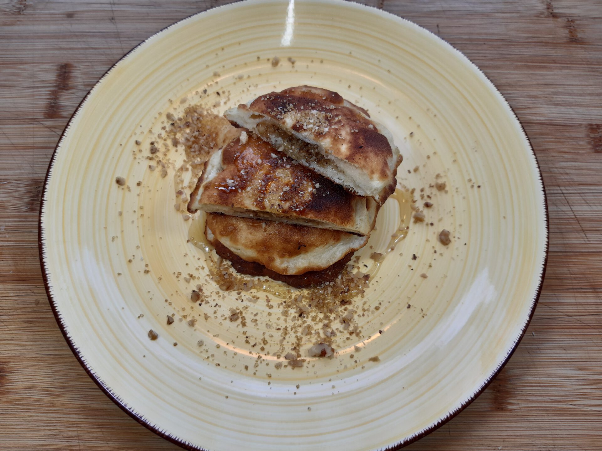 - Eine beschichtete Pfanne erhitzen und mit etwas Öl bepinseln. Die Fladen von beiden Seiten goldbraun anbraten. Die elt. Platte abschalten, alle Fladen in die Pfanne geben und mit einem Deckel nochmal 1-2 Minuten weiterschmurgeln lassen. So das der Zucker im Fladen schmilzt.