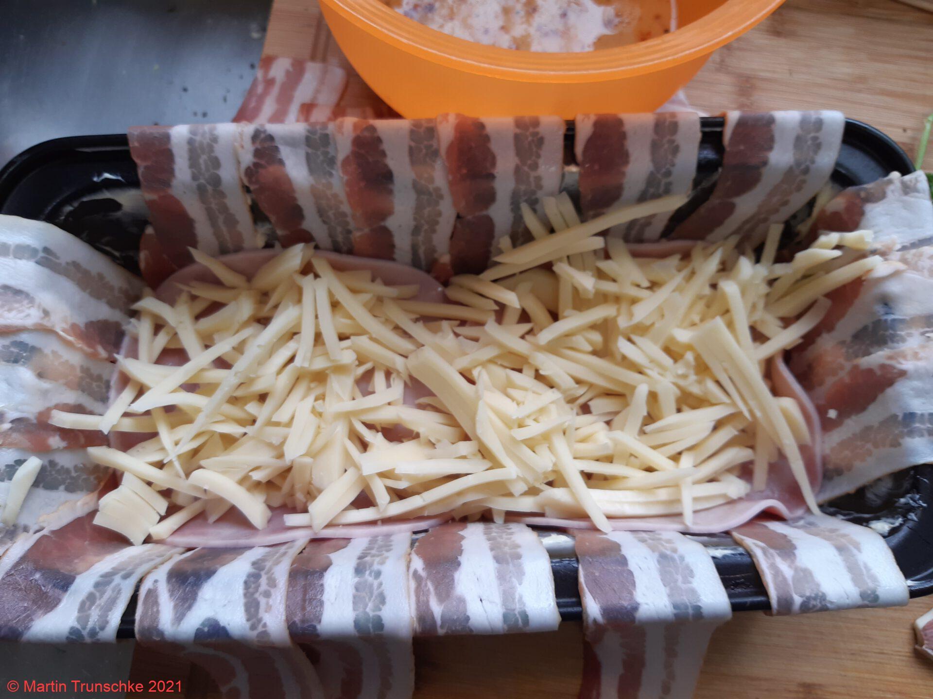- Das restliche Ei darüber verteilen und die Form dann mir dem Speck verschließen.