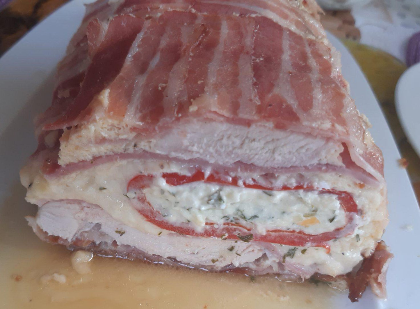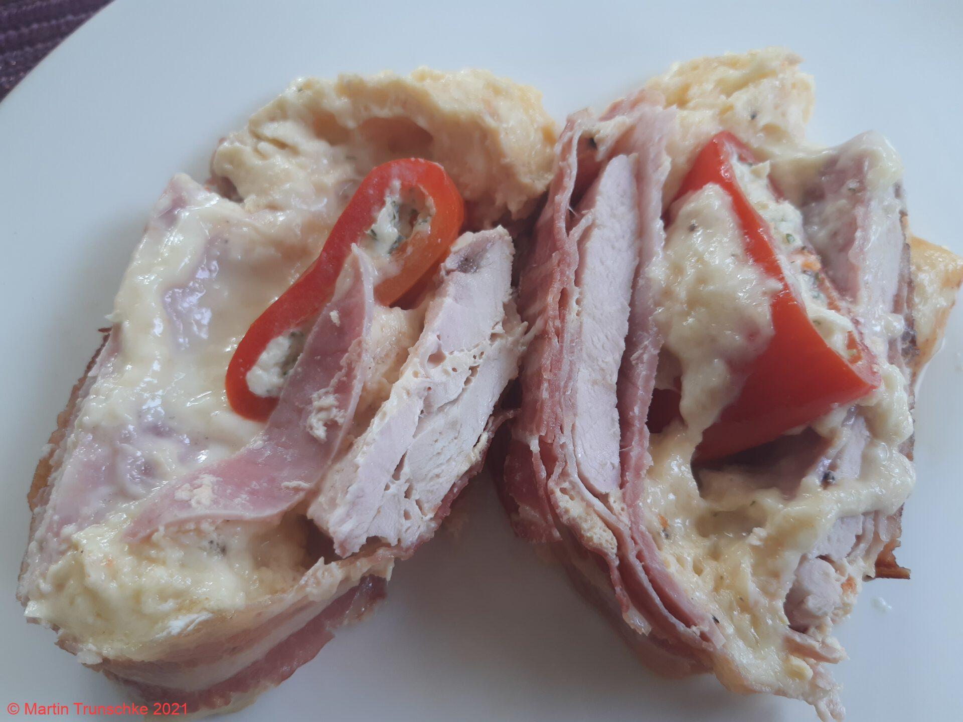Hühnerbrust in der Kastenformmit Frischkäse gefüllter Spitzpaprika und viel Emmentaler. |