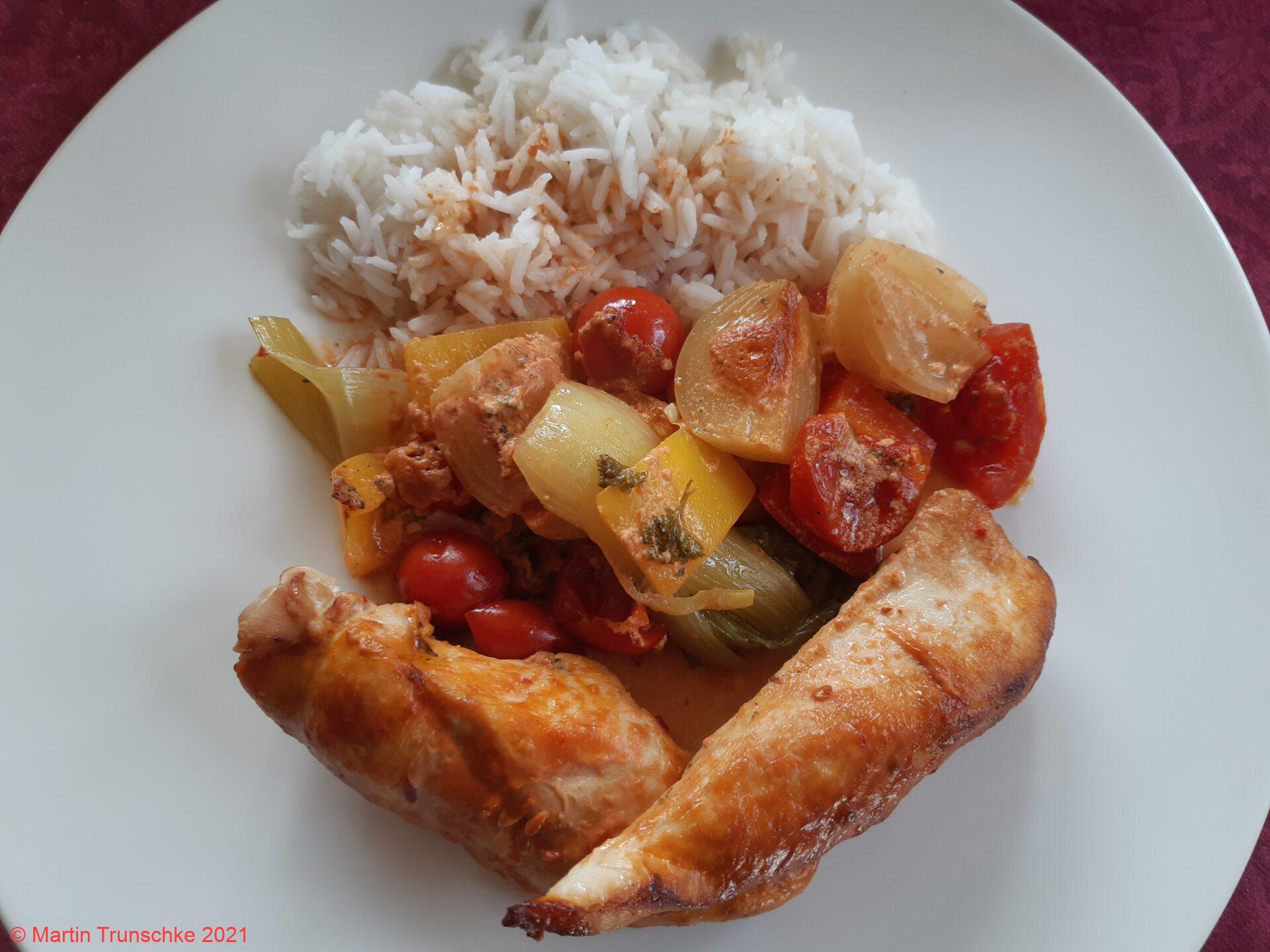 - Nun die Hähnchenbrüste längs halbieren und im Butterschmalz anbraten, so das sie etwas angebräunt sind. Auf das Gemüse setzen und die Soße über alles verteilen. Für ca. 40 Minuten bei 175°C in den Backofen damit. In der Zeit den Reis nach Packungsanleitung kochen.