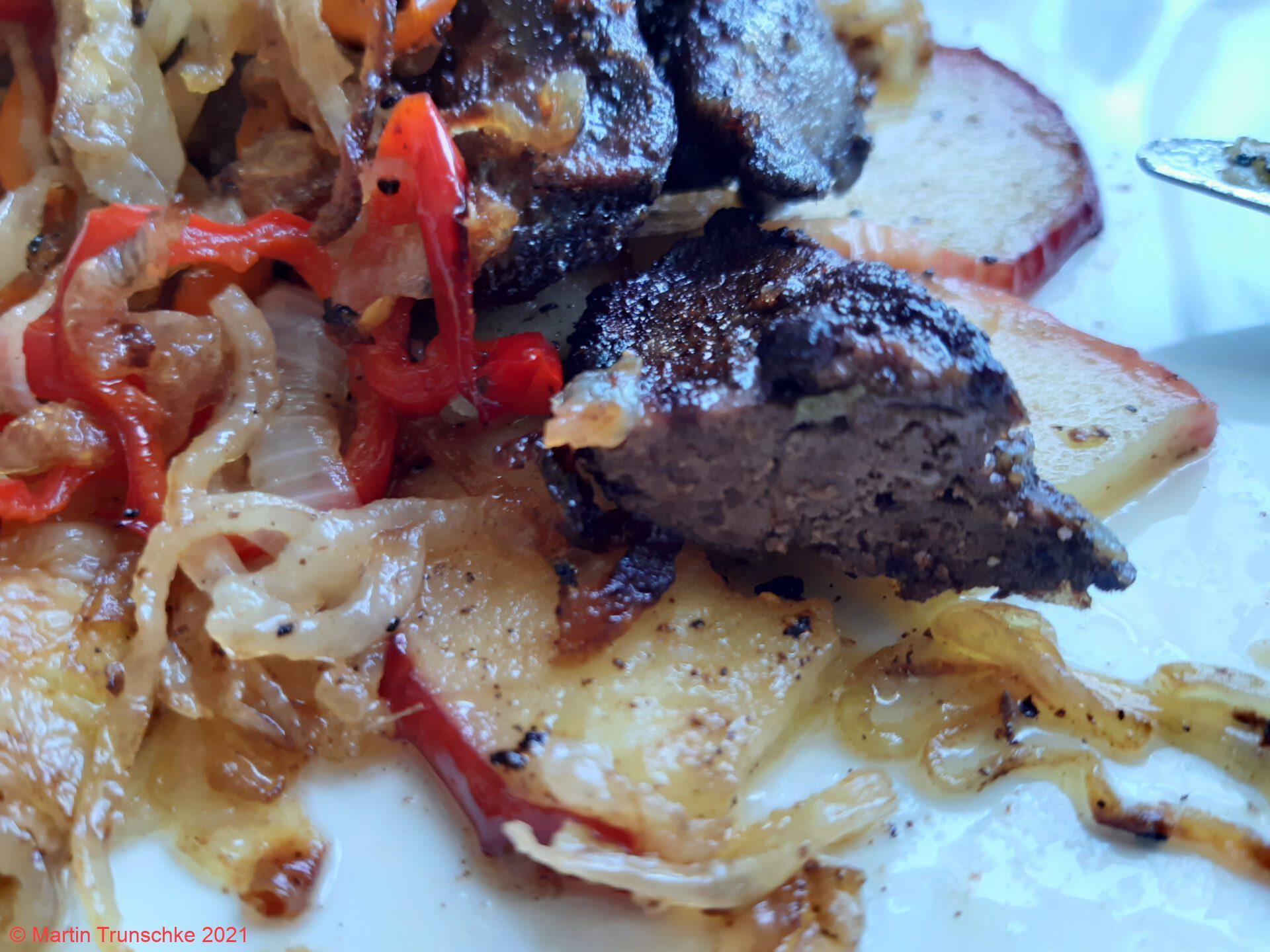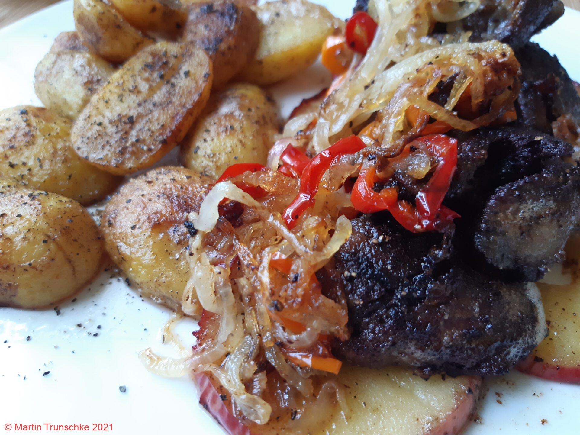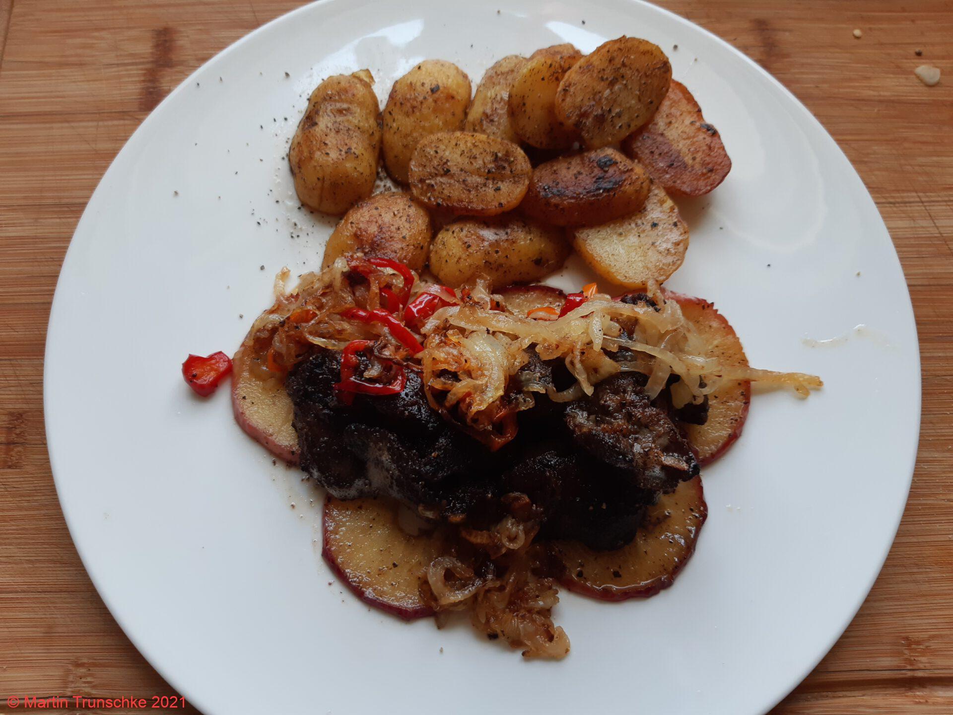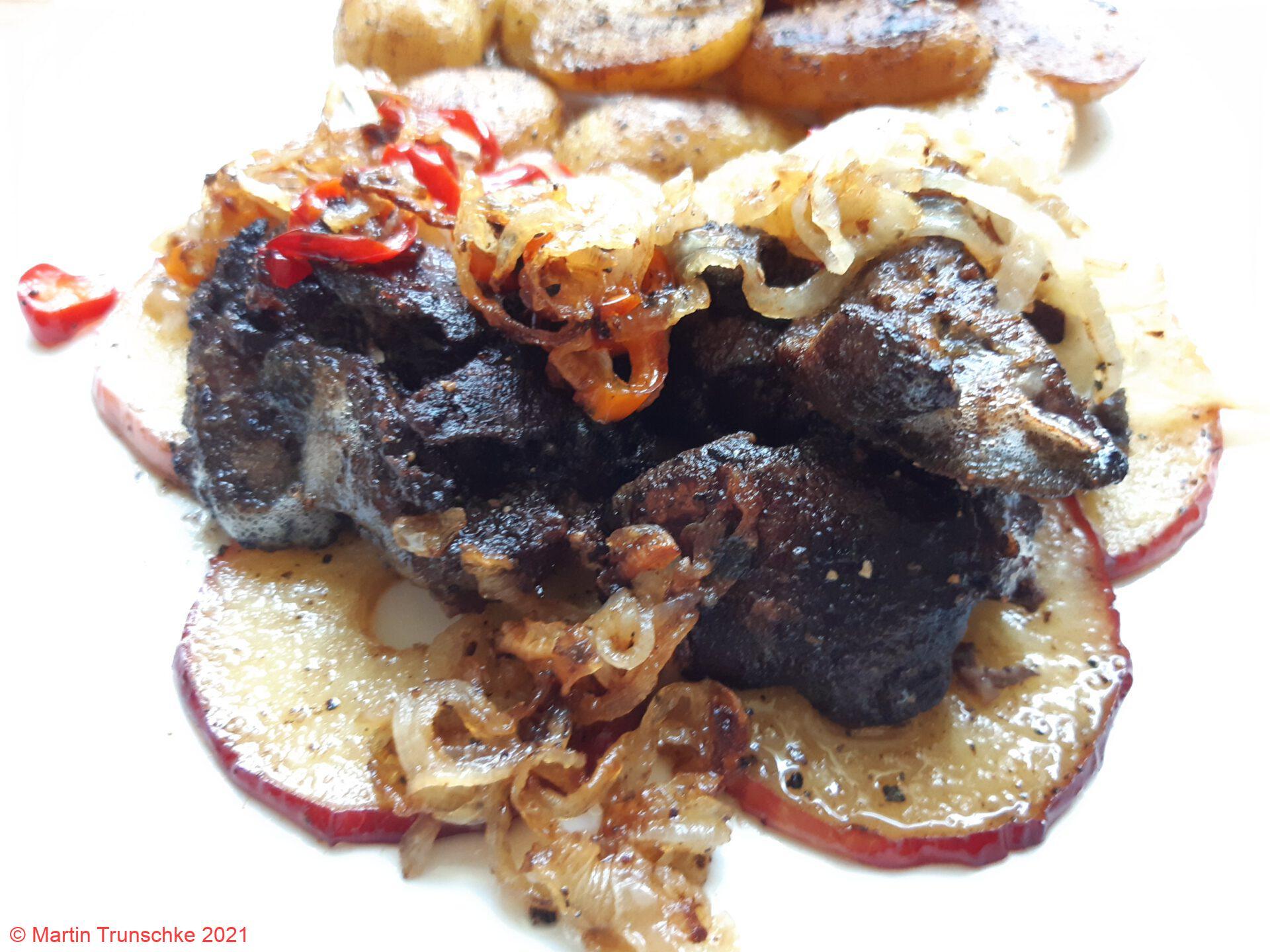 Hühnerleber nach Maddin´s Rezeptmit Zwiebelringen und Apfelringe. |