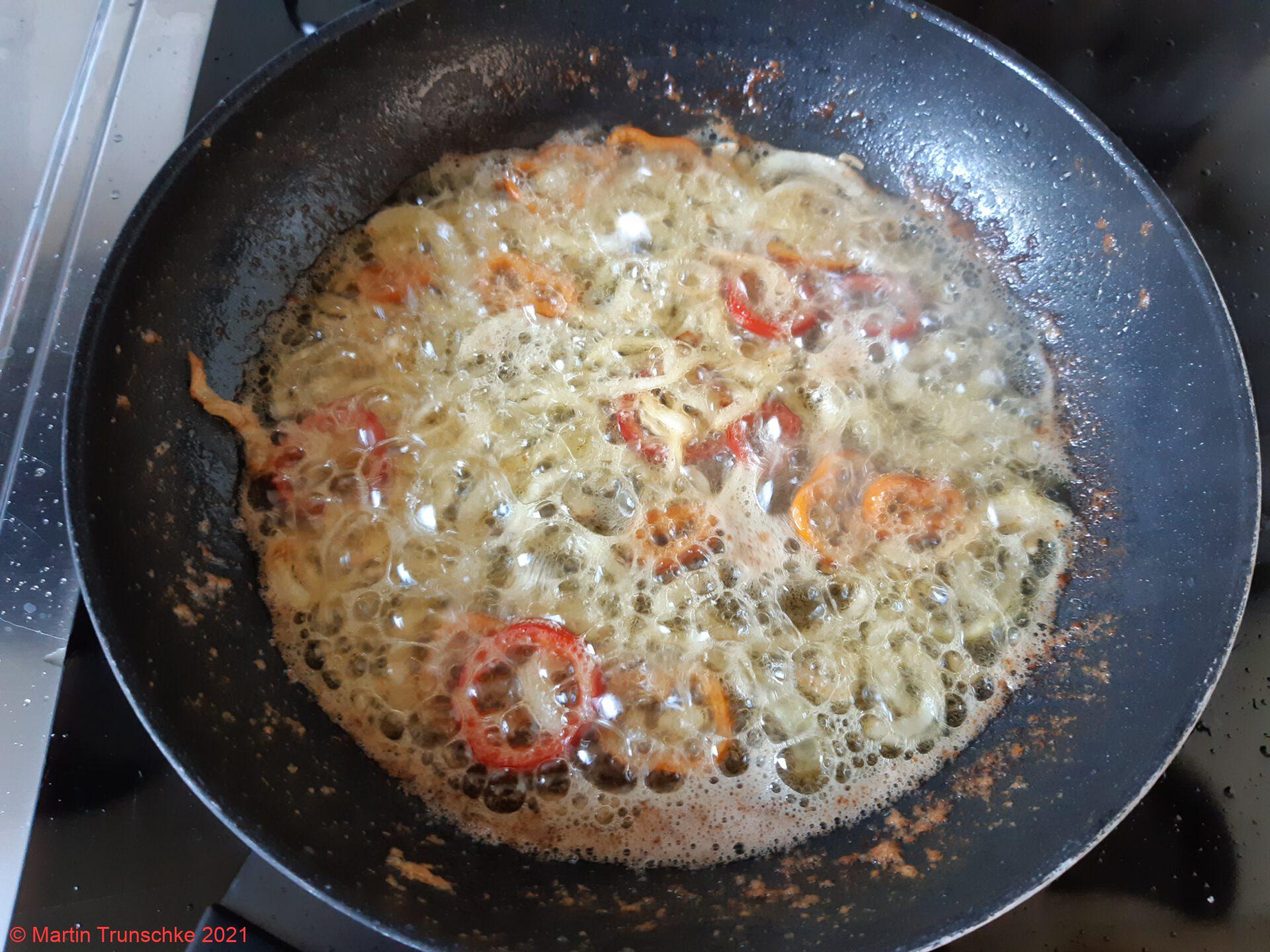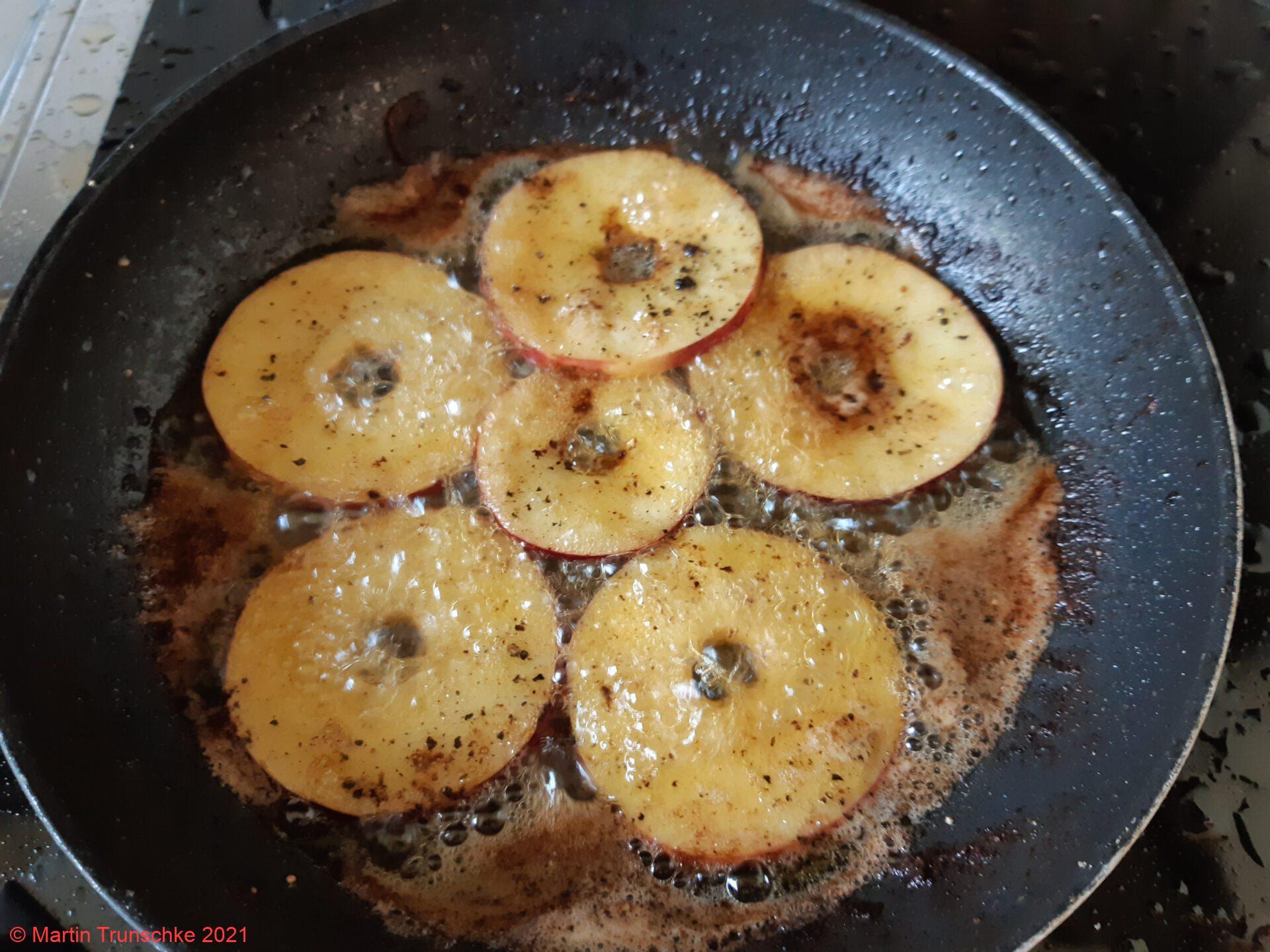 - Zwiebel pellen, vierteln und in Ringe schneiden. Apfel entkernen und auch in Ringe schneiden. Paprika in Ringe schneiden. Die Leber abspülen, mit Küchenkrepp trocken tupfen (evt. noch teilen), mehlieren. Nun die Zwiebel und den Paprika in heißen Butterschmalz glasig braten. Zwiebel und Paprika aus der Pfanne nehmen und die Leber im heißen Fett braten, so das sie außen knusprig ist und innen cremig. Pfeffer und Salz nach Geschmack. Die Leber zu den Zwiebeln geben. Jetzt die Apfelscheiben im gleichen Fett anbraten.