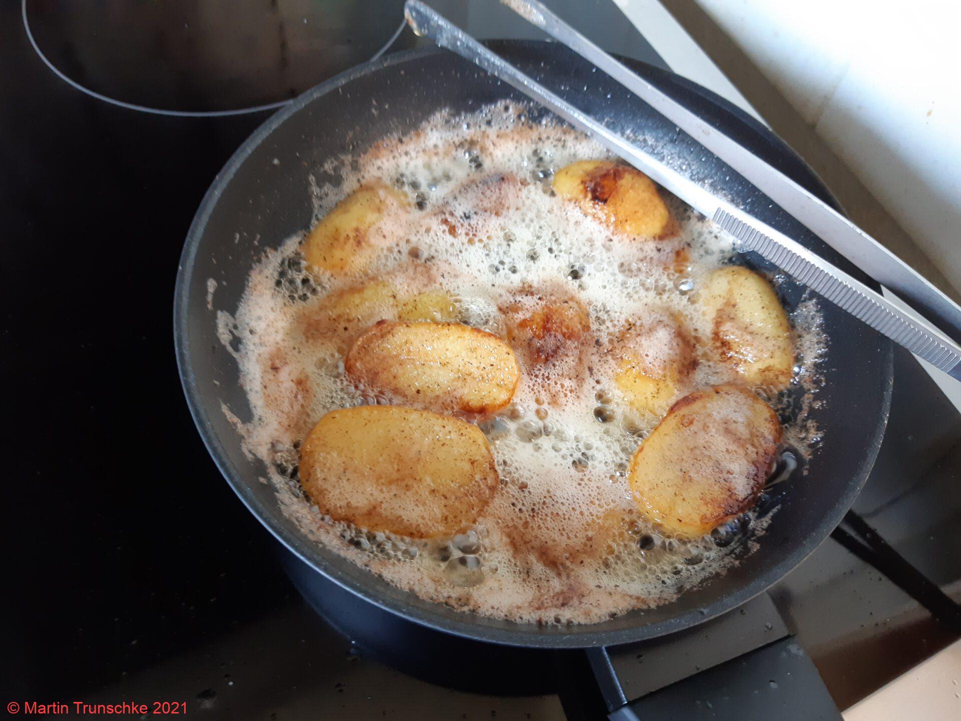 - Nebenbei die gekochten Drillinge in heißer Butter anbraten. Alles schön auf die Teller platzieren und dann genießen.