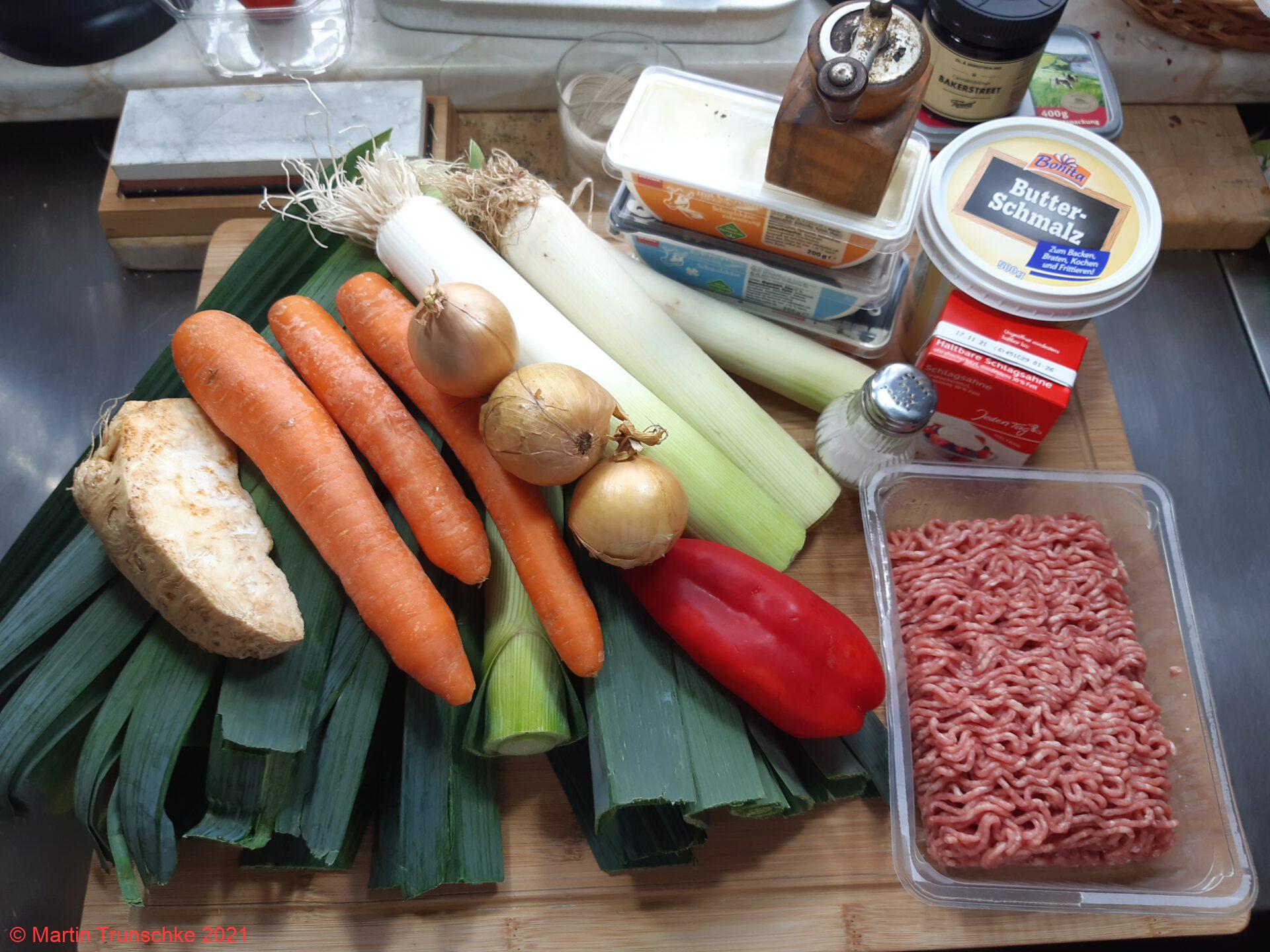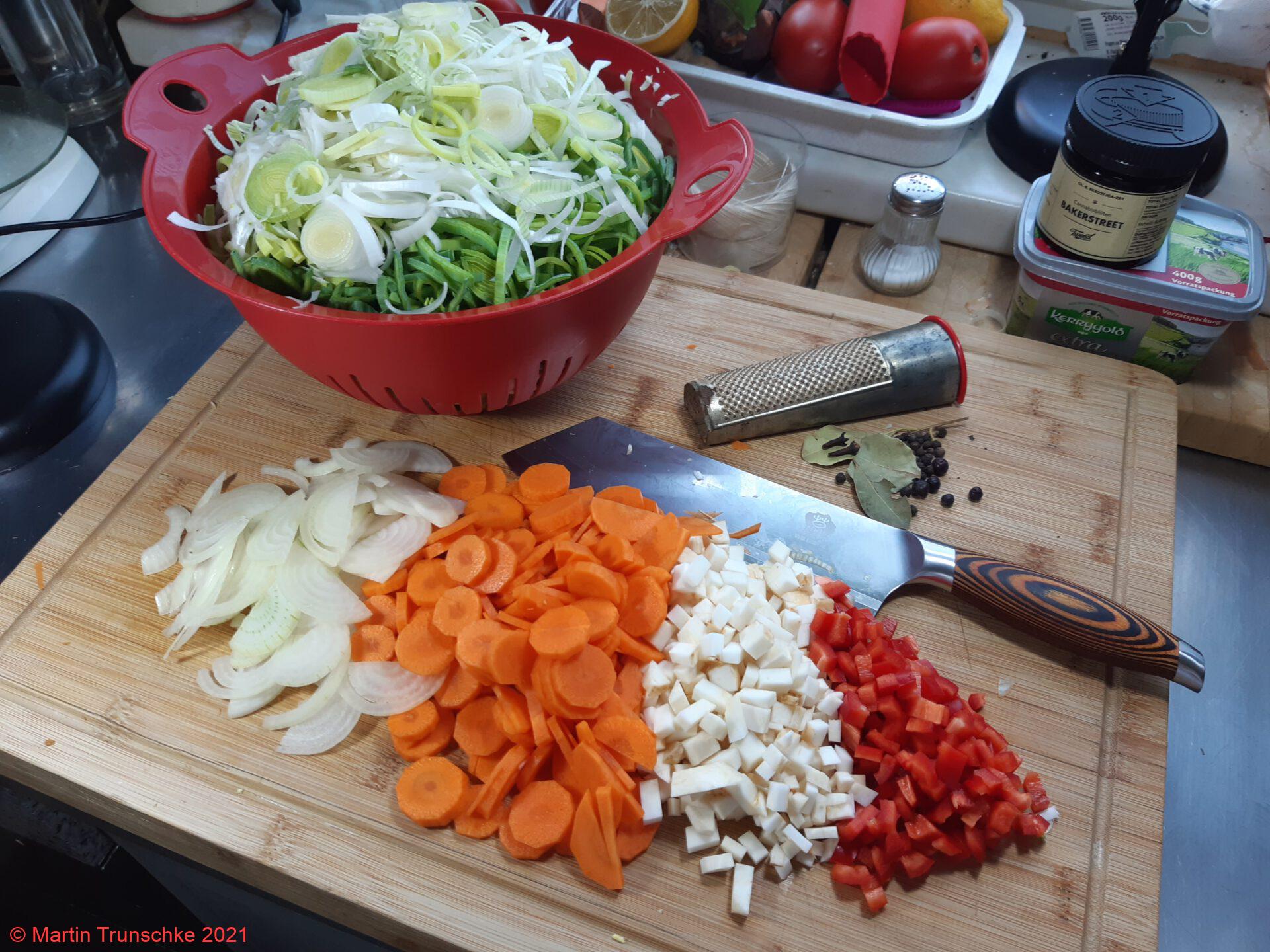 - Lauch putzen und in Ringe schneiden. Möhren, Sellerie und Paprika würfeln. Die Zwiebel in halbe Ringe schneiden.