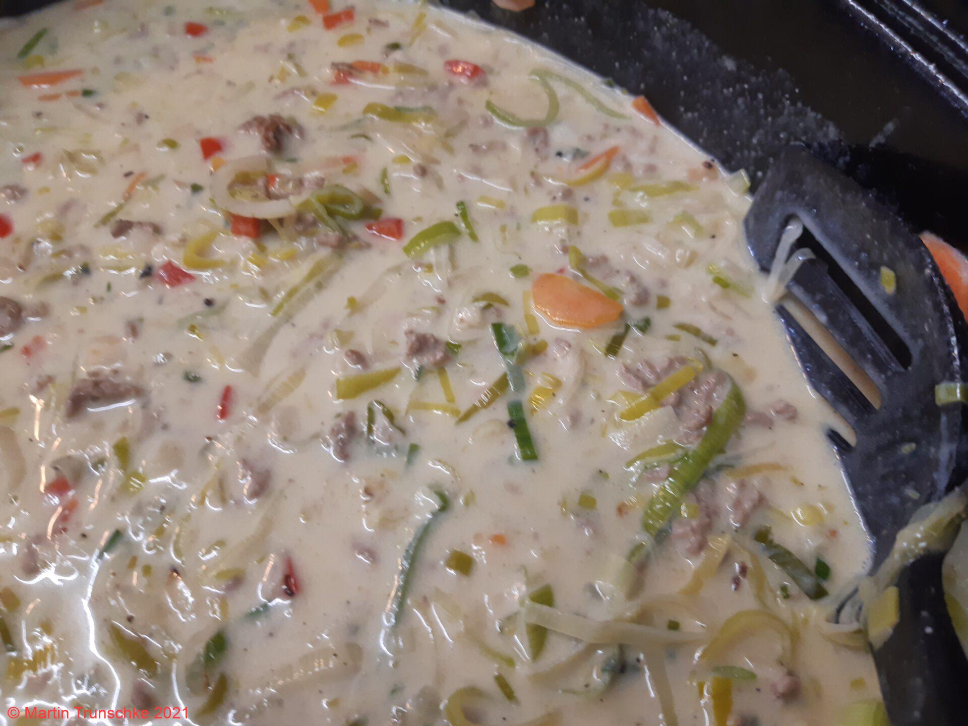 - Zum abbinden die Maggi Hack-Käse Mischung dazu geben. Alles noch einmal kurz aufkochen (5 Min.).
