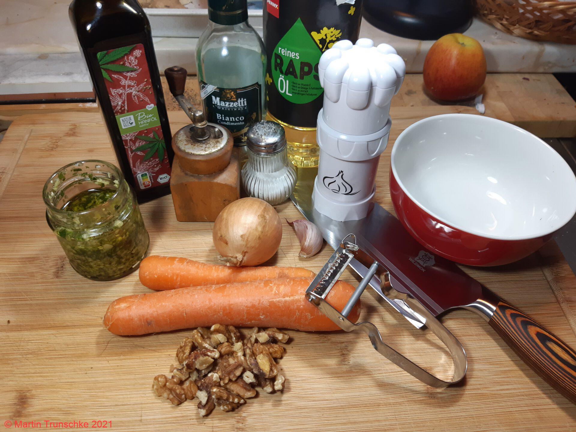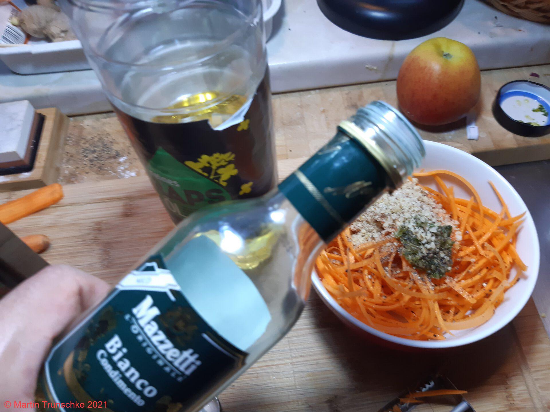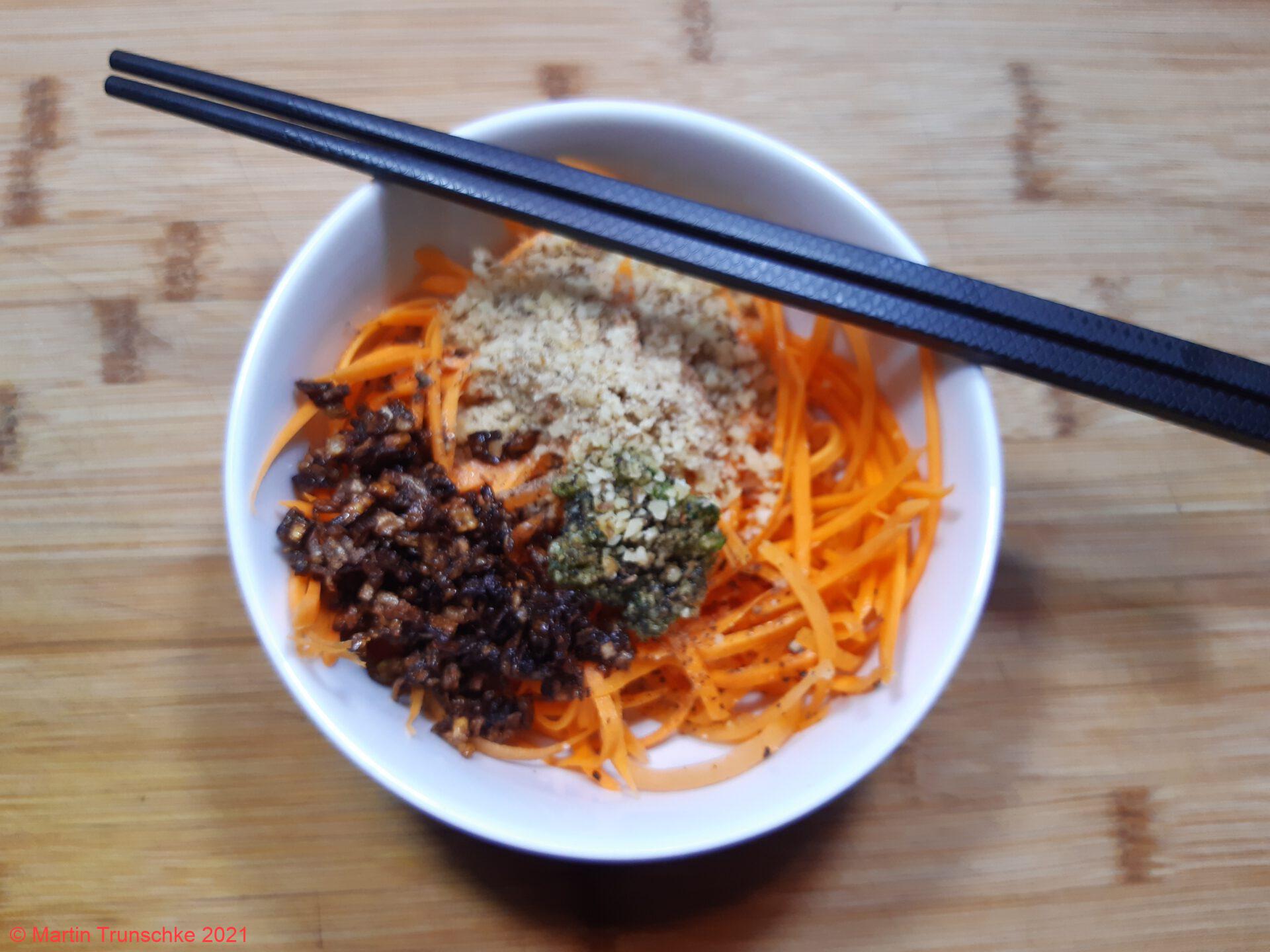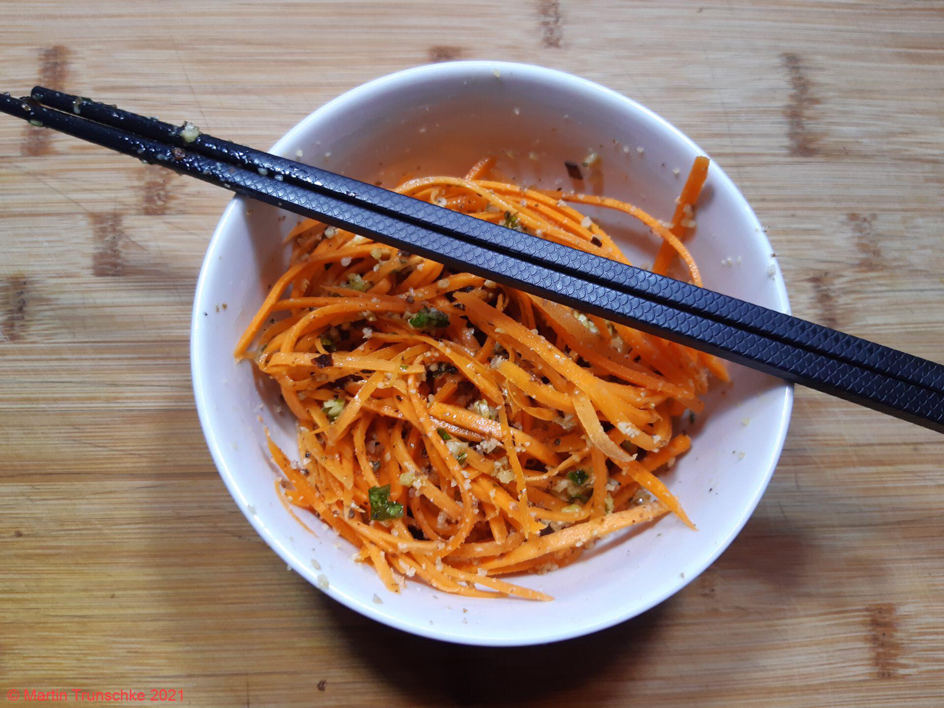 - Die flüssigen Zutaten, Salz und Pfeffer, Sambal Olek in einer kleinen Schale vermischen und über die Karottenstreifen geben. Alles gut umrühren und über Nacht in den Kühlschrak stellen. Am nächsten Tag hat man dann einen leckeren Salat oder Beilage zum Fleisch.