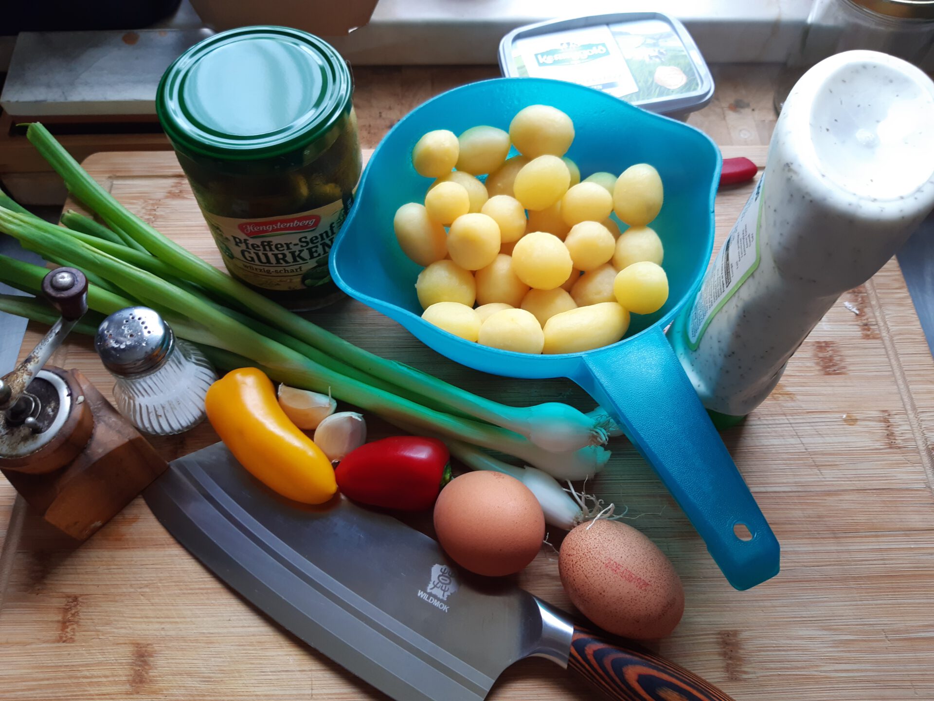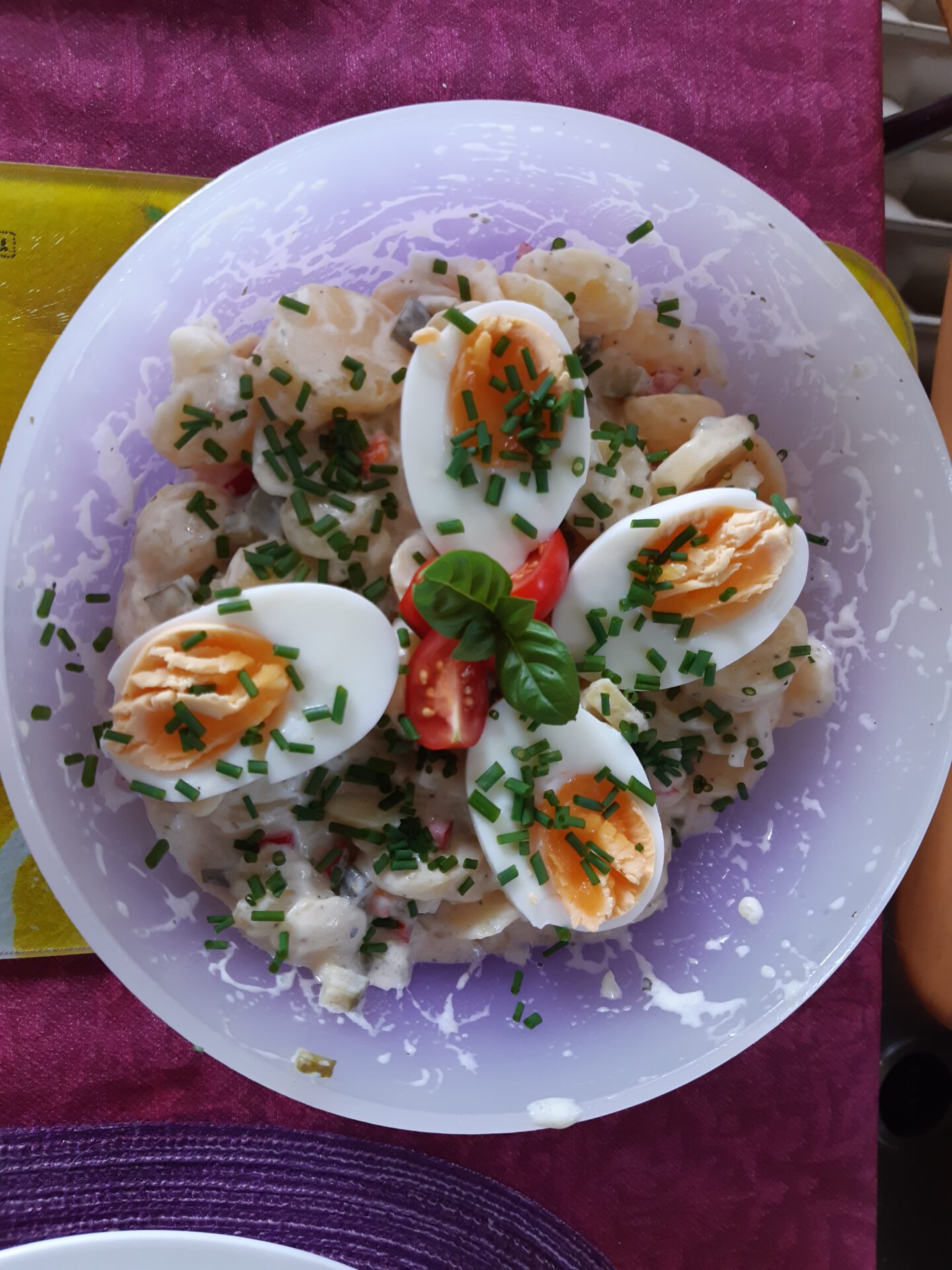 - In einer Schüssel die Marinade mischen, außer der Remoulade. Gurken, Zwiebel, Paprika und Knoblauch klein würfeln und zu der Marinade geben. Die gekochten Kartoffeln in dünne Scheiben schneiden und nach und nach unter die Mische heben ca. 30 Min. ziehen lassen. Zuletzt die Remoulade dazu geben und mit den Eiern dekorieren.