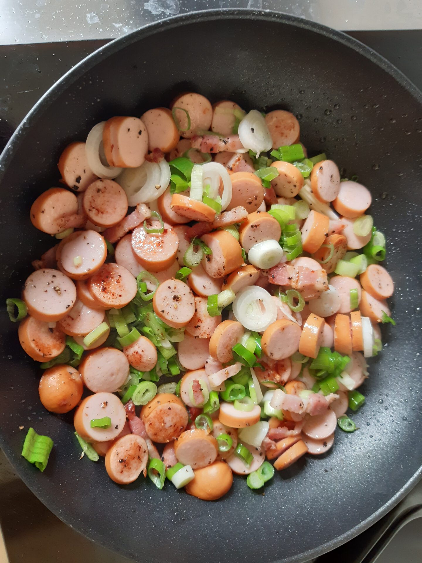 - Die Bockwürstchen in Röllchen schneiden und in Butter leicht anbraten. Die Zwiebeln und den Knoblauch klein schneiden und zu den leicht gebräunten Wurstscheiben geben.