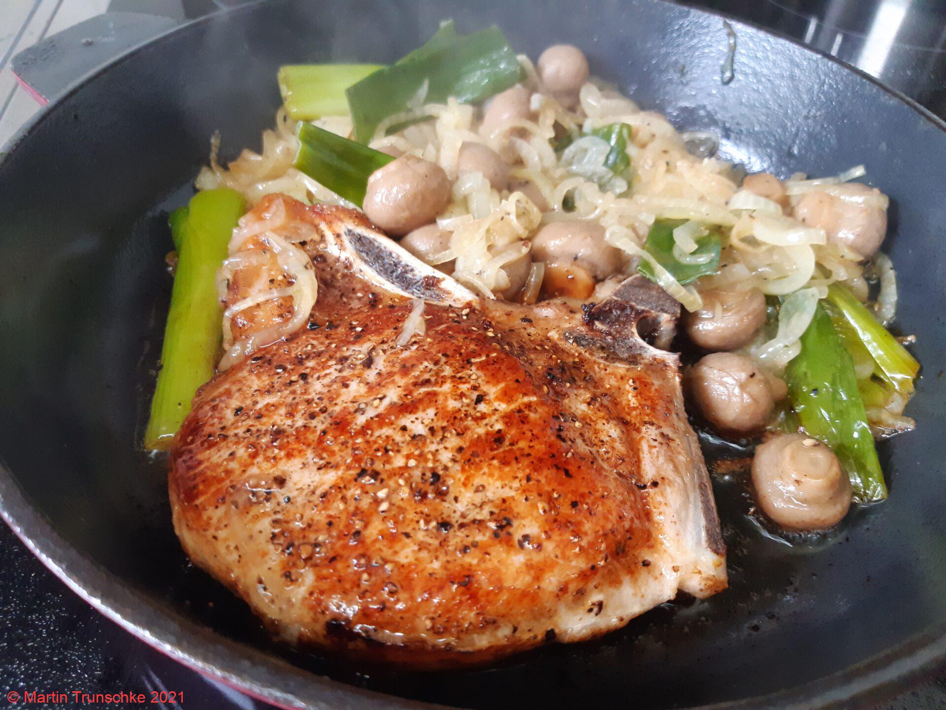- Wenn das Kotelett fertig ist die Kochplatte ausstellen und die Schmorzwiebeln mit in die Pfanne geben und zugedeckt ruhen lassen bis der Stampf gestampft ist. 😁