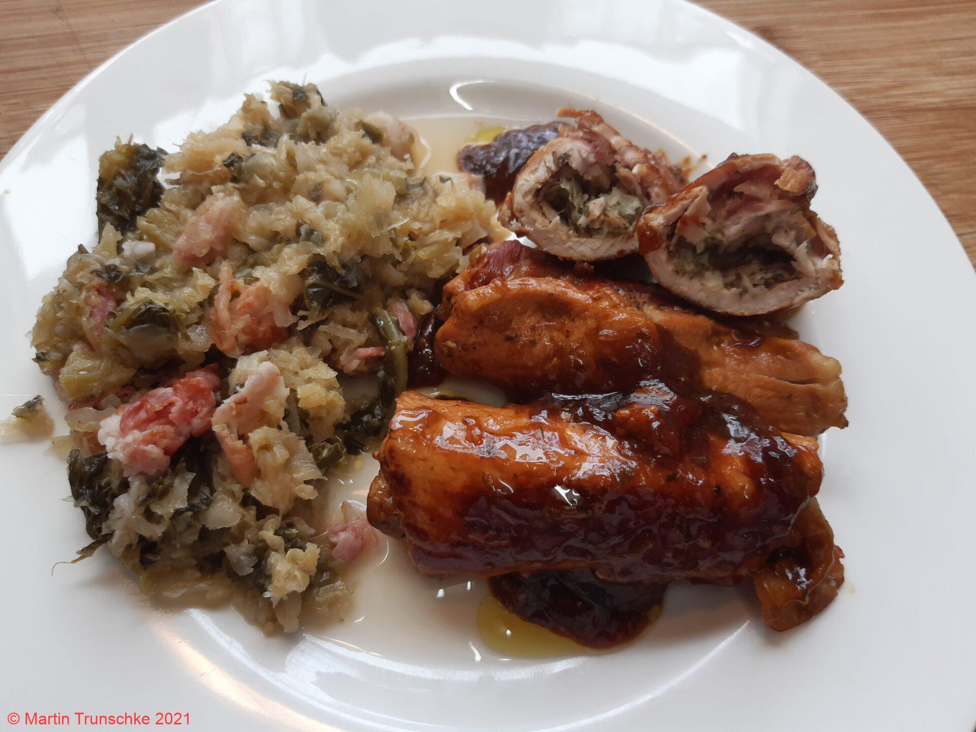 - Zusammen rollen, mit einem Zahnstocher feststecken und in heißem Butterschmalz rund rum anbraten. Etwas Brühe angießen und ca. 20 Minuten köcheln lassen. Dann die Soße mit etwas Mehl abbinden.
