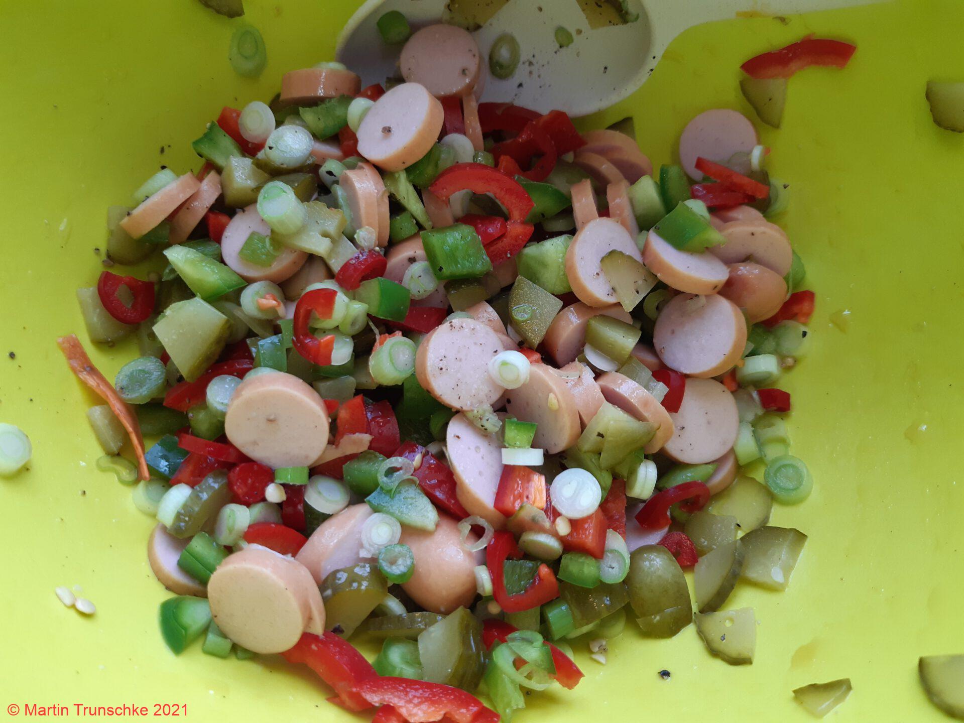 - Die Nudeln nach Packungsanweisung kochen. Peperoni, Paprika, Gurken Würstchen und Zwiebel würfeln und in einer Schüssel vermischen.
