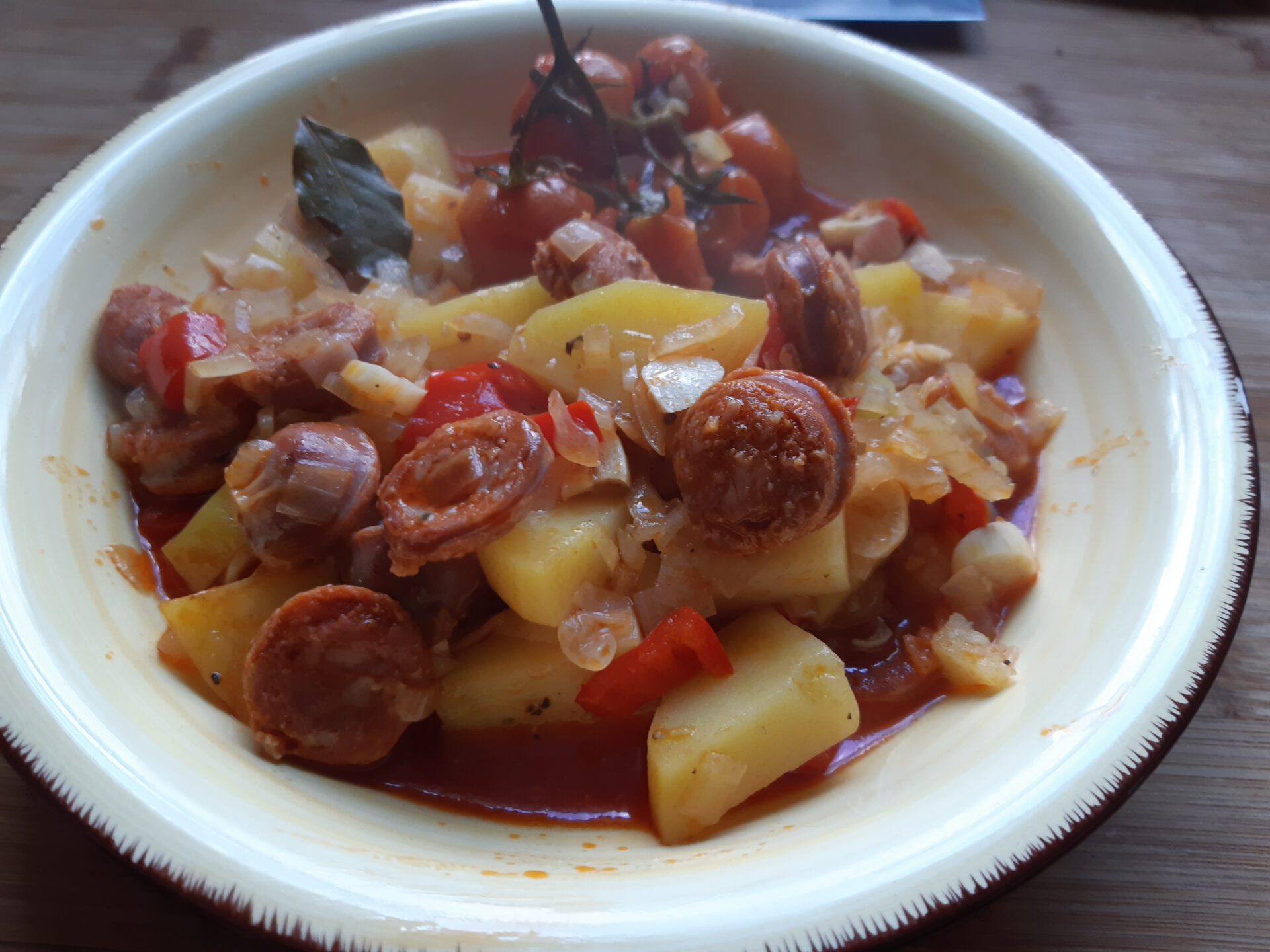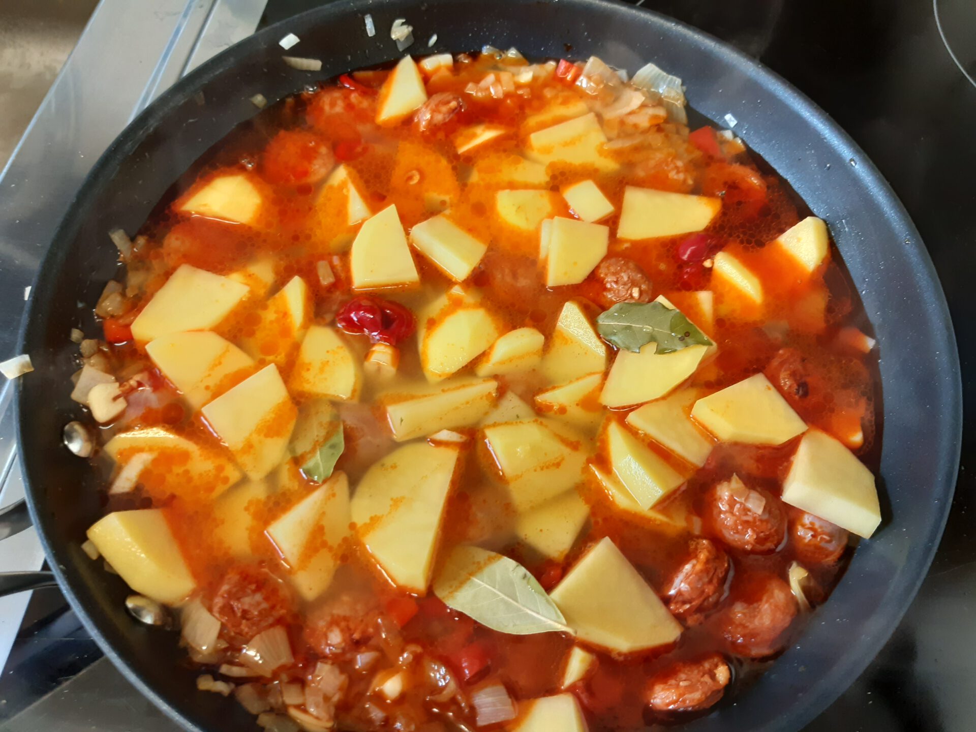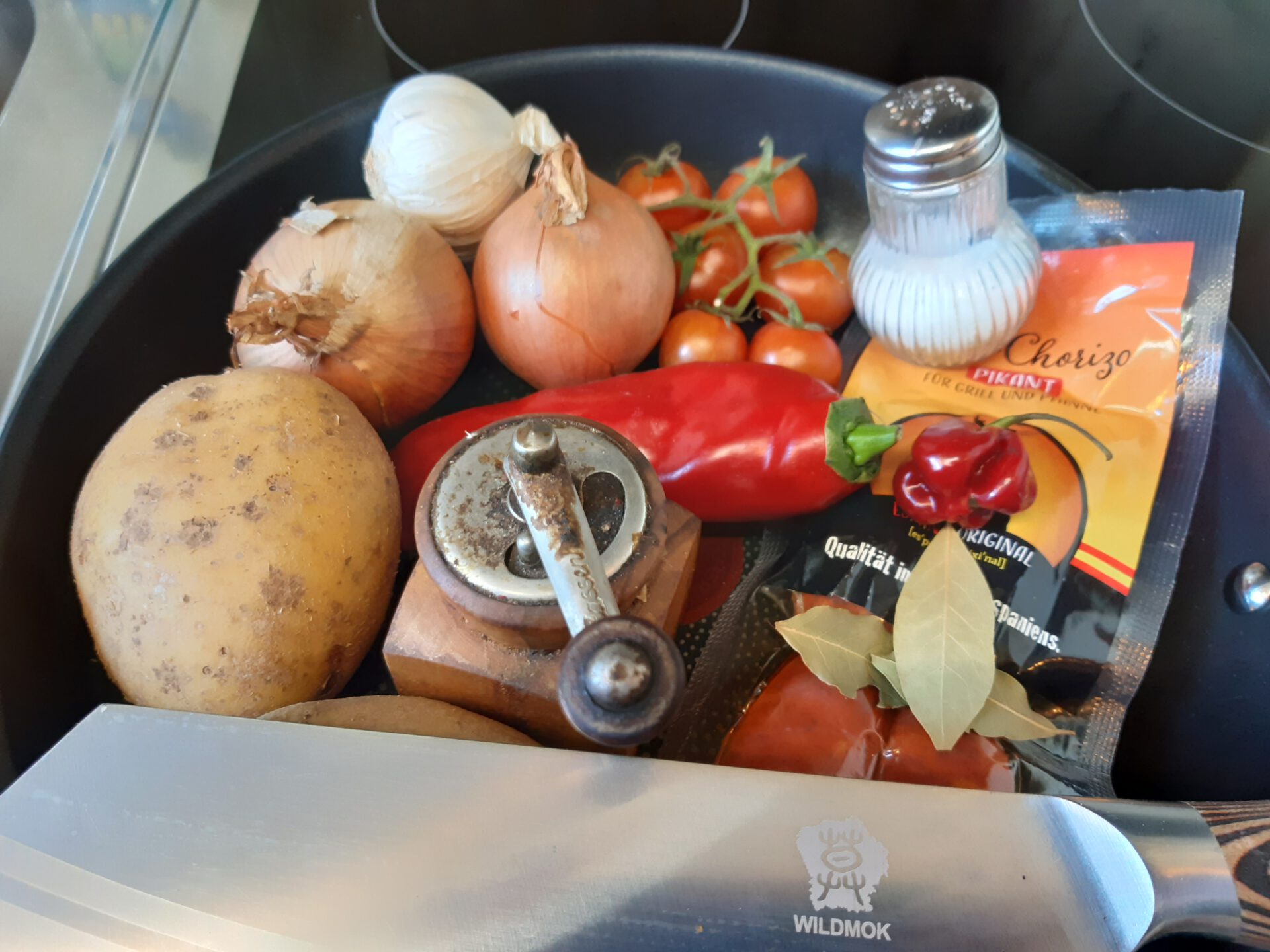 - Die Knoblauch- und Zwiebelwürfel in heißem Olivenöl glasig braten und die Chorizo-Scheibchen, die Paprika und Habanero kurz mit braten. Dann die Kartoffeln zufügen und mit so viel Brühe mit dem Lorbeer aufgießen, dass sie gerade bedeckt sind. Zugedeckt bei nicht zu starker Hitze 25 Min. kochen. Die Kartoffeln sollen weich sein, aber nicht zerfallen. Mit Pfeffer üppig, mit Salz sparsam würzen.