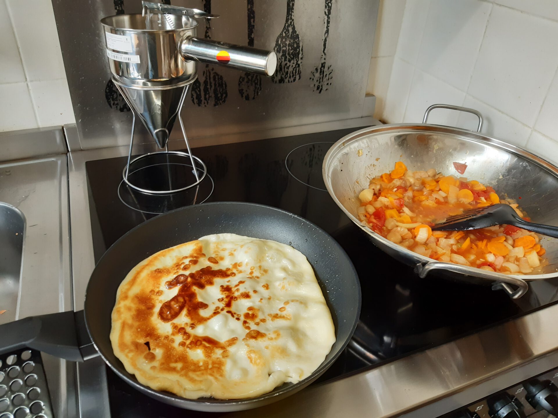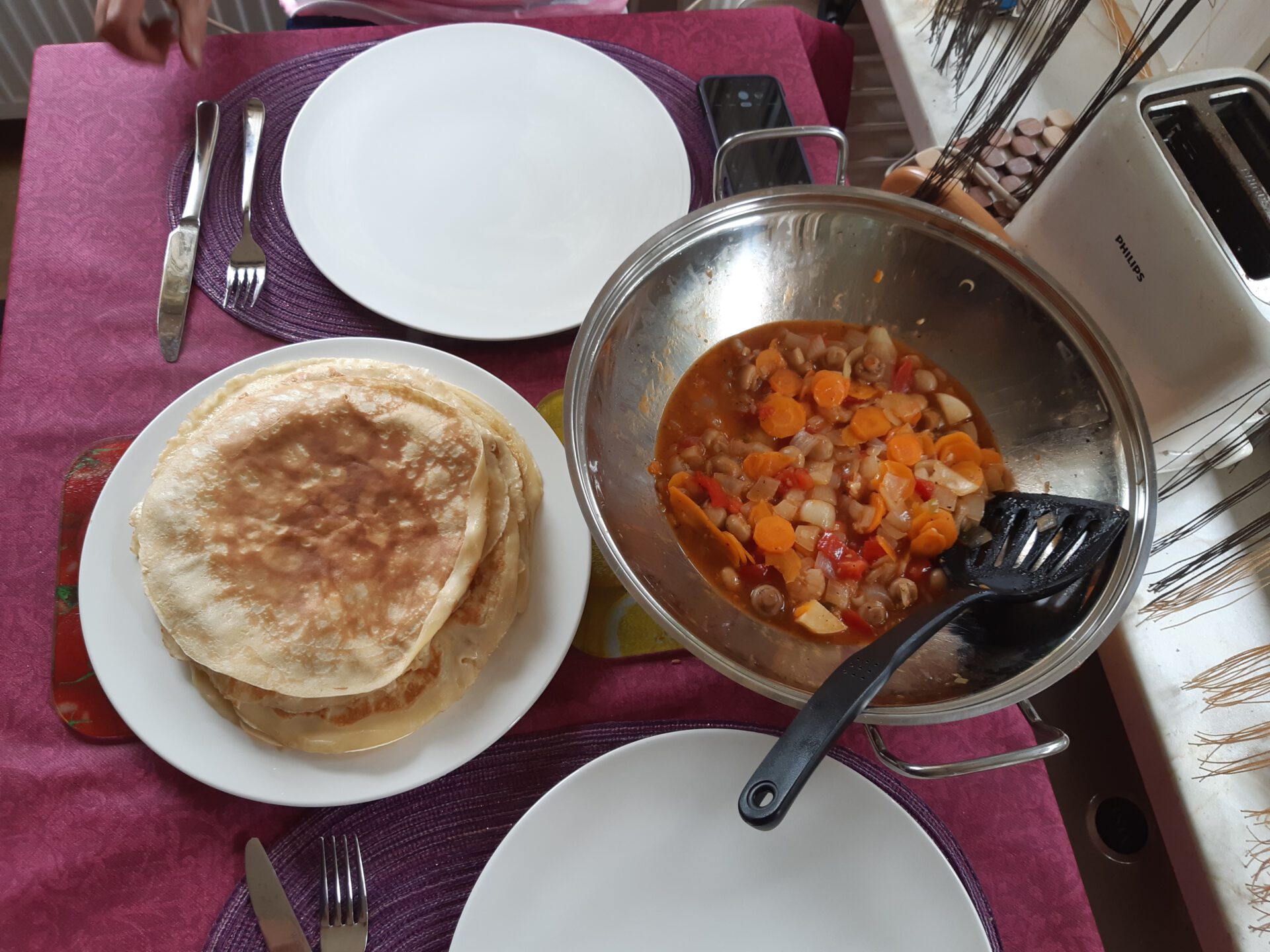 - Nachbarin anrufen, Tisch decken. Jeder so wie er will die Pfannkuchen belegen.
