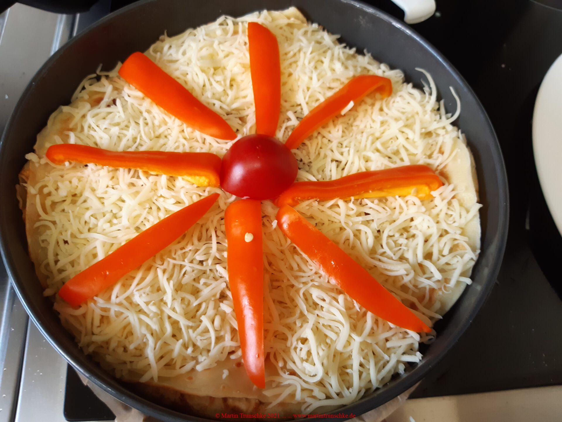 - Als Deckel wieder einen Pfannkuchen geben und auch mit Käse bestreuen.