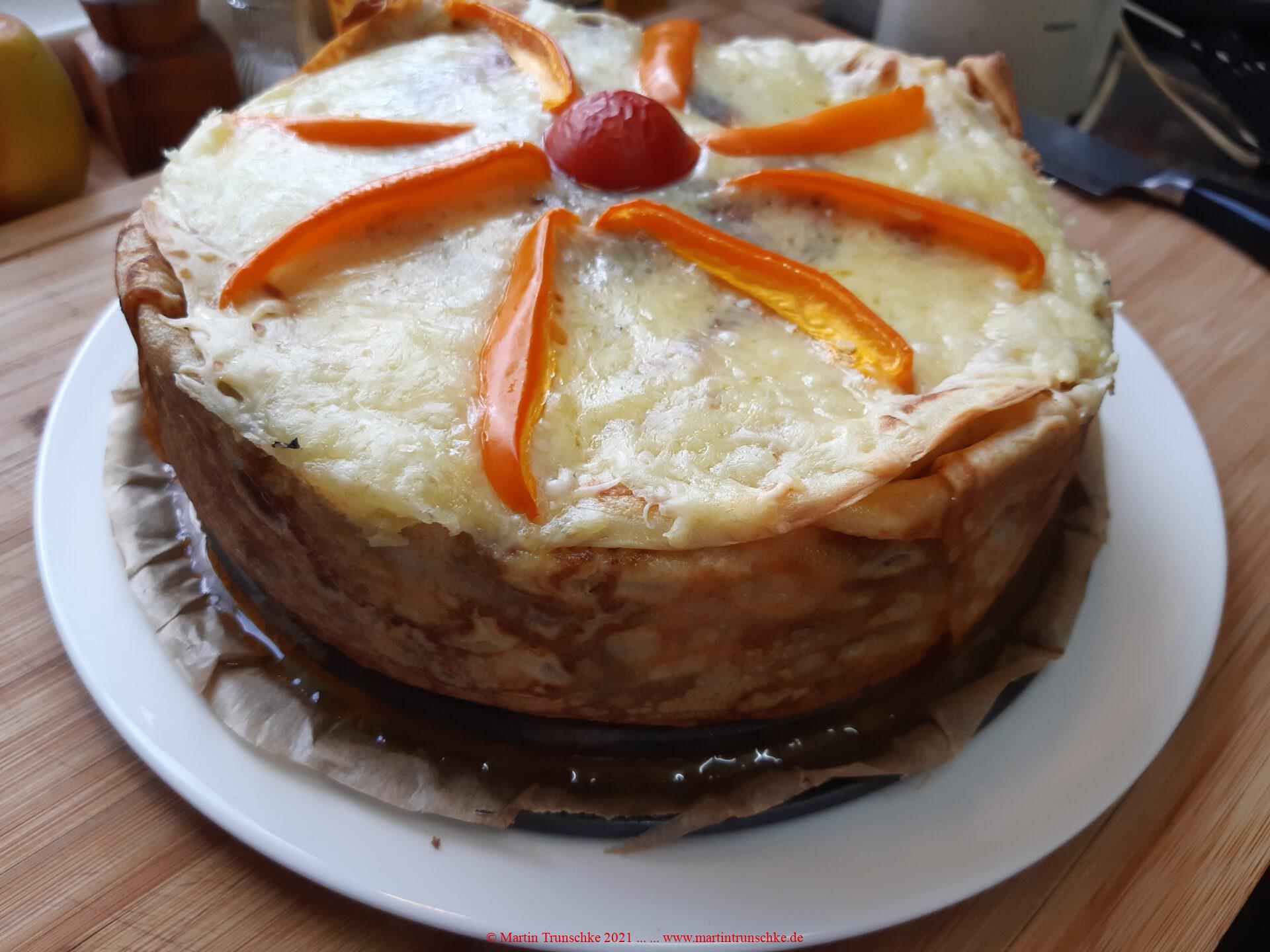 - Eine 26er Springform einfetten, Dann 4 Pfannkuchen über den Rand legen und einen als Boden.