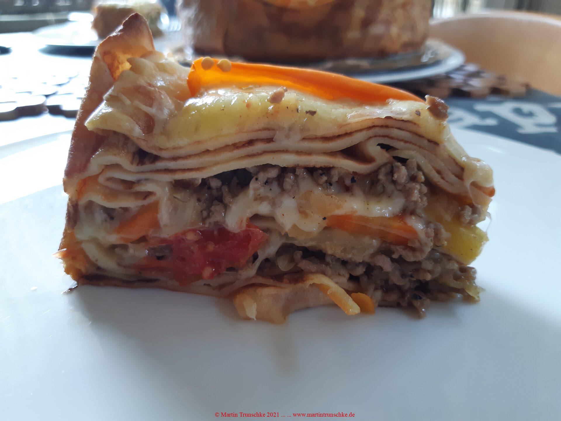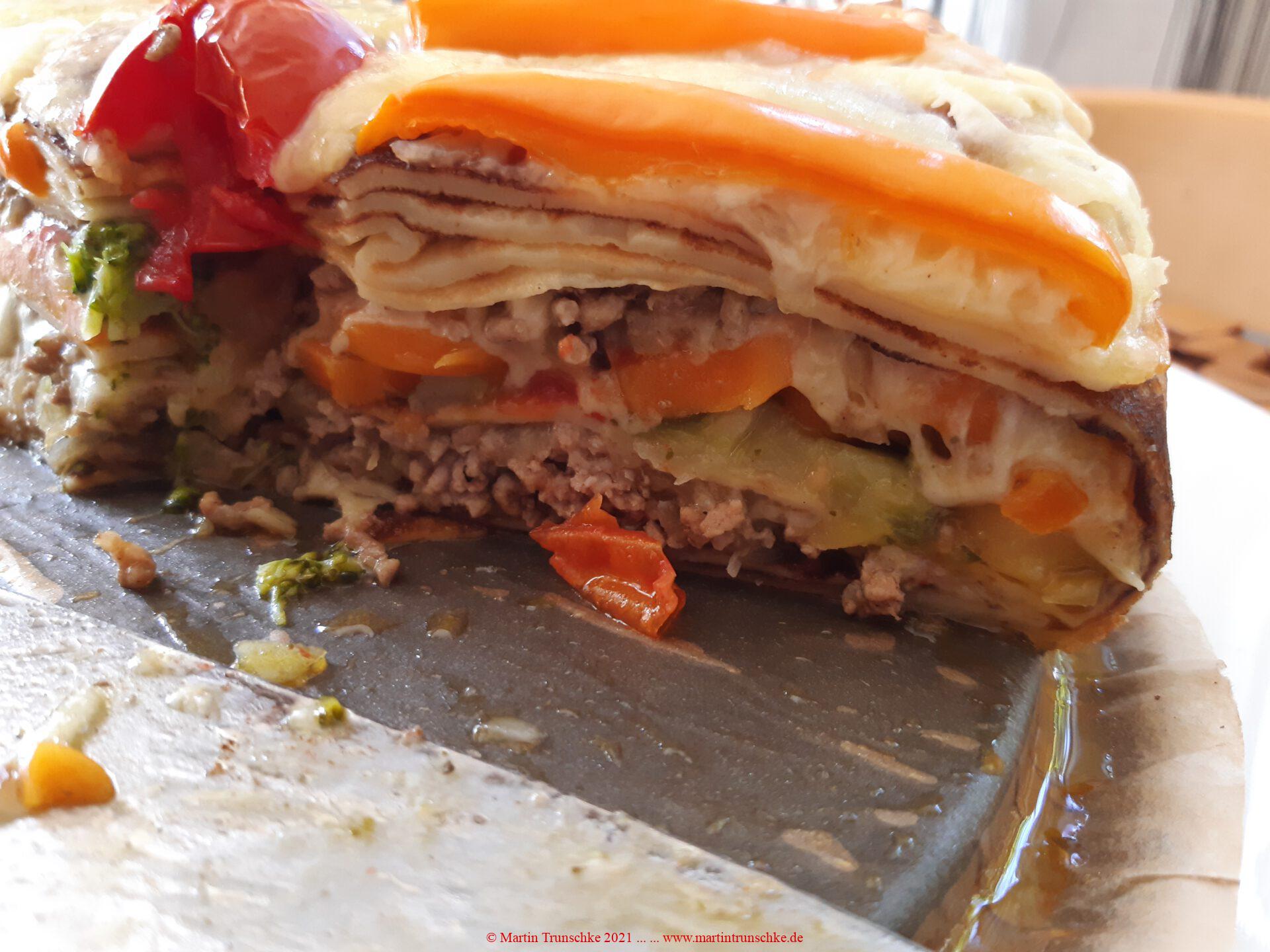 - Das gebratene Mett darauf geben und mit Käse bestreuen. Darauf wieder einen Pfannkuchen geben.