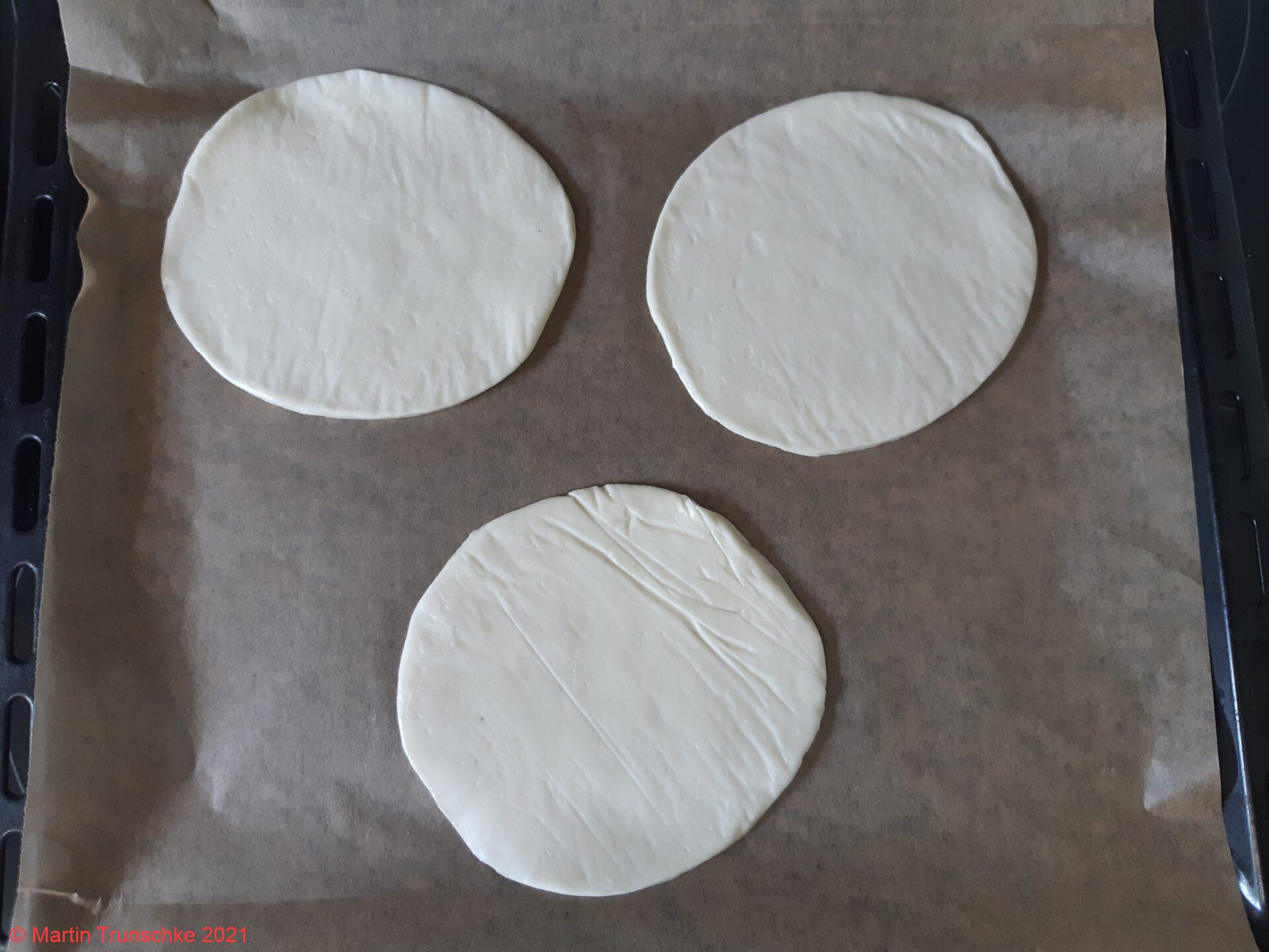 - Pizzateilchen auf zwei mit Backpapier ausgelegte Backbleche legen und mit je 2 Esslöffel Pizzatomaten bestreichen.