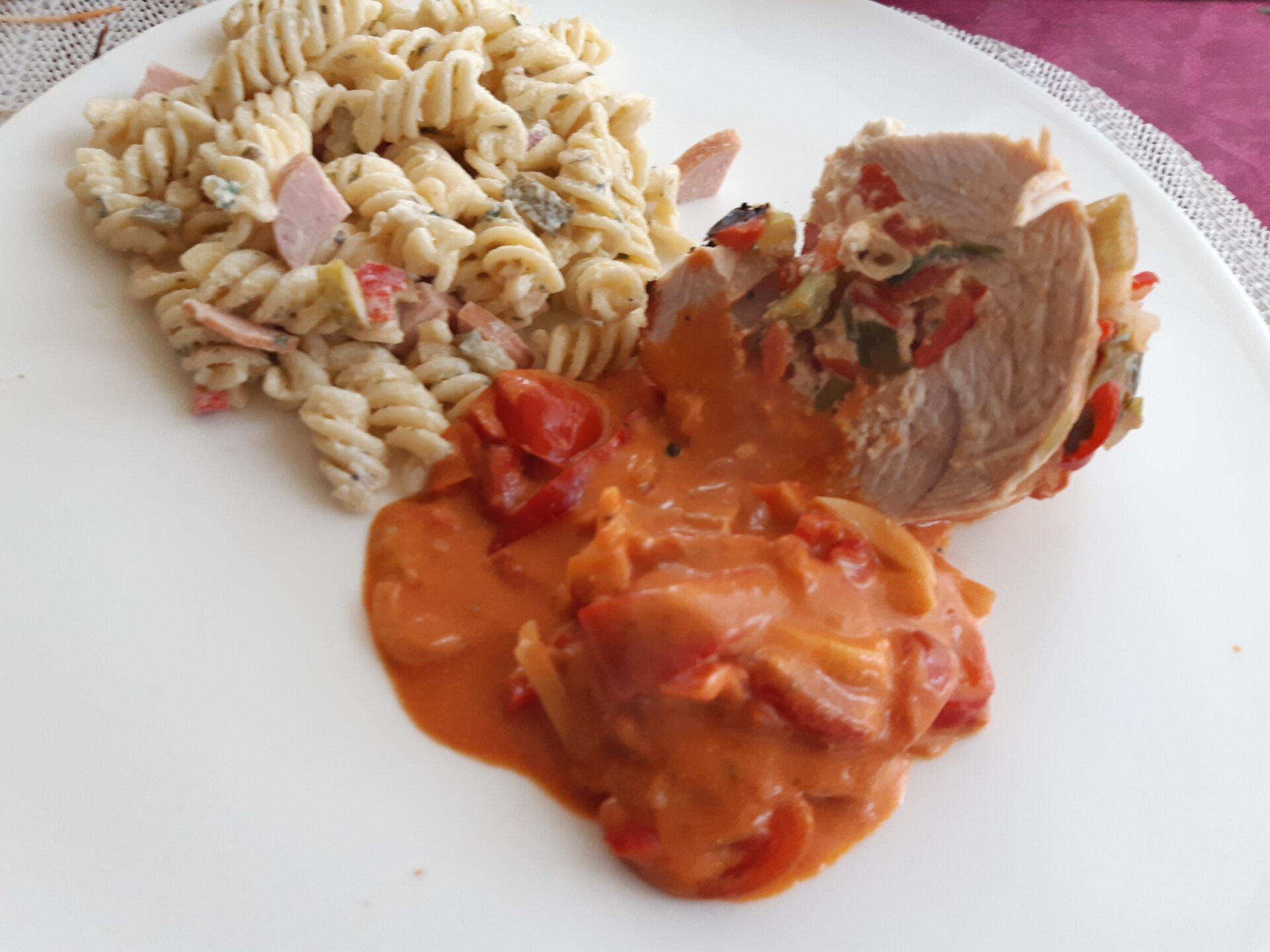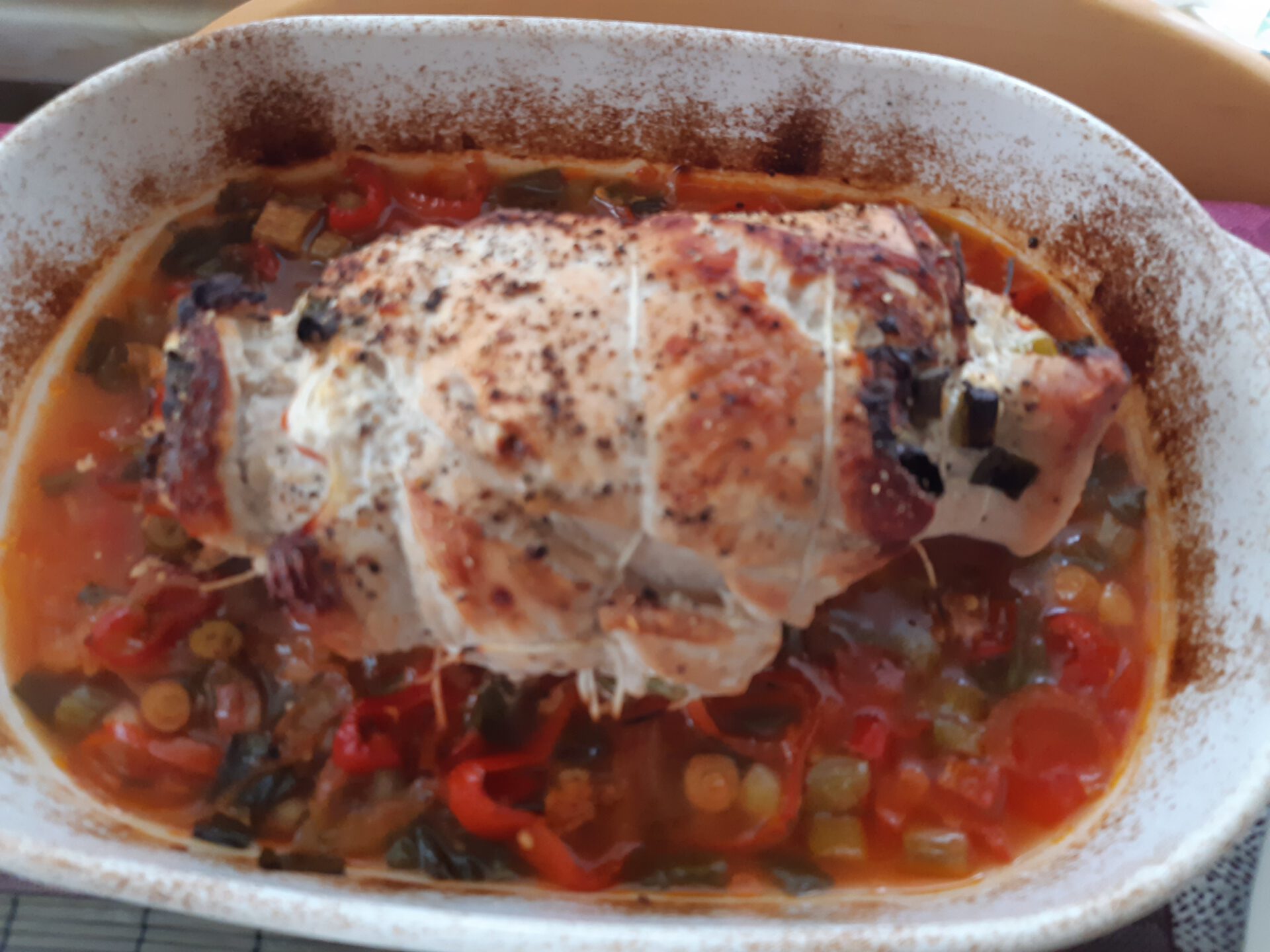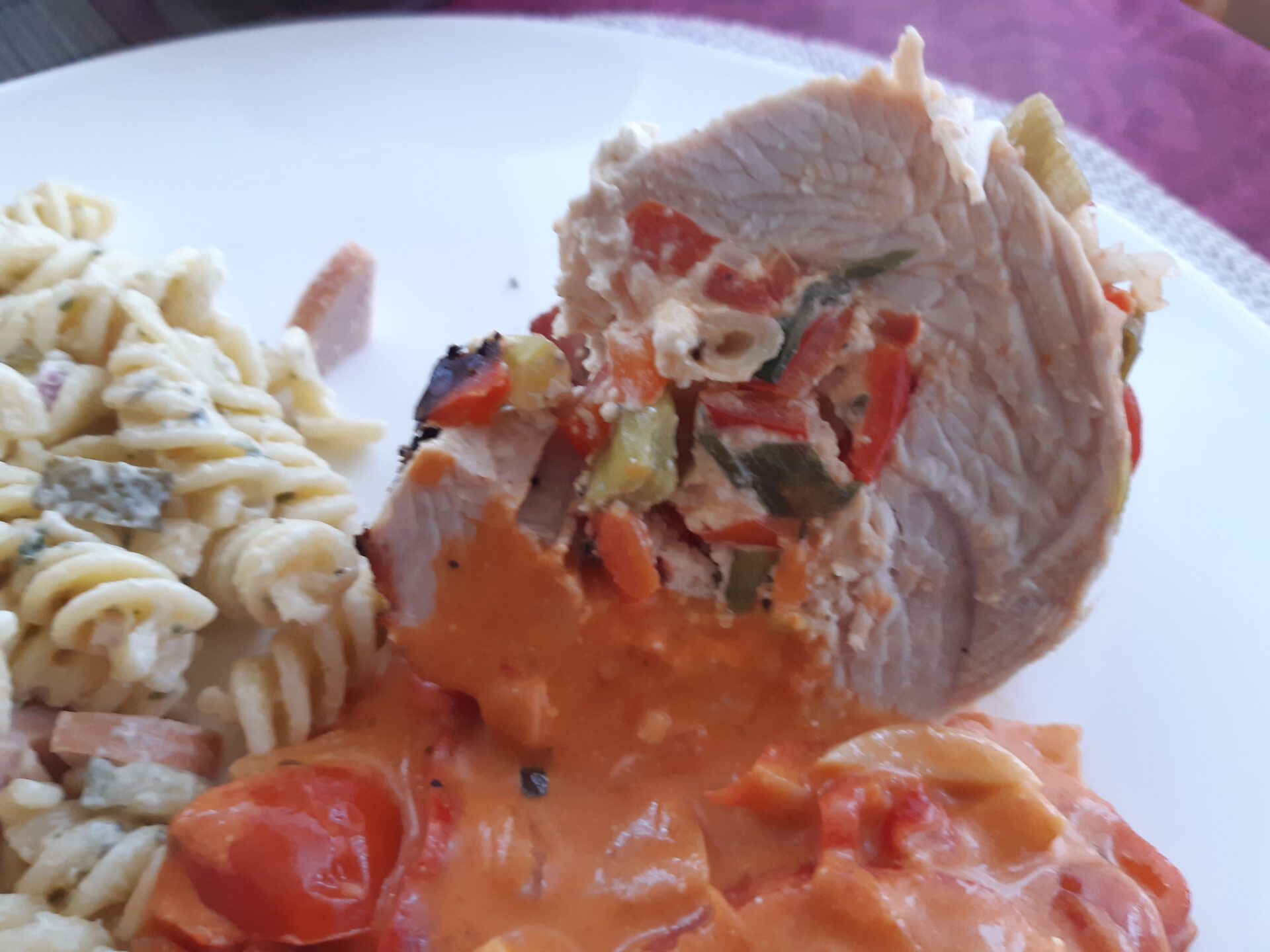 - Das restliche Gemüse, den Knoblauch und das Letscho in eine gefettete Auflaufform verteilen, Tomatensaft angießen und den restlichen Schmand über die Mitte der Form verteilen. Darauf dann die gerollte Putenbrust darauf setzen. Den Backofen auf 200°C vorheizen und den Braten für ca. 45-60 Minuten backen. (je nach Größe) Ich hab ein Thermometer drin und bei einer Kerntemperatur von 70°C den Braten aus der Röhre genommen. Mit passender Beilage servieren und es sich schmecken lassen.