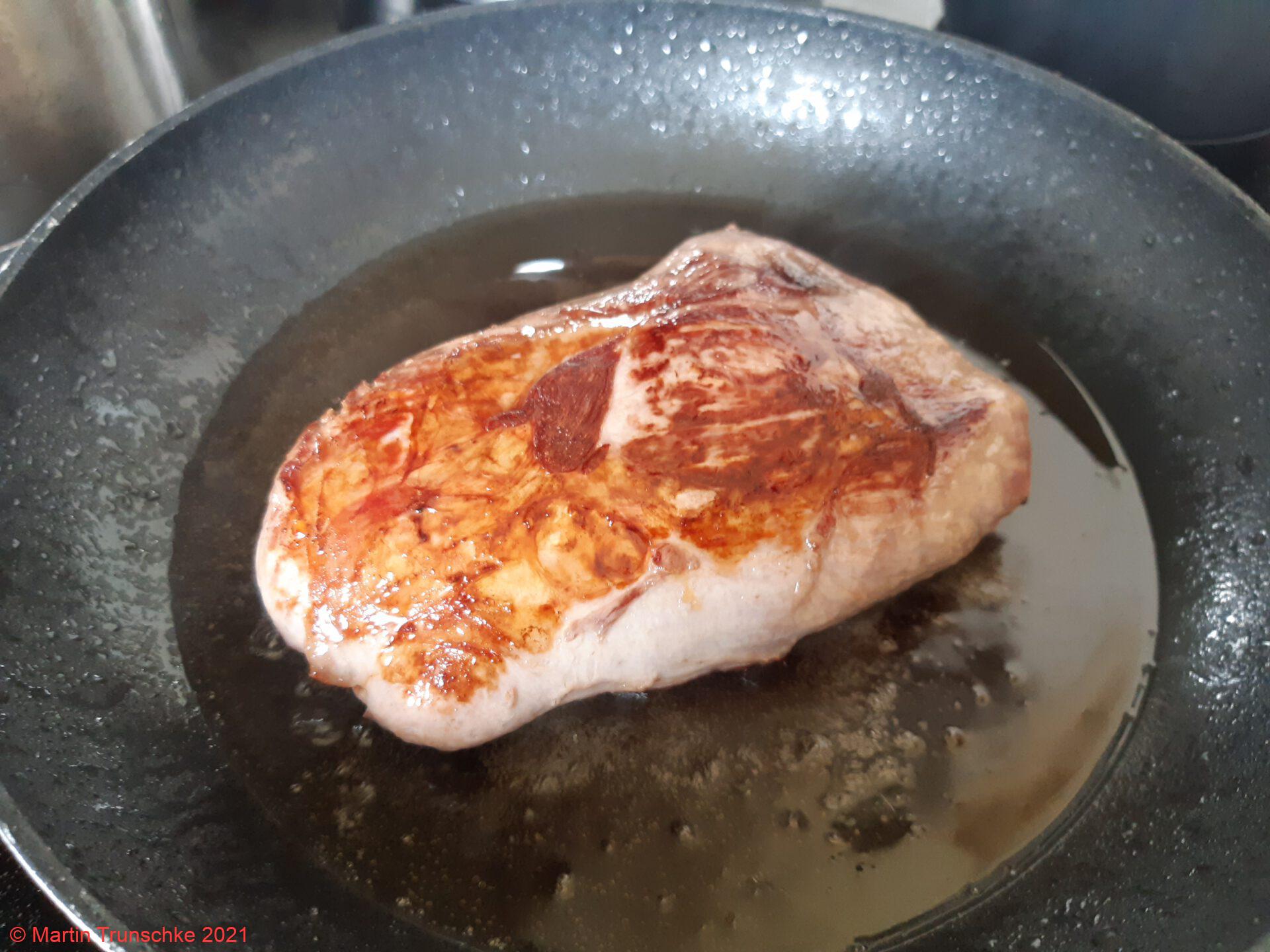 - Das Butterschmalz in einer Pfanne heiß werden lassen und das Stück von allen Seiten ca. 1,5 Minuten anbraten. (soll etwas Farbe bekommen)