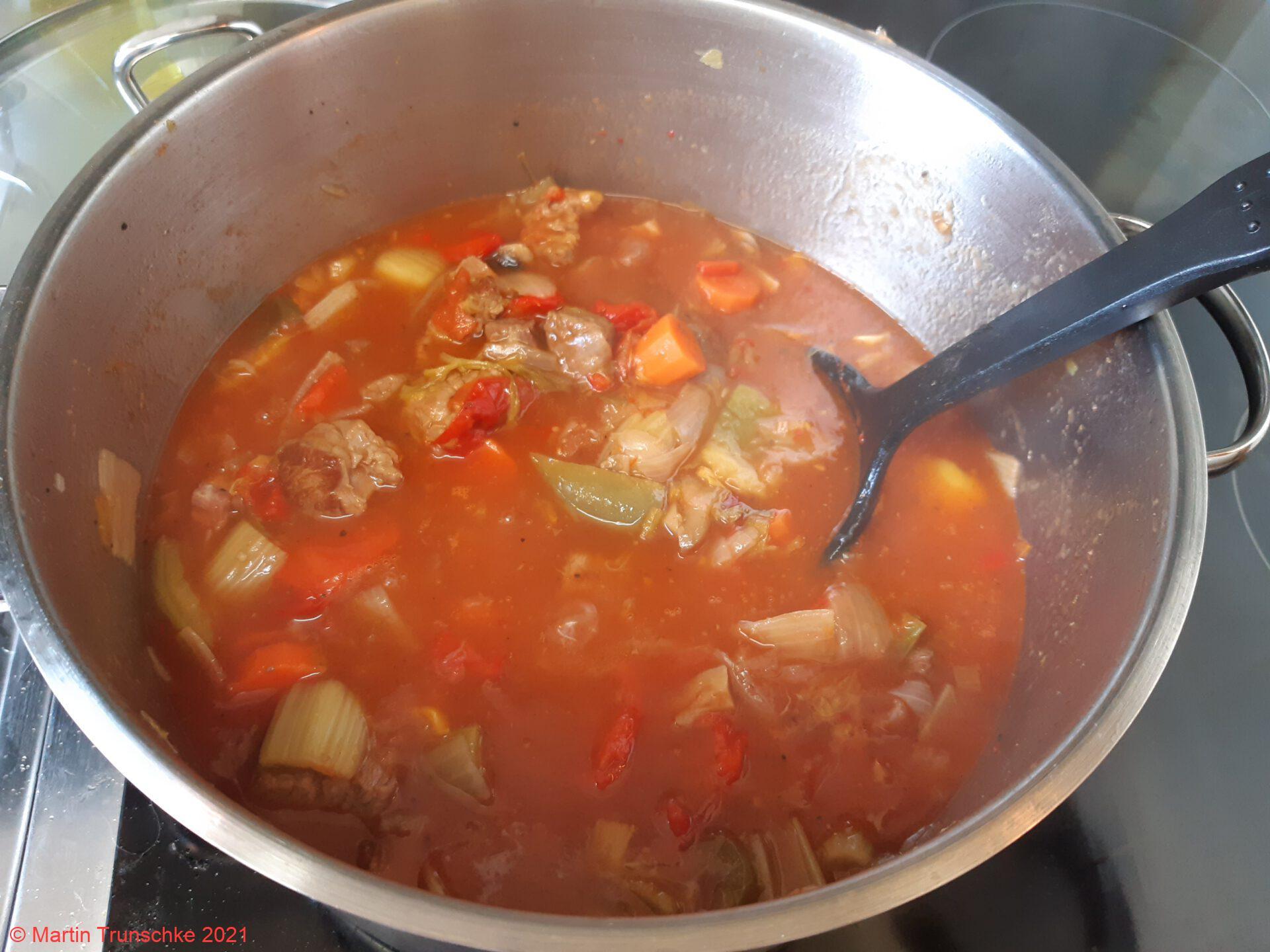 - Jetzt mit der Brühe angießen, die Pilze dazu geben und das Paprikapulver, Sambal und das Tomatenmark unterrühren. Alles einmal kurz aufkochen lassen und dann auf kleiner Flamme ca. 45 Minuten köcheln lassen. nochmals mit Pfeffer abschmecken und evt. mit Stärkemehl andicken.