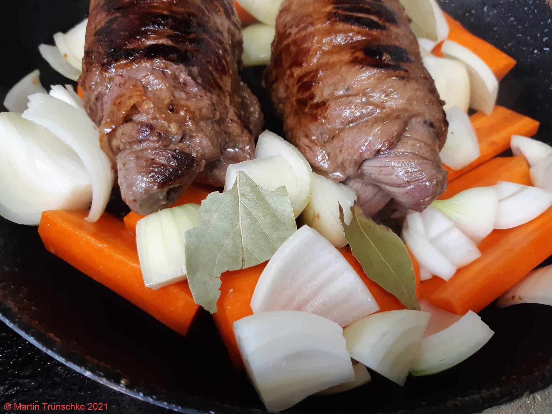 - Dann mit der hälfte der Brühe angießen und bei mittlerer Hitze in der geschlossenen Pfanne ca. 1 1/2 Stunden schmoren. Ab und zu mal die Rouladen wenden.